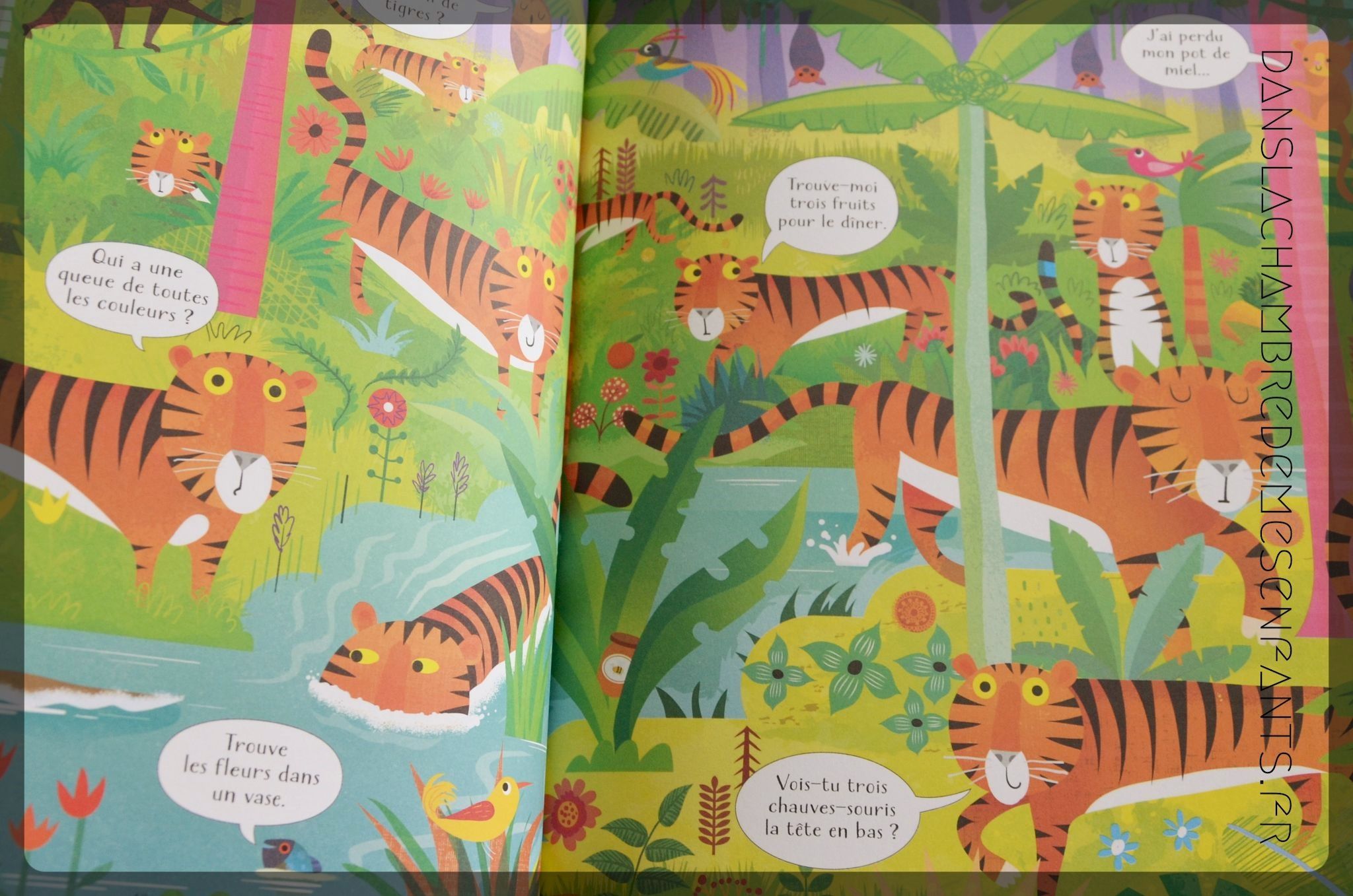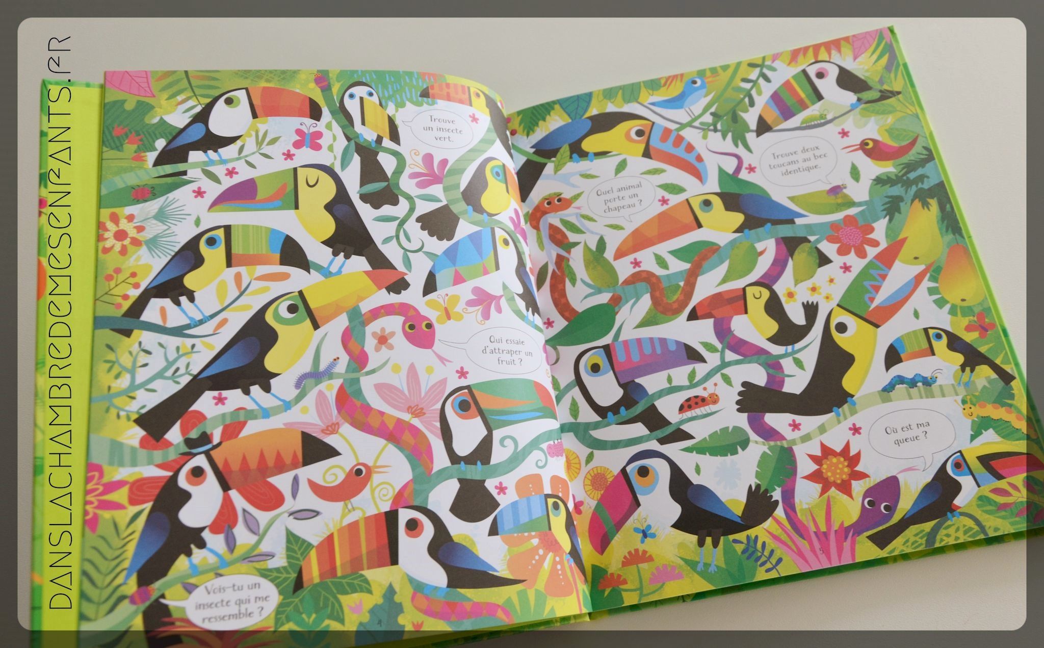 Les questions sont au nombre de 6 par scène. Elles sont toutes simples (ex : « Vois-tu un petit papillon ? ») avec souvent une notion de calcul (ex : « Combien de fourmi portent des feuilles ? », « Trouve deux toucans au bec identique »). Les détails ne manquent pas de fantaisie (ex : fourmi zébrée ou quadrillée) et le choix des animaux intéresse le lecteur (ex : le toucan, le léopard, le perroquet) qui peut commencer à se faire une idée du milieu tropical.