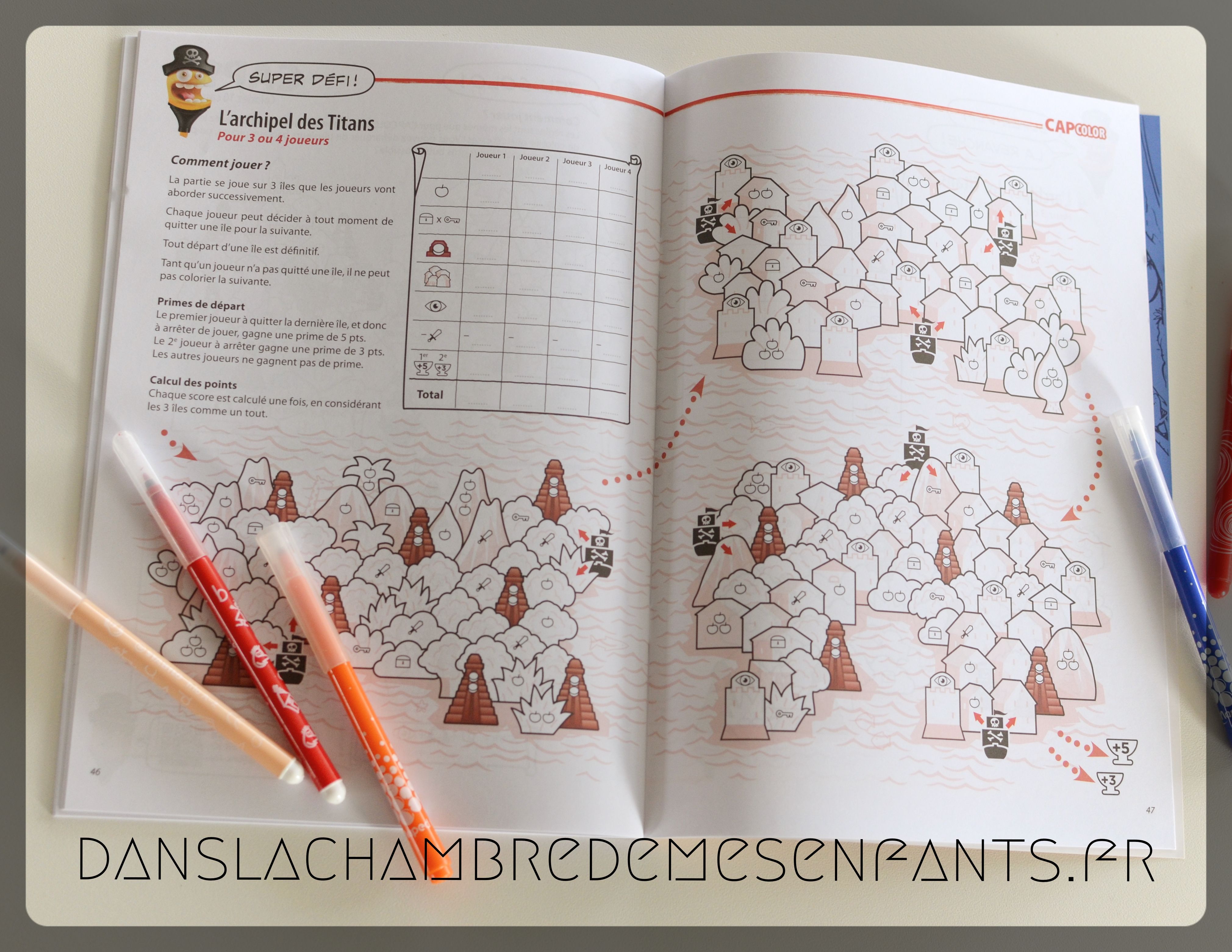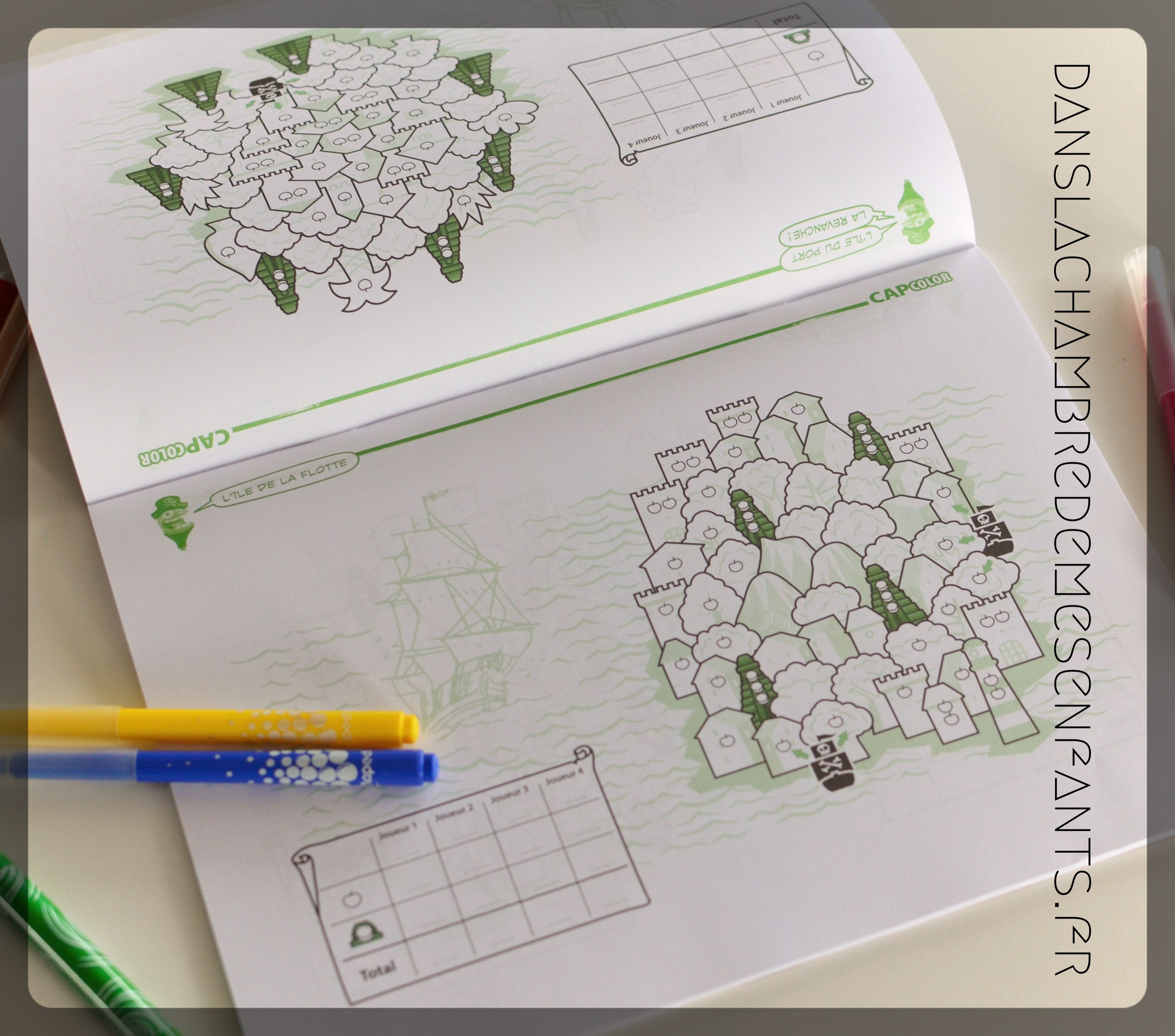 L’avis des enfants : Au début, Alex, 7 ans, craignait un cahier de coloriage. En s’y intéressant ensemble, il s’est rendu compte que ce n’est pas le cas et que les règles sont très simples. Il a très vite été pris par le jeu et il a voulu enchaîner les parties. Je me suis rendue compte qu’il comptabilisait les points au fur et à mesure de la partie, mais il faut dire qu’Alex adore les chiffres. Il a compris rapidement des variantes à l’embarquement pour plus de stratégie et il a tenu à colorier plusieurs cases groupées pour faire des territoires bien à lui un vrai conquérant. Effectivement, la règle du jeu évolue en cours d’ouvrage pour distribuer des points selon l’étendu de territoire. C’est vraiment une question de stratégie et de logique. Il adore et il a embarqué son père pour agrémenter encore plus le jeu à 3.