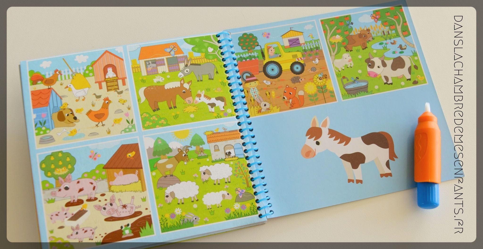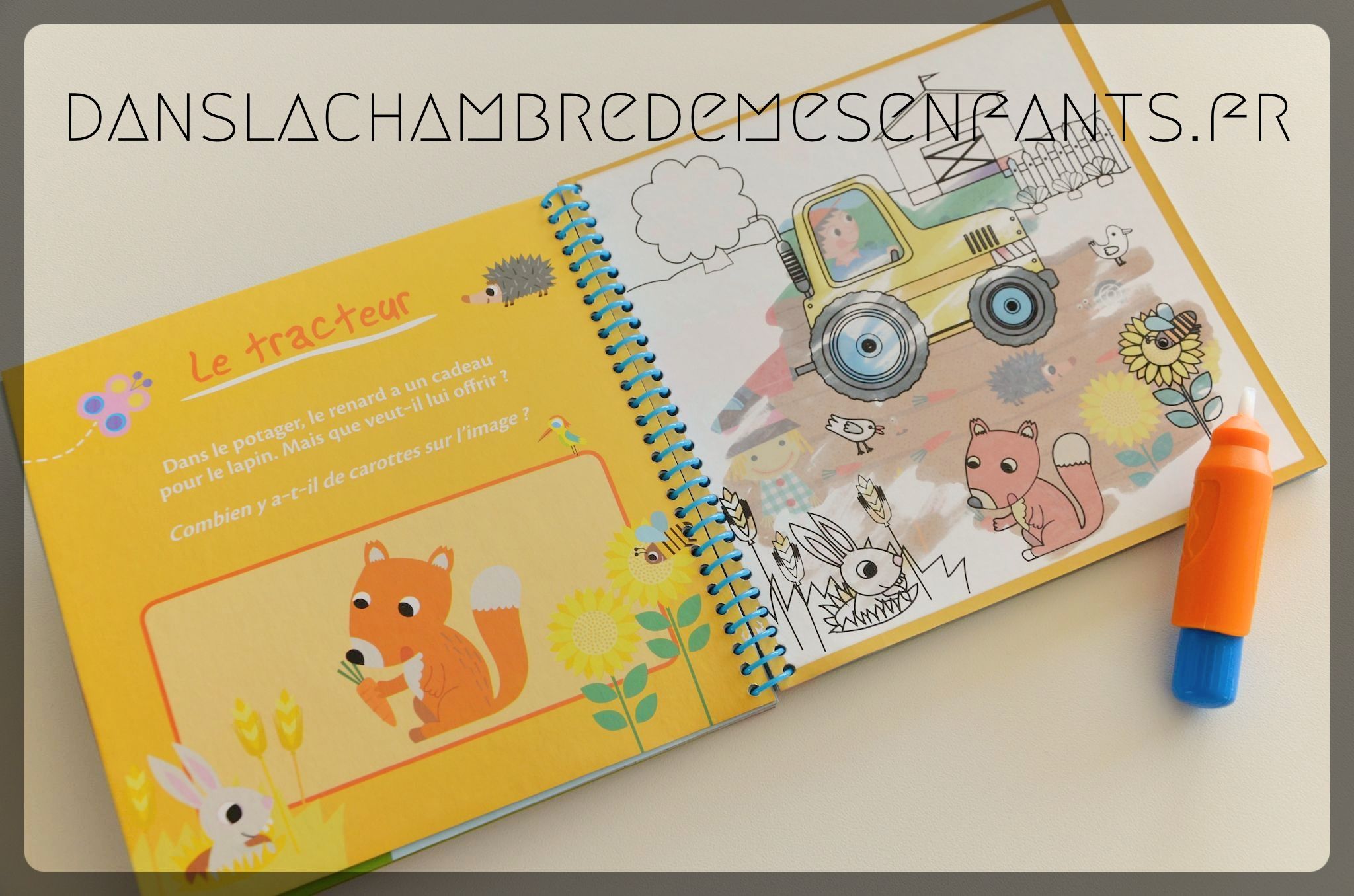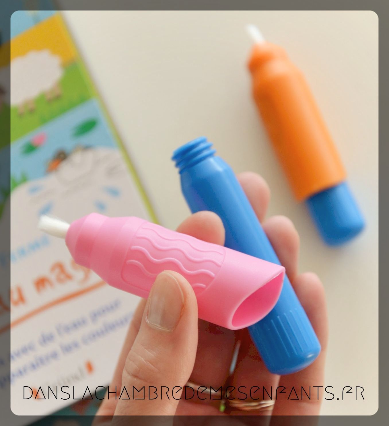 et amusantsgrâce au pinceau à réservoir d’eau rangé dans sa trousse attachée à la reliure. Ce gros coup de cœur a tellement plu qu’il ne reste pas longtemps rangé et qu’il a été chaudement recommandé. - Emi continue, même si elle s’améliore, à appuyer avec le bord en plastique du feutre faisant parfois des rayures et ajoutant tellement d’eau sur la même page qu’elle se courbe un peu à la longue. De plus, elle s’amuse parfois à dévisser le réservoir et à le refixer mais pas correctement. Je vous rassure, le peu d’eau qu’il contient ne crée pas de souci.