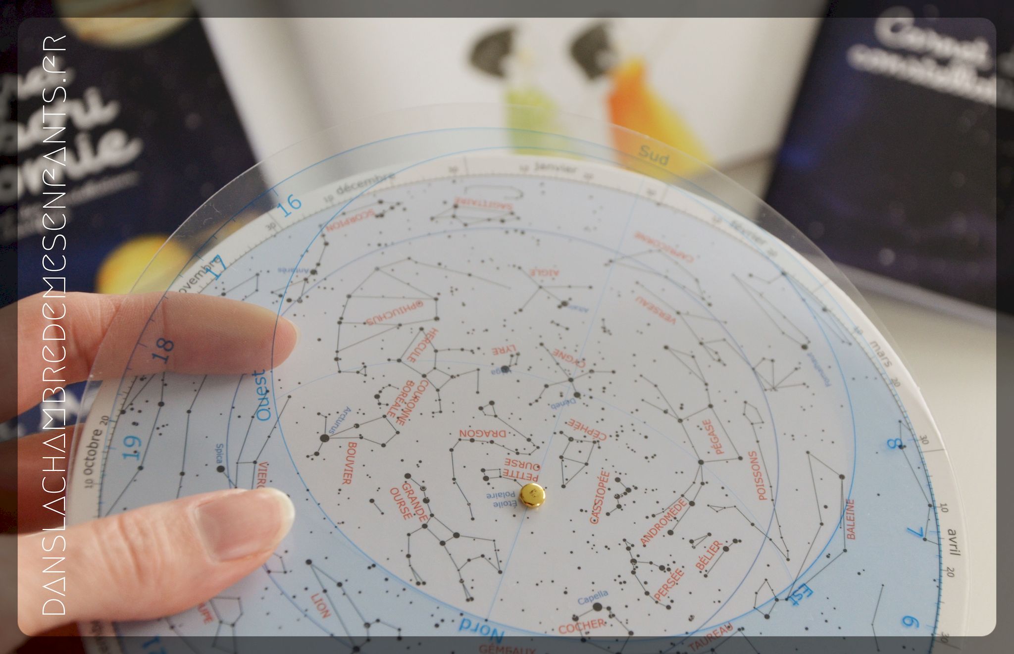 Pour se repérer, la carte du ciel est représentée sur la carte sphérique que l’on peut faire évoluer selon le calendrier à l’aide de son double volet transparent rotatif.