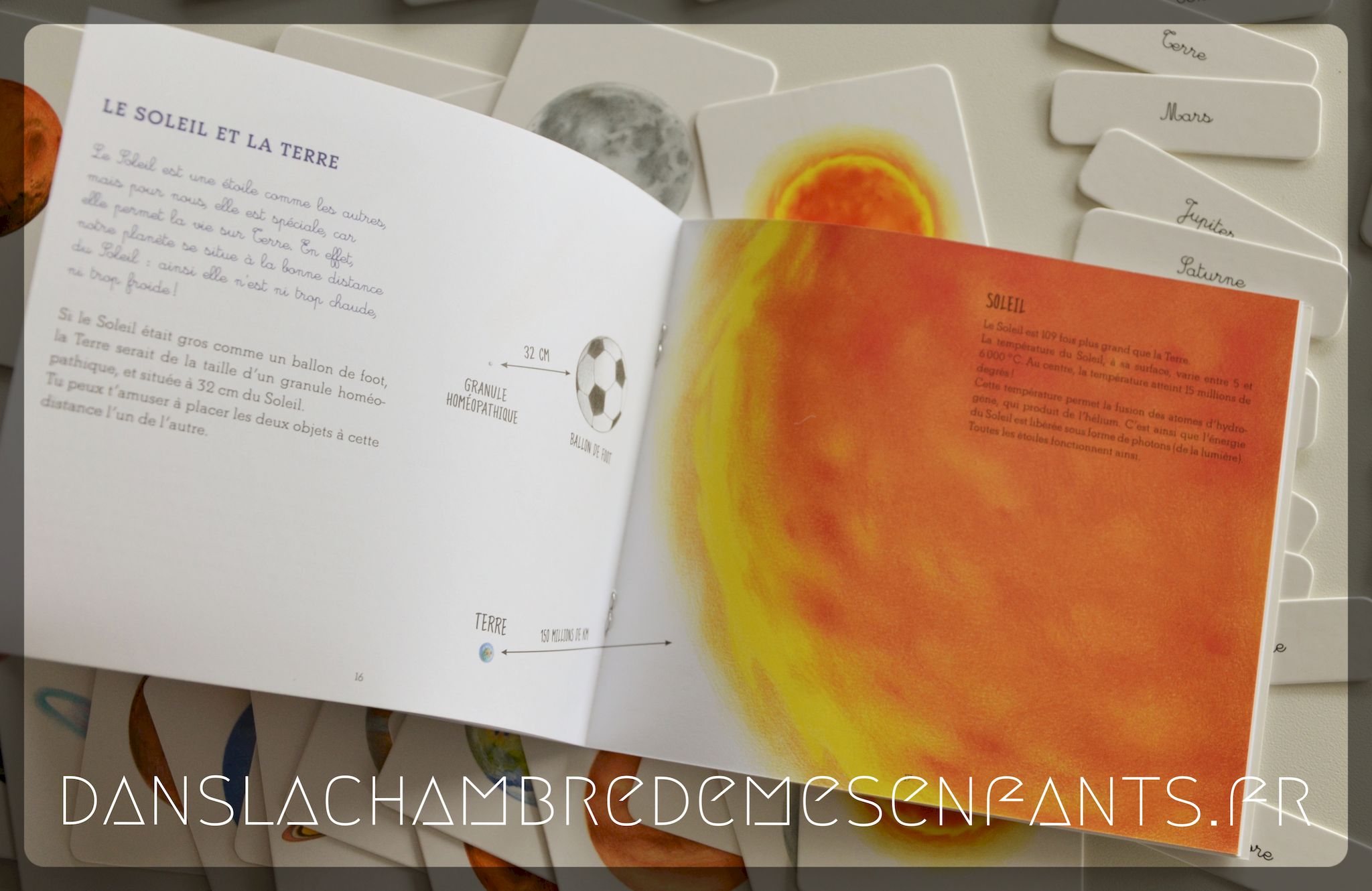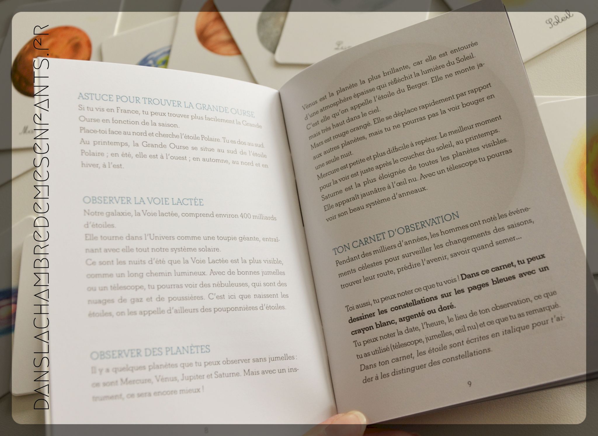 Le livret expose le mode opératoire et les enseignements de base illustrés (principaux corps célestes, la force de gravité…) accompagnés d’ateliers simples (ex : la force centrifuge). Ce carnet, à lui seul, est déjà très intéressant. Les planètes sont aussi présentées sur des fiches cartonnées : l’enfant peut les manipuler en parcourant le livret ou quand il le souhaite pour se familiariser. Le jeu complet comprend des cartes illustrées avec légende et des cartes séparant illustrations et texte (nom, catégorie… avec explication au verso). Cela permet de jouer avec et mieux les identifier.