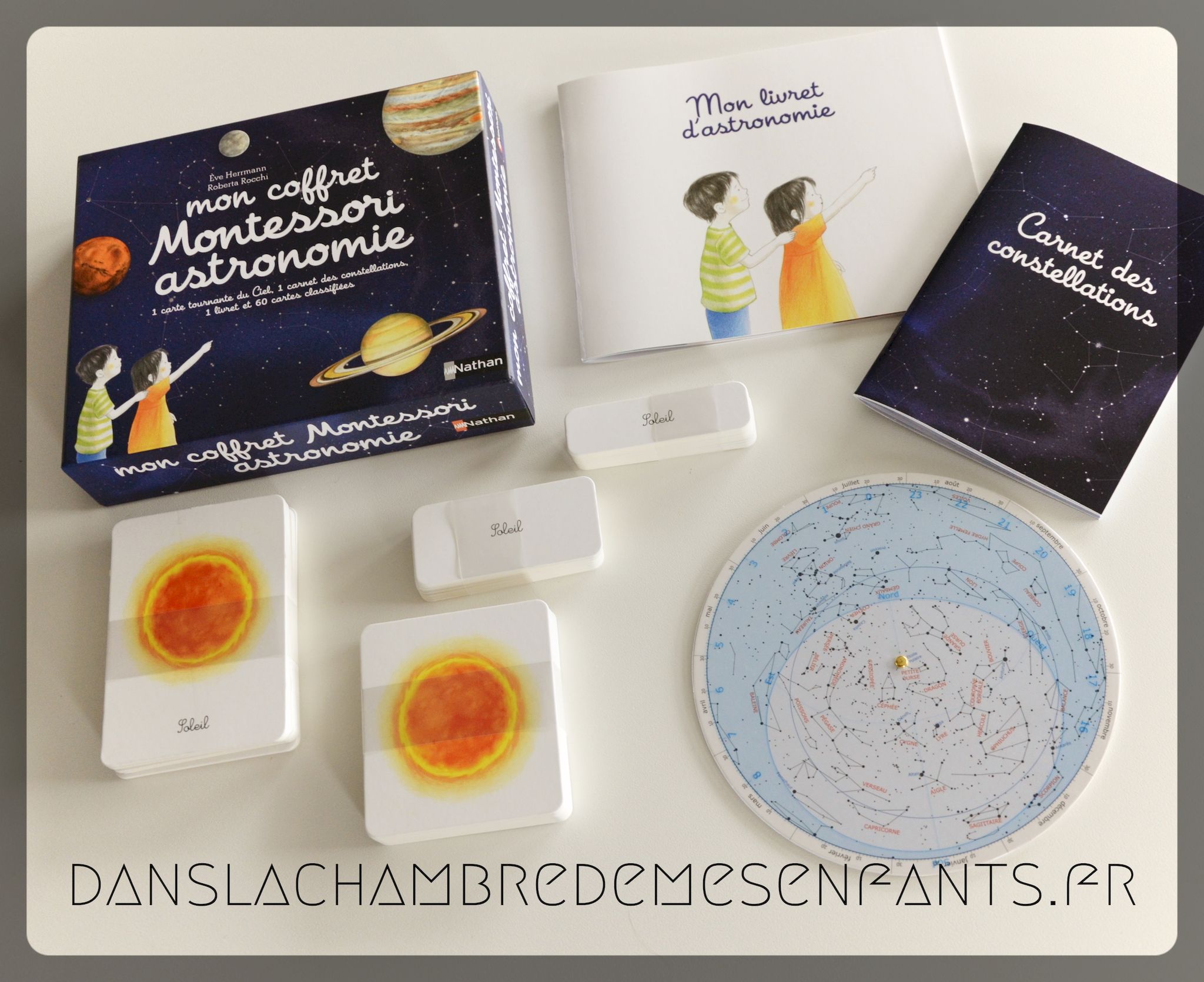 On retrouve un coffret découverte Montessori cette fois-ci sur le passionnant sujet de l’astronomie avec :