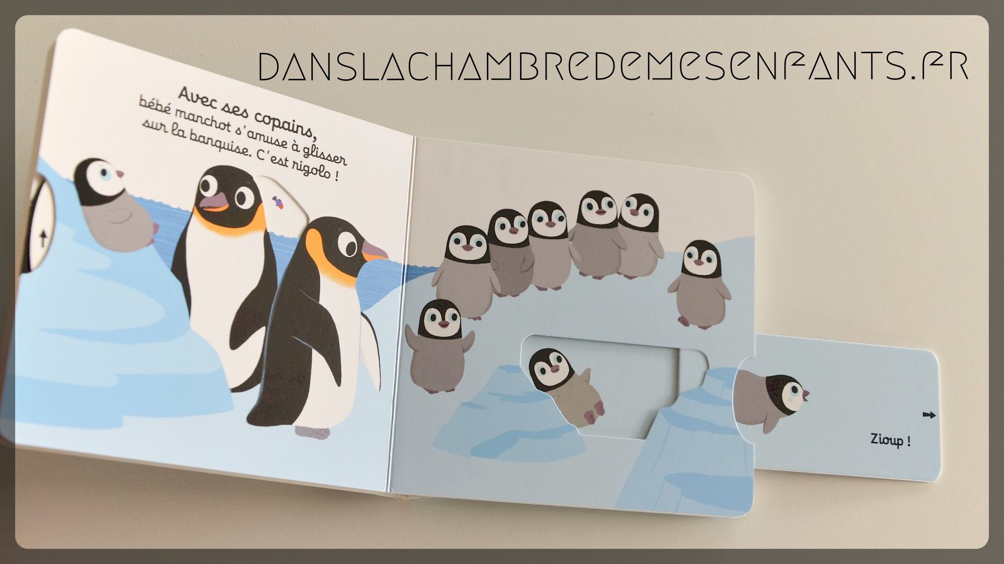 « Bonjour bébé manchot ! » présente des parents manchots et leur petit œuf. Voilà bébé manchot parmi eux après avoir cassé la coquille. Suivent le moment du repas et des jeux sur la banquise avant un câlin.