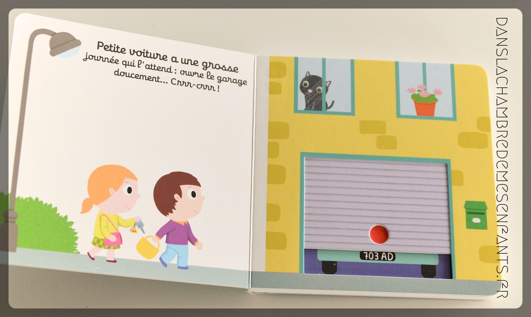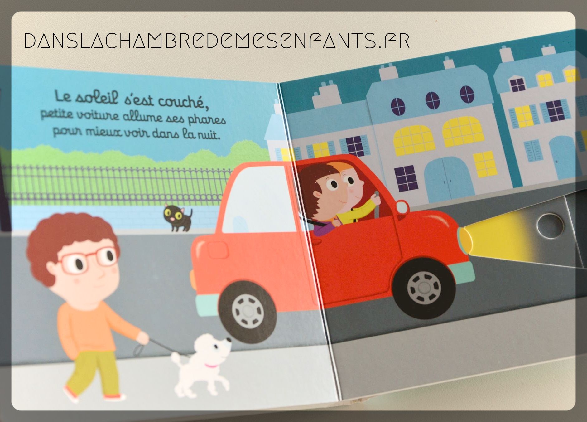 « Bonjour petite voiture ! » a un sujet moins proche de la nature mais tout aussi intéressant pour les petits passionnés : la journée commence en sortant la voiture du garage jusqu’à la nuit tombée (l’éclairage de la route avec les phares doit plaire à coup sûr !).
