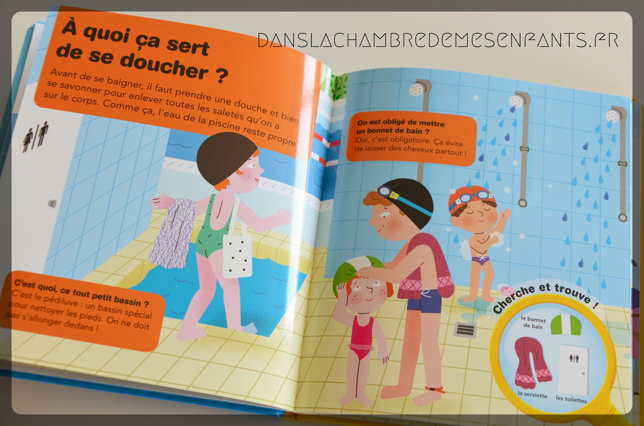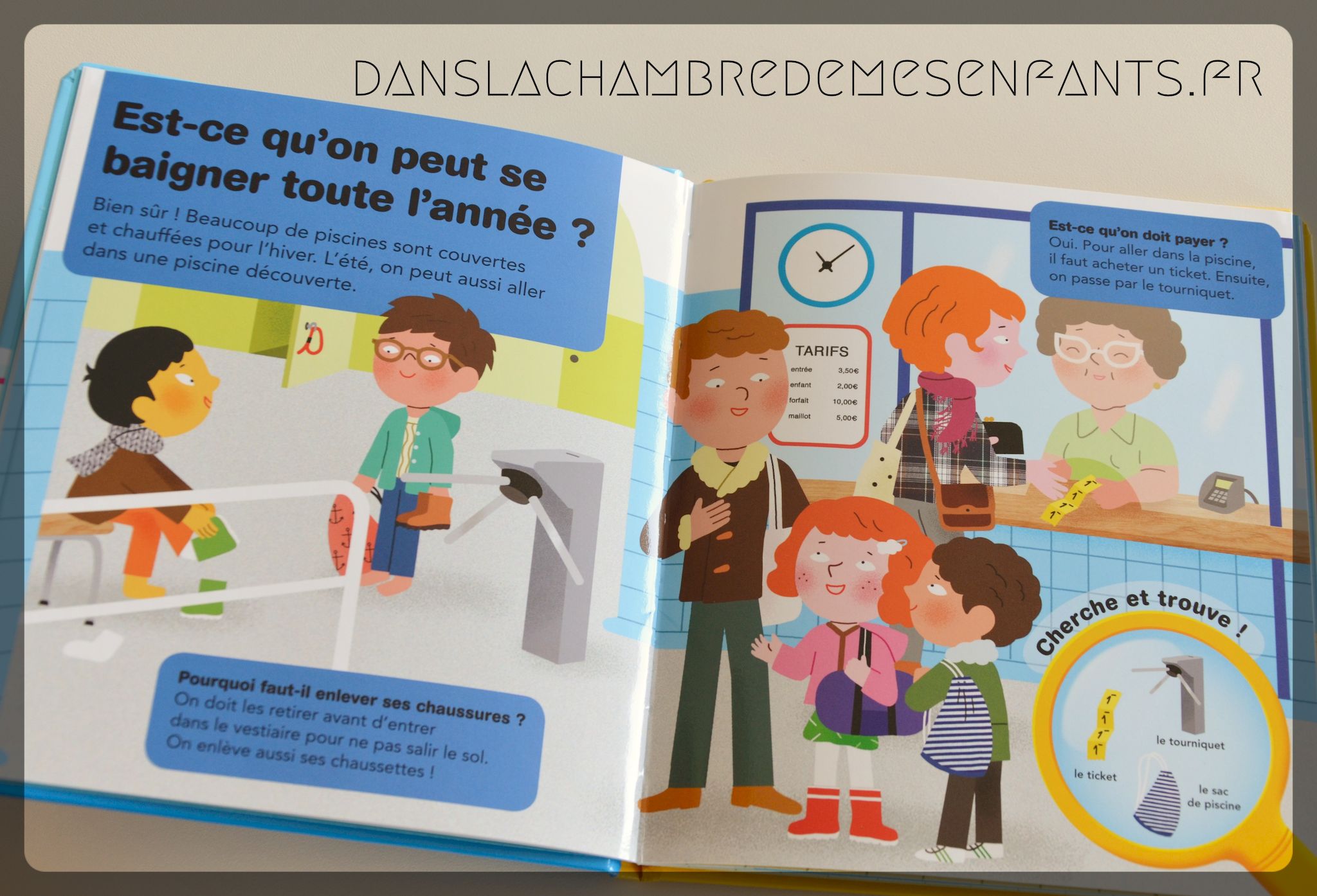 « A la piscine » présente ce lieu (le temps d’ouverture, les règles d’hygiène…), les vestiaires (l’utilité des casiers…), les douches (l’utilité du pédiluve…), les bassins (la température de l’eau…), la baignade (les brassards…), etc.