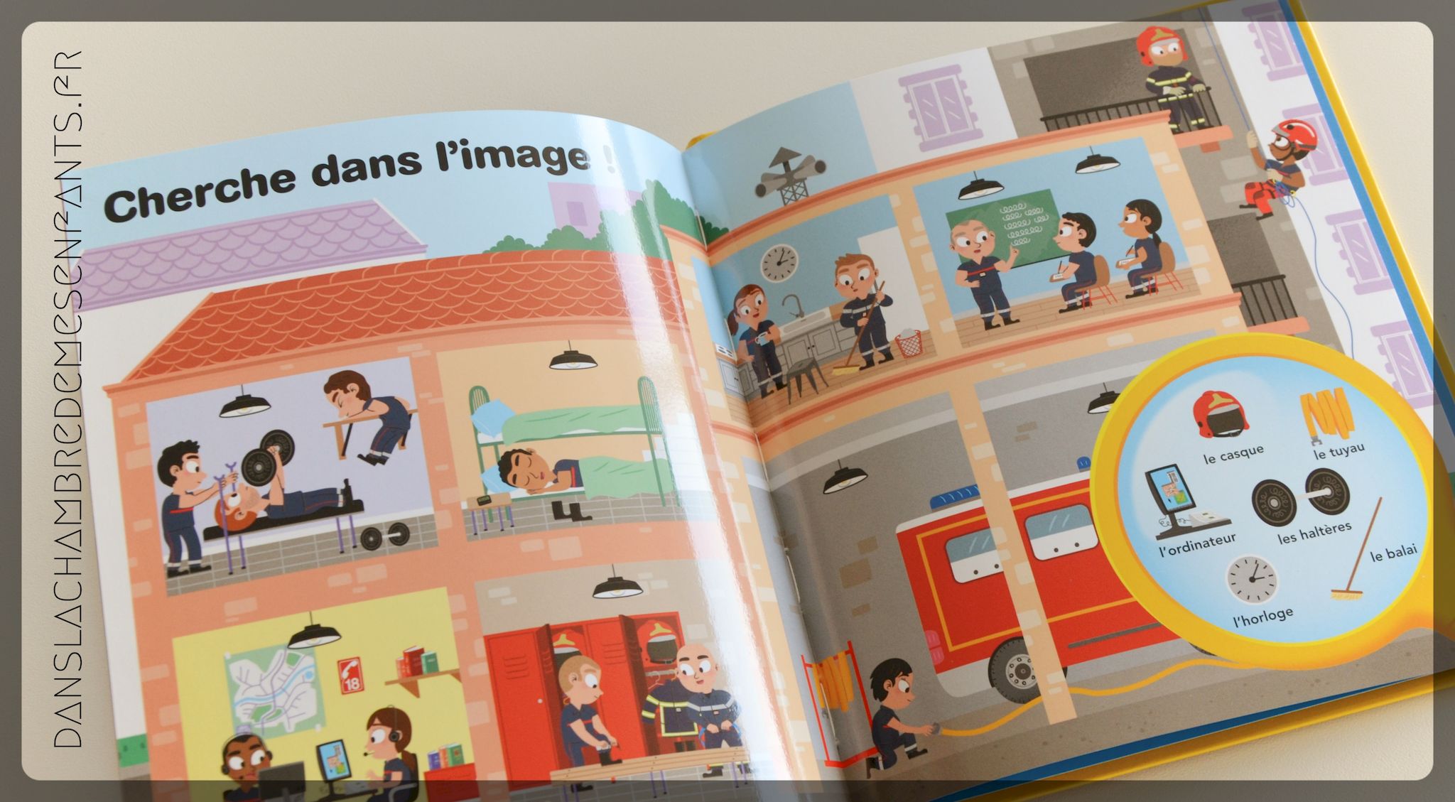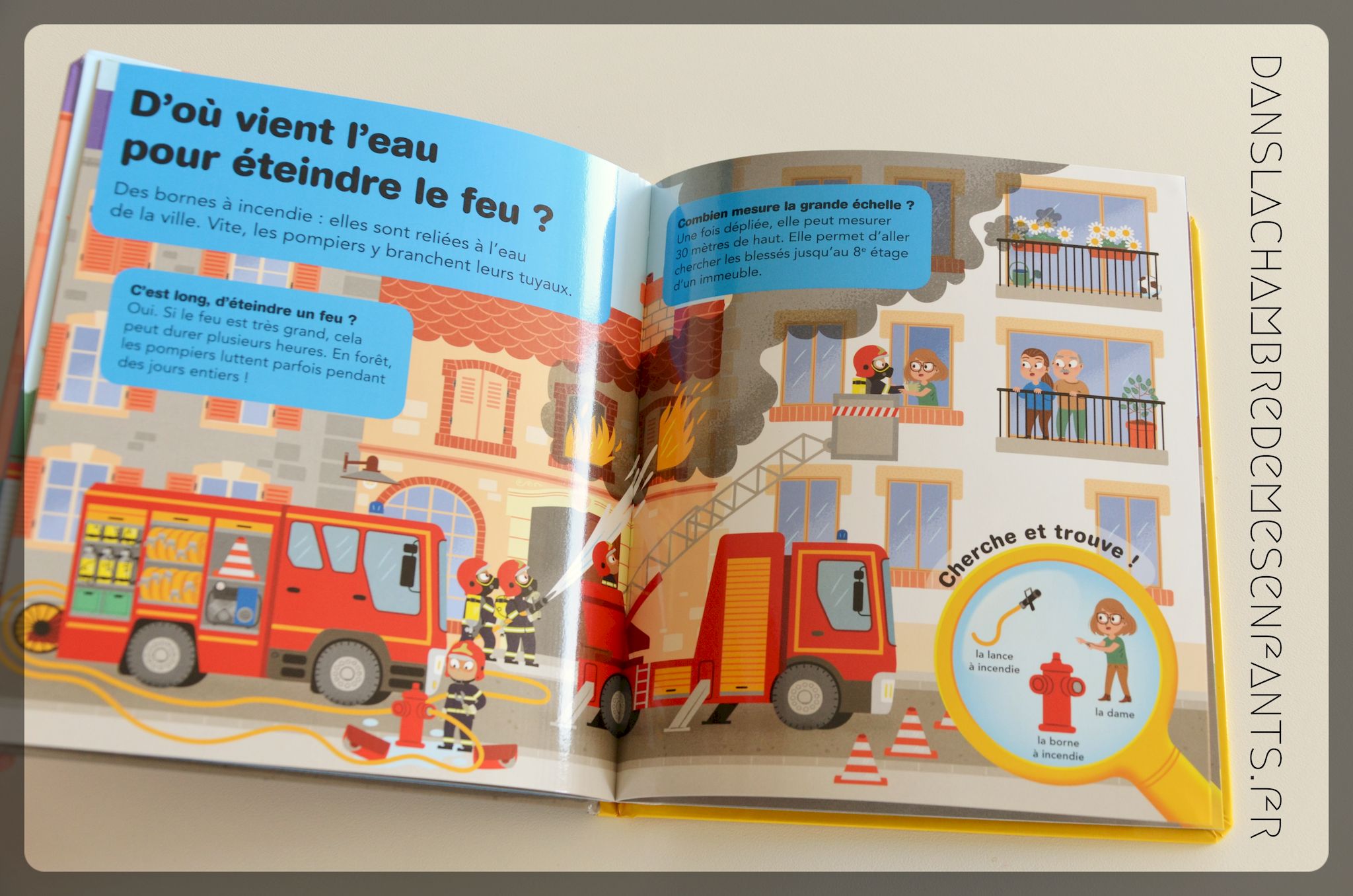 « Au feu, les pompiers » présente la caserne et ses occupants, leur intervention, leur uniforme, le camion (le gyrophare, la sirène…), etc.