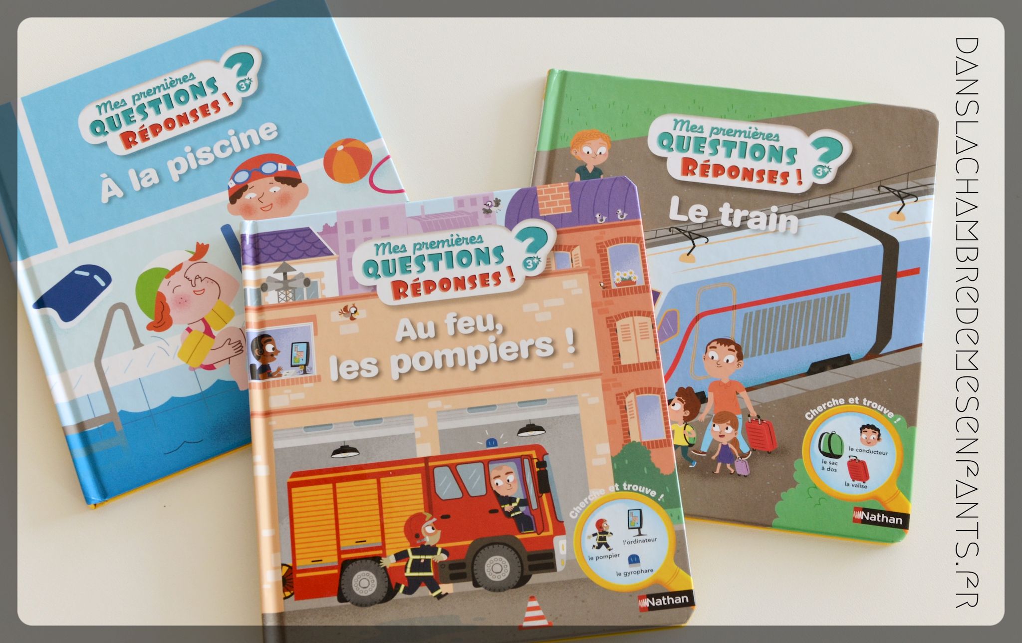 « A la piscine » – « Au feu, les pompiers » – « Le train » (Mes premières questions réponses)
