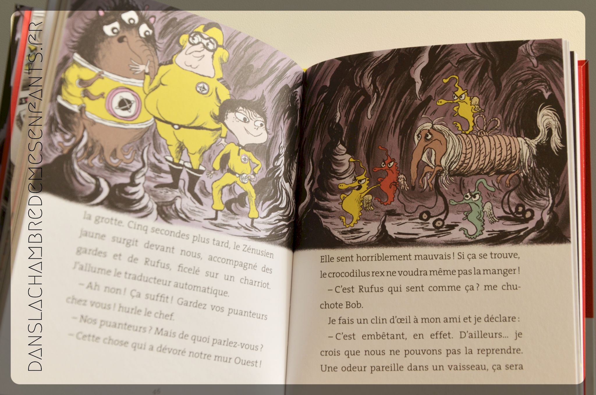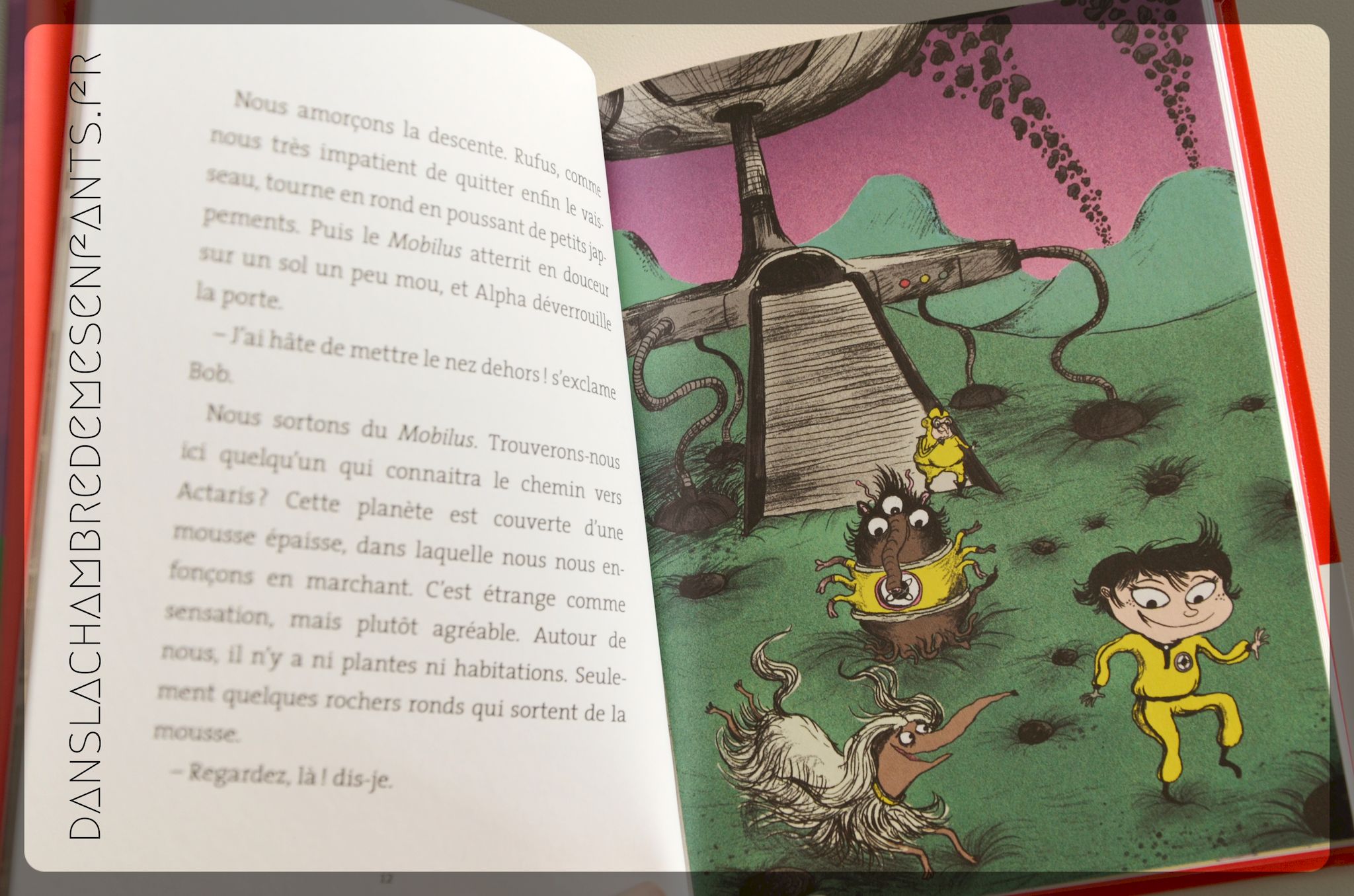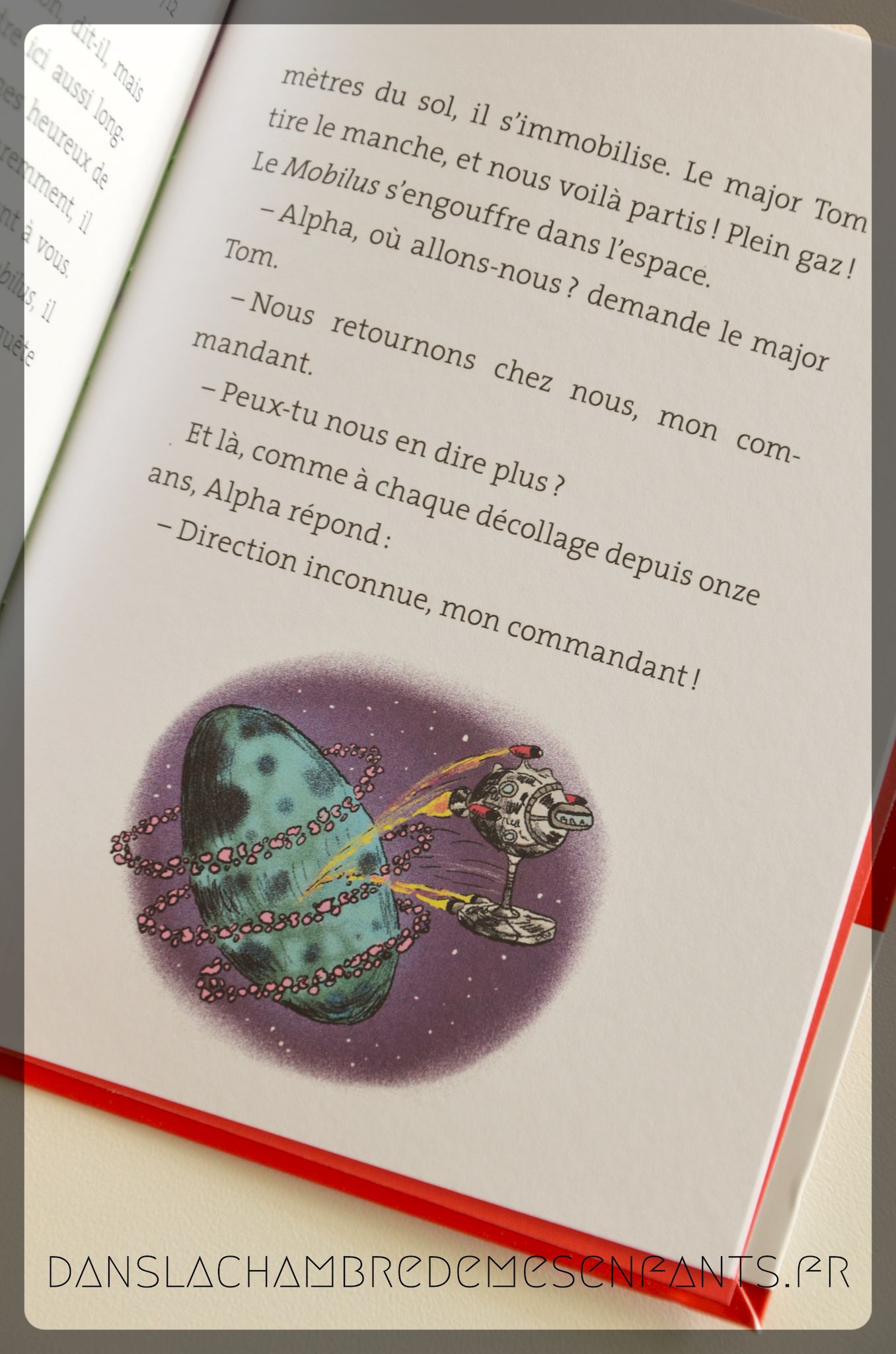 Le format est accueillant, régulièrement illustré, et une introduction en image présente l’équipe du major Tom, embarquée dans le Mobilus, un vaisseau perdu dans l’espace. Je ne suis pas particulièrement fan des illustrations mais je reconnais qu’elles correspondent au style de la lecture. Le texte est développé tout en étant simple et organisé en quelques chapitres. Le vocabulaire est assez élaboré mais reste accessible.
