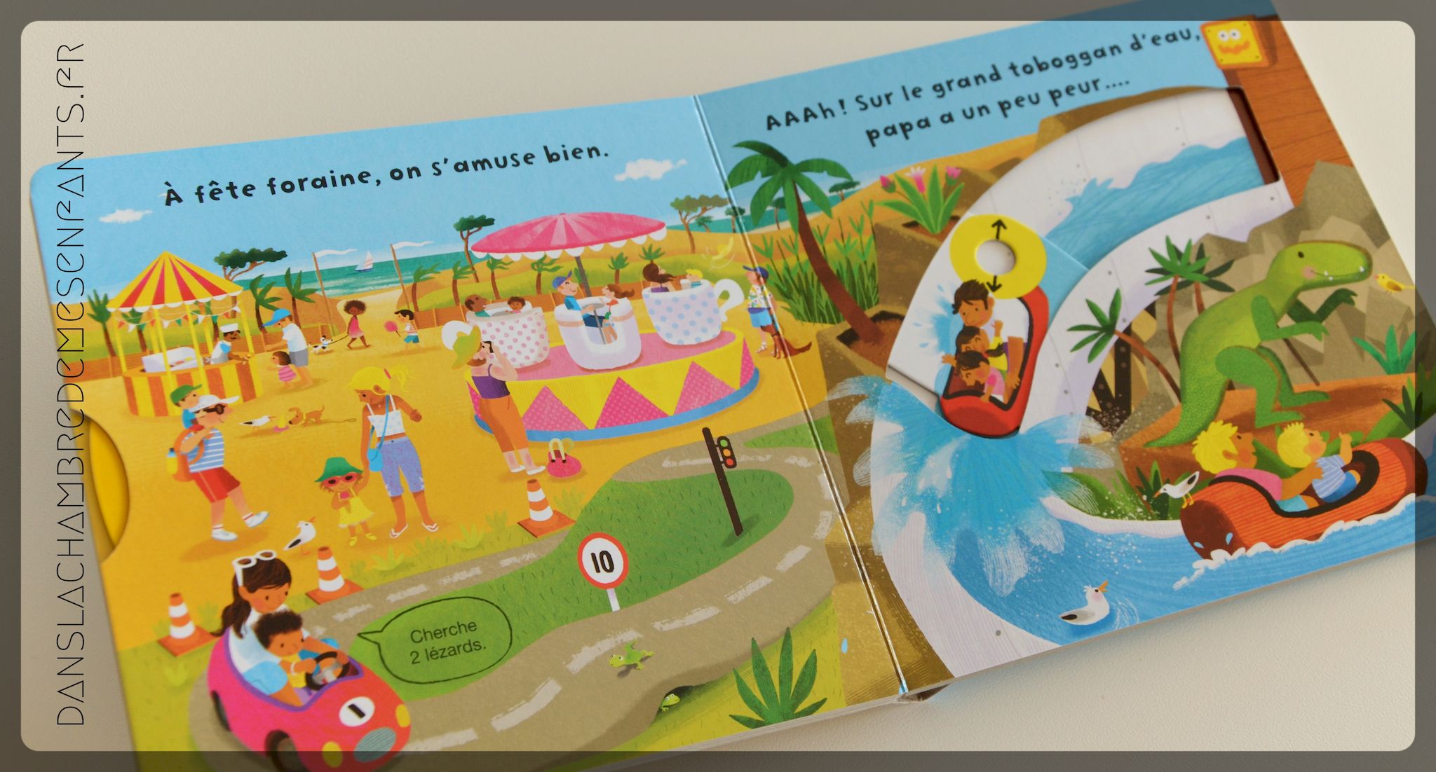 Très colorés, ces ouvrages sont régulièrement animés et ce dès la couverture. A l’aide de boutons poussoirs, de tirettes et de roulettes les scènes prennent forme et les enfants participent ainsi tout en travaillant leur dextérité. Pour parfaire leur observation, les illustrations, commentées, comprennent des bulles pour que les enfants s’intéressent aussi aux scènes secondaires par des petits jeux (ex : « Où est ma bouée ? », « Compte les seaux »…) ainsi qu’un oiseau ou une abeille à retrouver dans chaque double page.