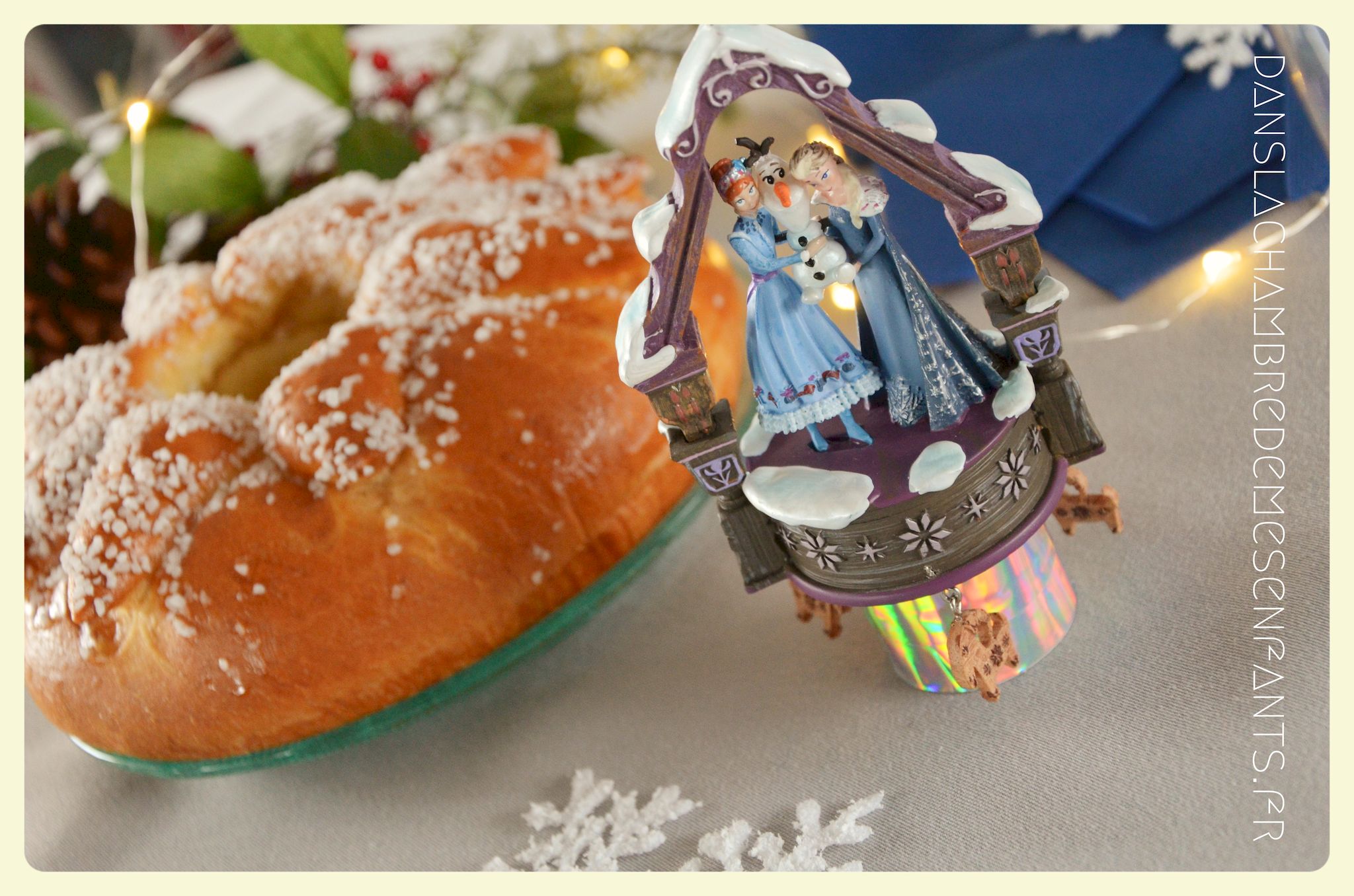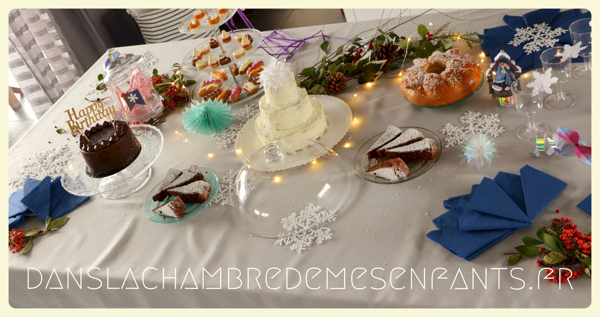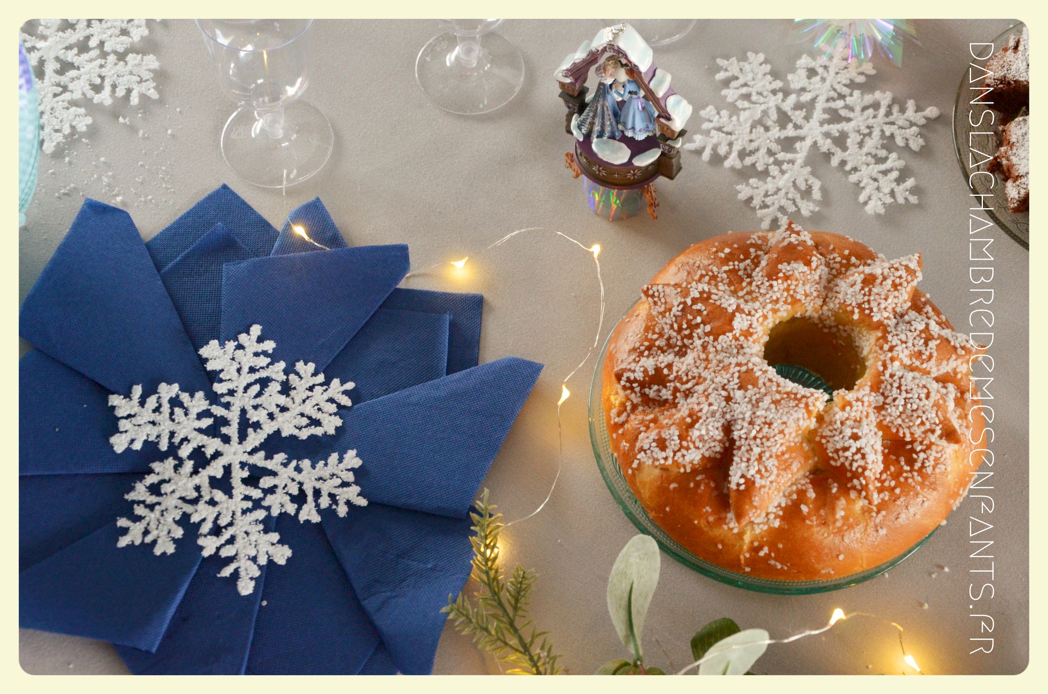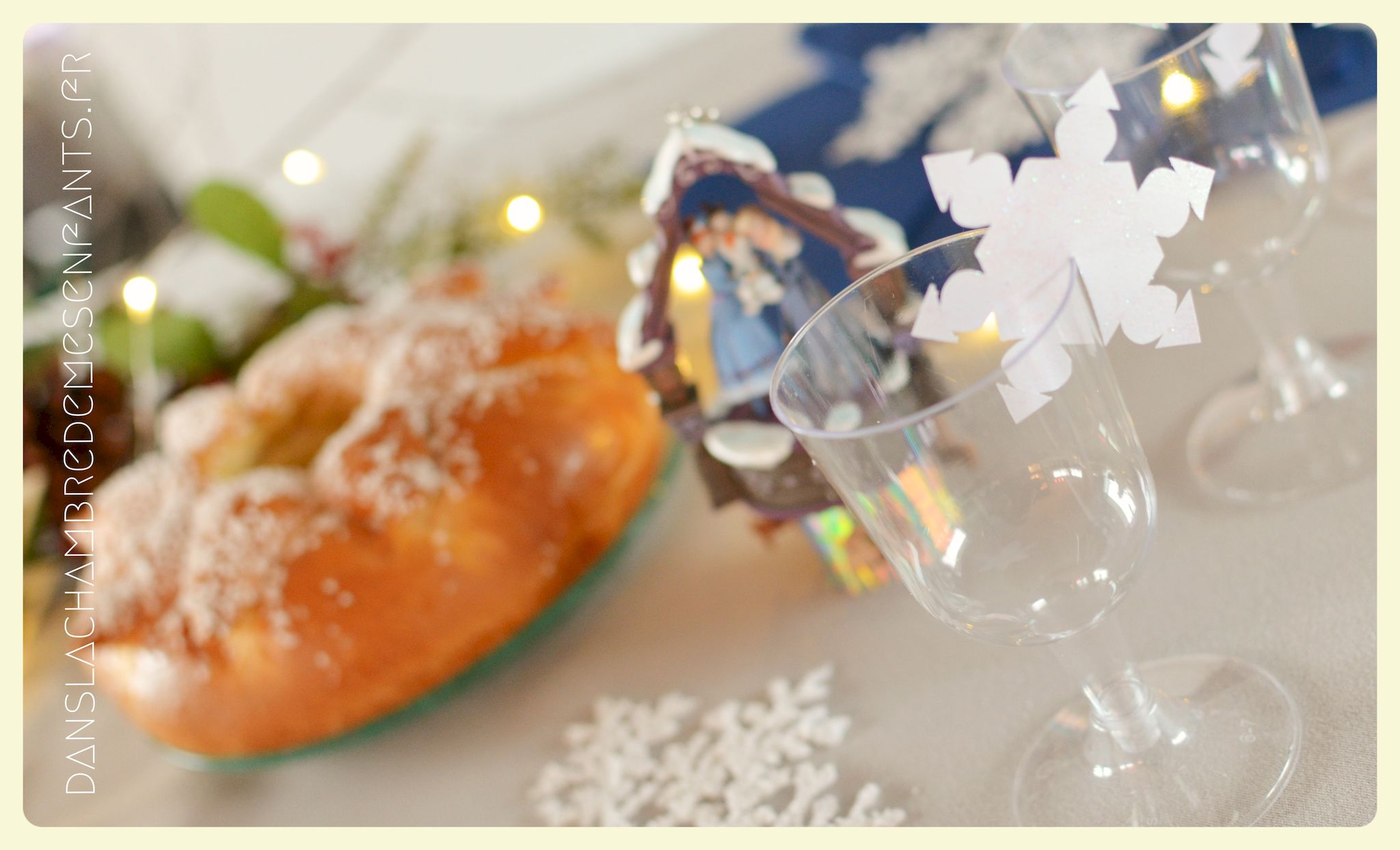 Afin de faire venir l’hiver dans notre salon, avec un côté féérique à la hauteur d’une princesse devenue reine !, j’ai imaginé ce décor, je l’avoue, en très peu de temps… Etre mère, c’est souvent vivre deux vies en une alors le temps est difficile à gérer, surtout à la sortie de période de fêtes (certains détails en témoignent, ex : le drapeau de la « une » de l’article était un brouillon que j’ai placé en dernière minute sans pouvoir l’ajuster suffisamment).