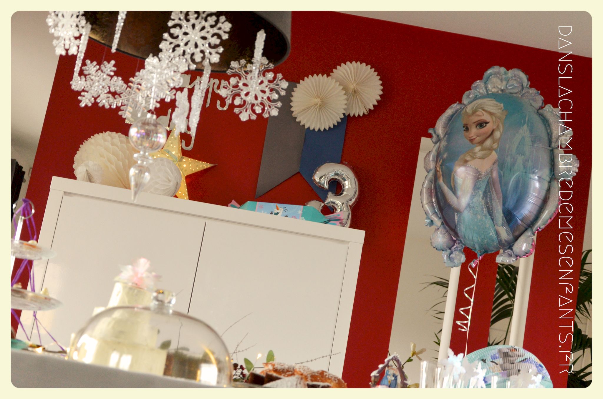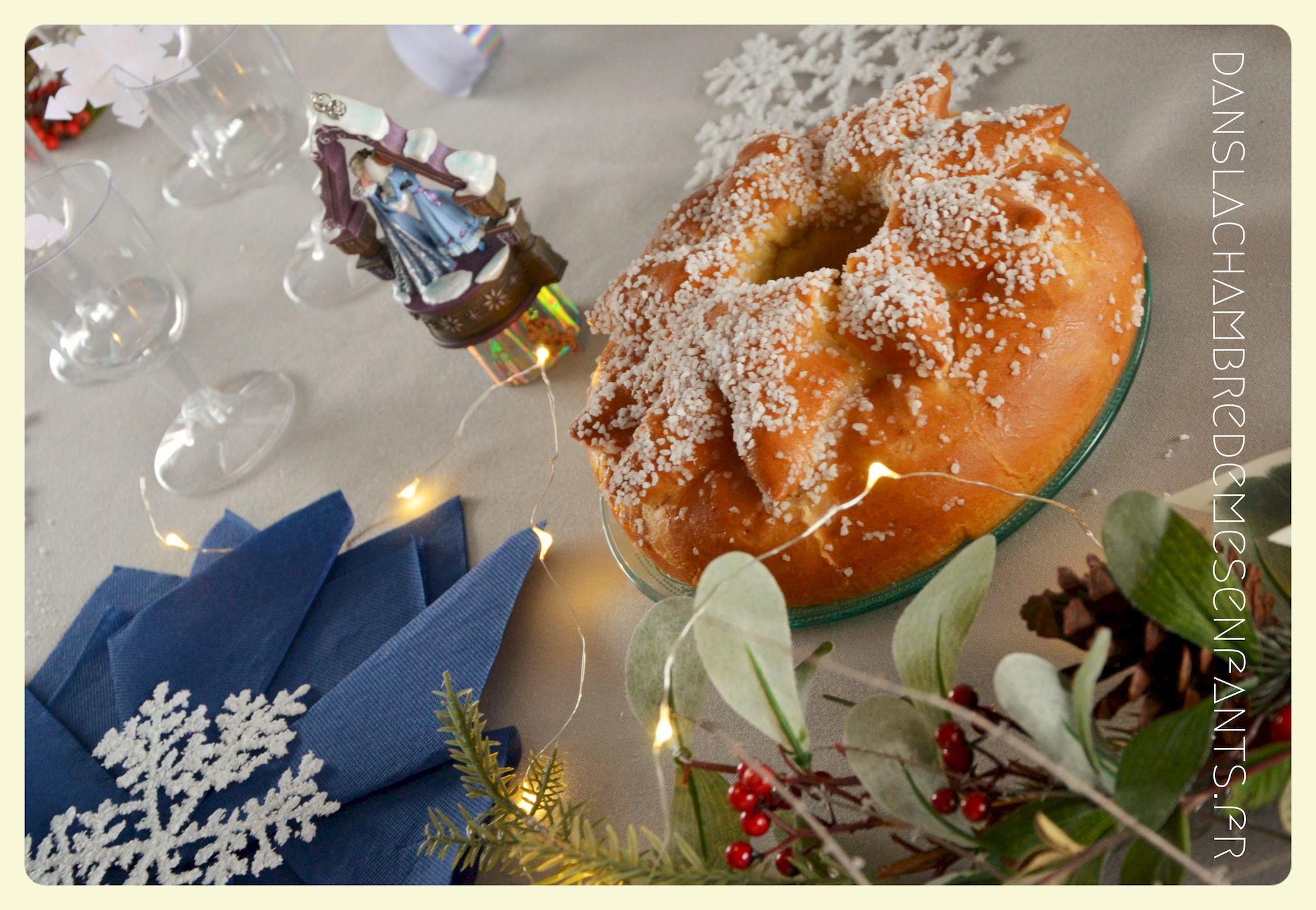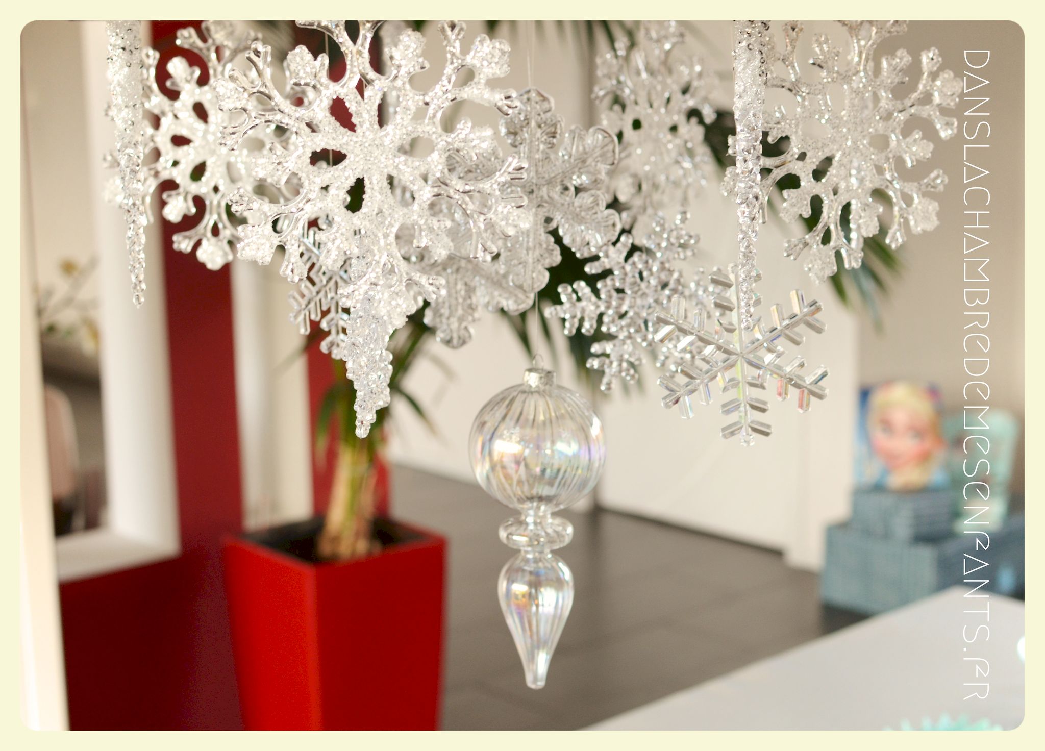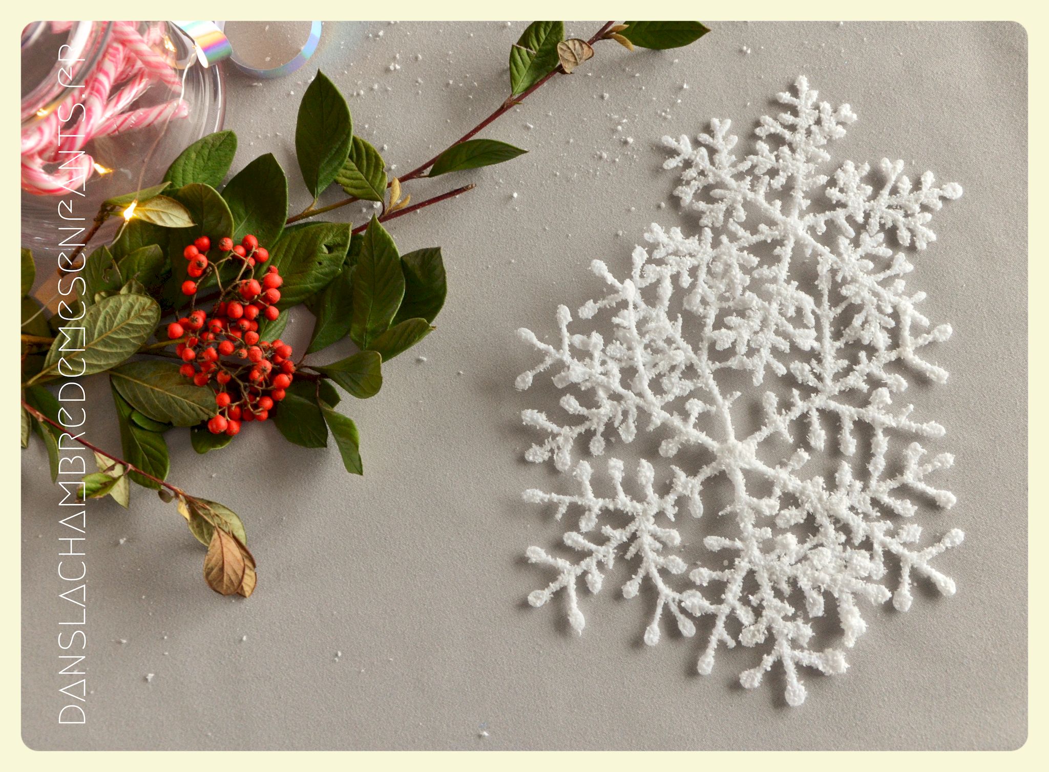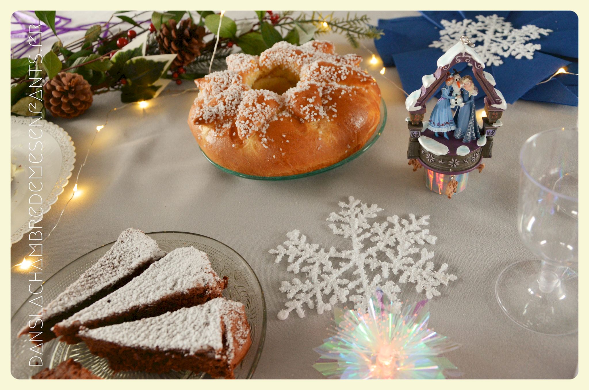 Afin de faire venir l’hiver dans notre salon, avec un côté féérique à la hauteur d’une princesse devenue reine !, j’ai imaginé ce décor, je l’avoue, en très peu de temps… Etre mère, c’est souvent vivre deux vies en une alors le temps est difficile à gérer, surtout à la sortie de période de fêtes (certains détails en témoignent, ex : le drapeau de la « une » de l’article était un brouillon que j’ai placé en dernière minute sans pouvoir l’ajuster suffisamment).