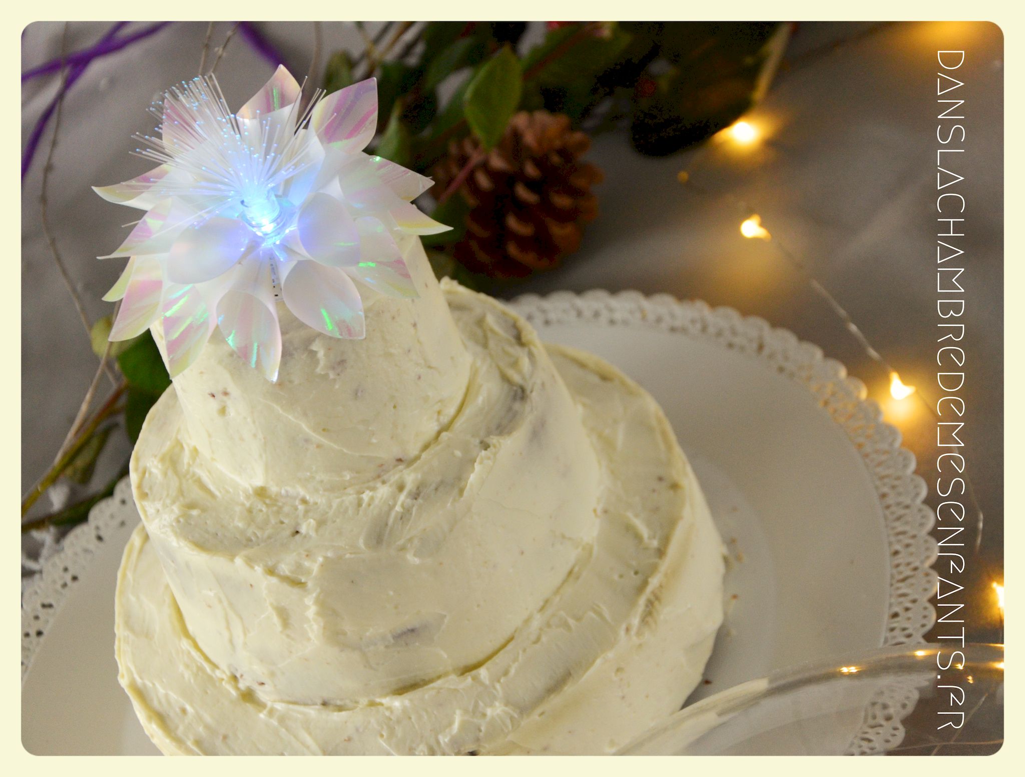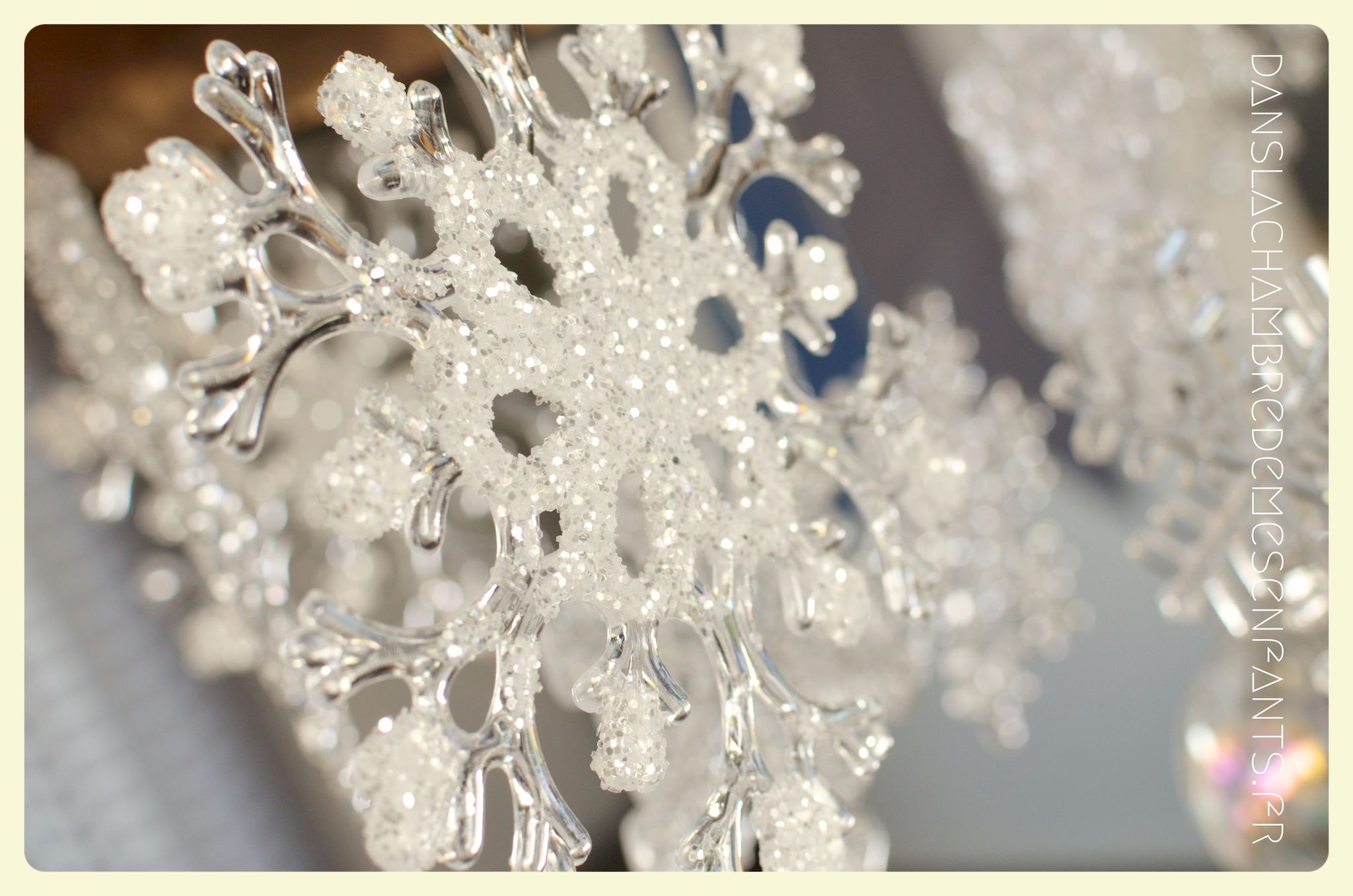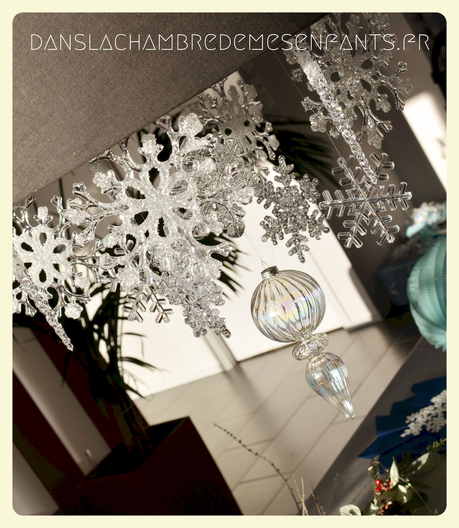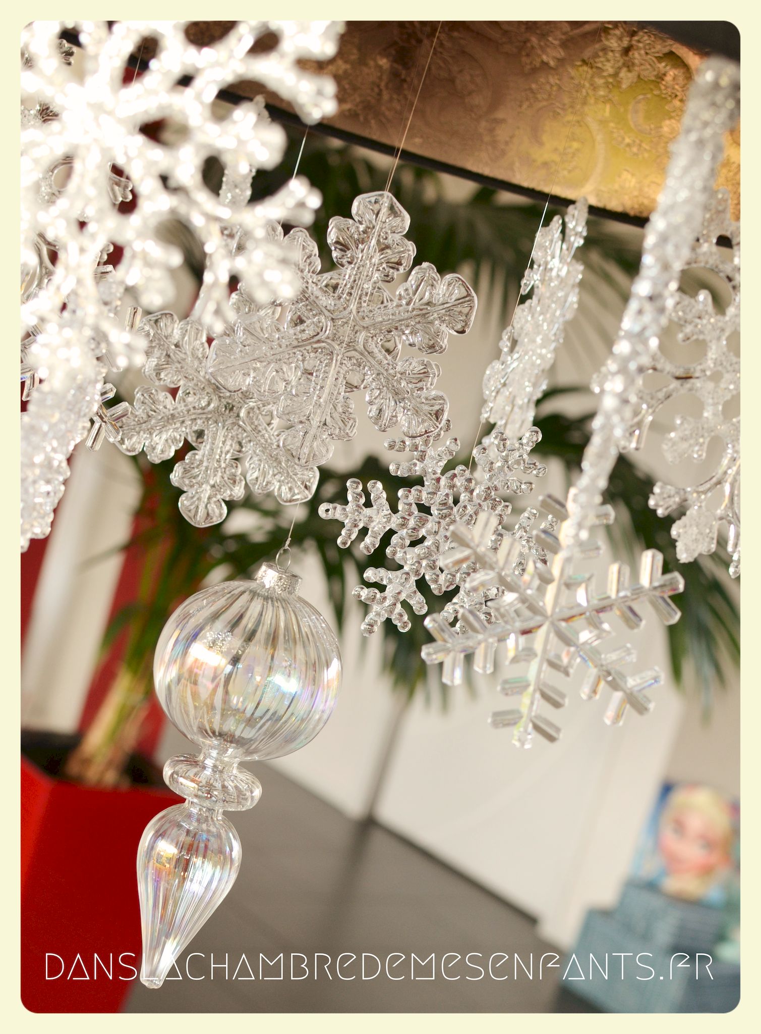 Afin de faire venir l’hiver dans notre salon, avec un côté féérique à la hauteur d’une princesse devenue reine !, j’ai imaginé ce décor, je l’avoue, en très peu de temps… Etre mère, c’est souvent vivre deux vies en une alors le temps est difficile à gérer, surtout à la sortie de période de fêtes (certains détails en témoignent, ex : le drapeau de la « une » de l’article était un brouillon que j’ai placé en dernière minute sans pouvoir l’ajuster suffisamment).