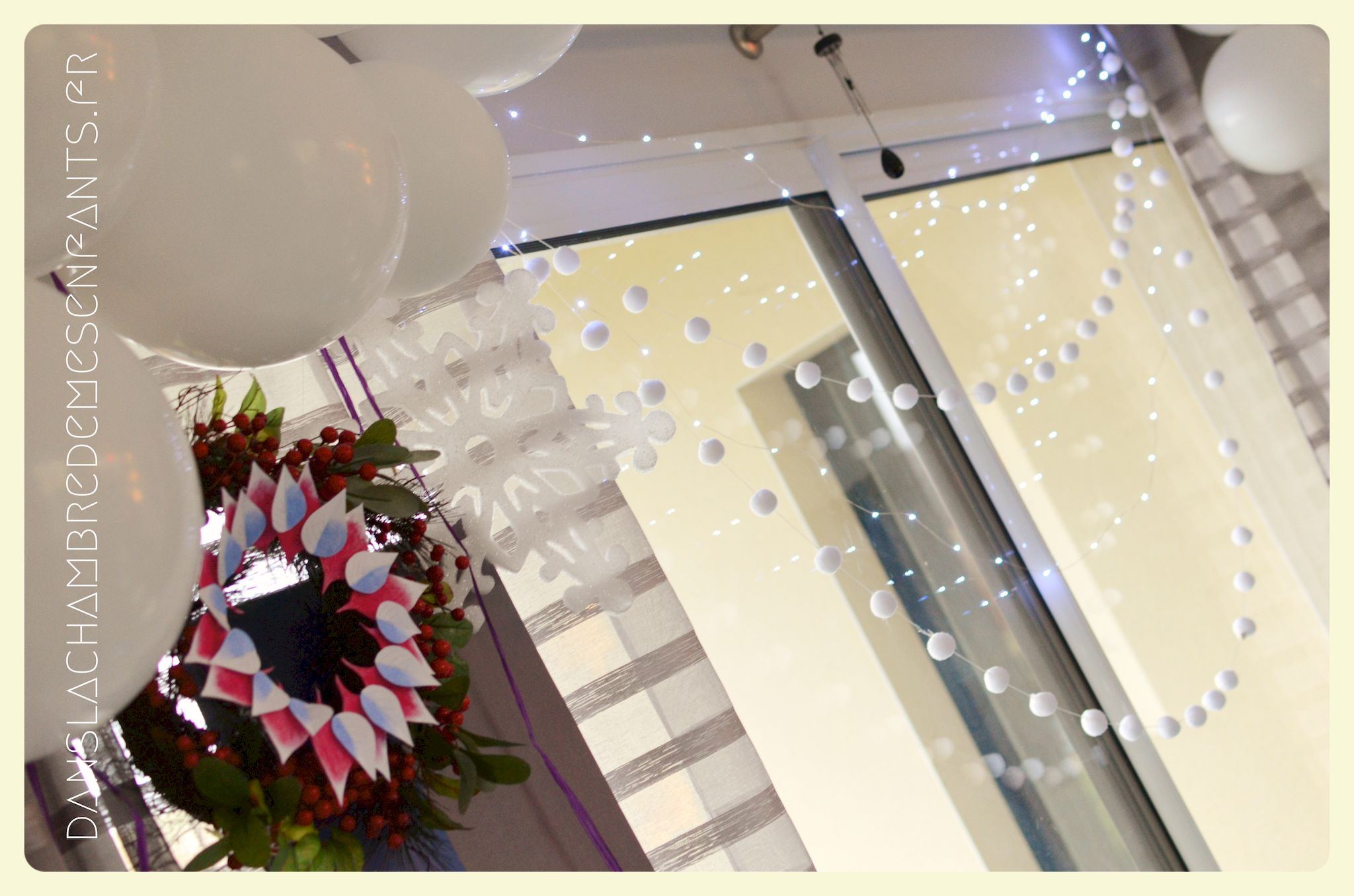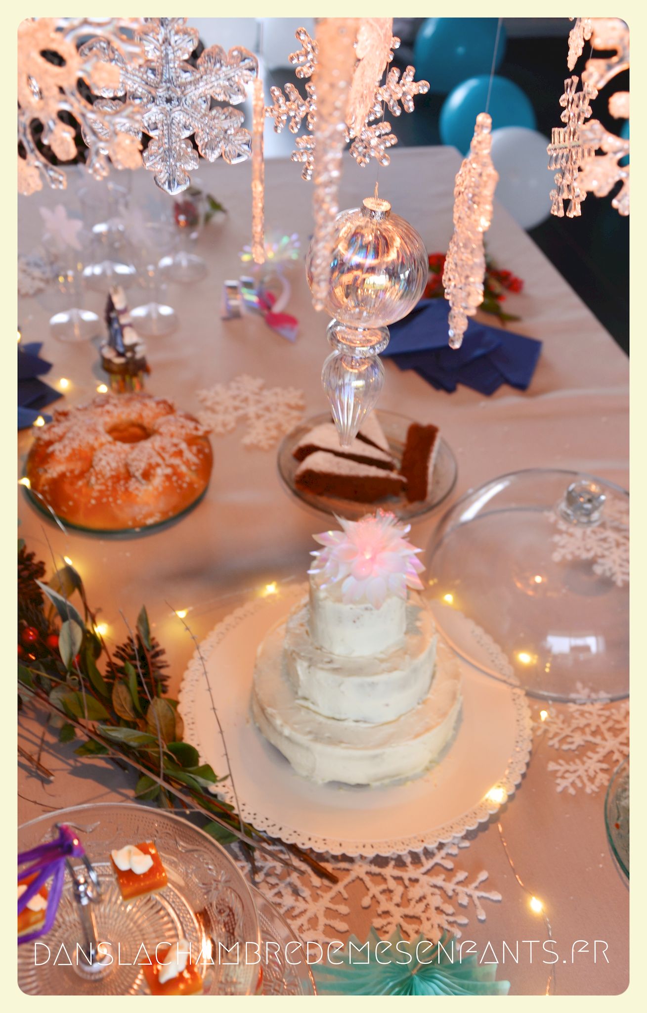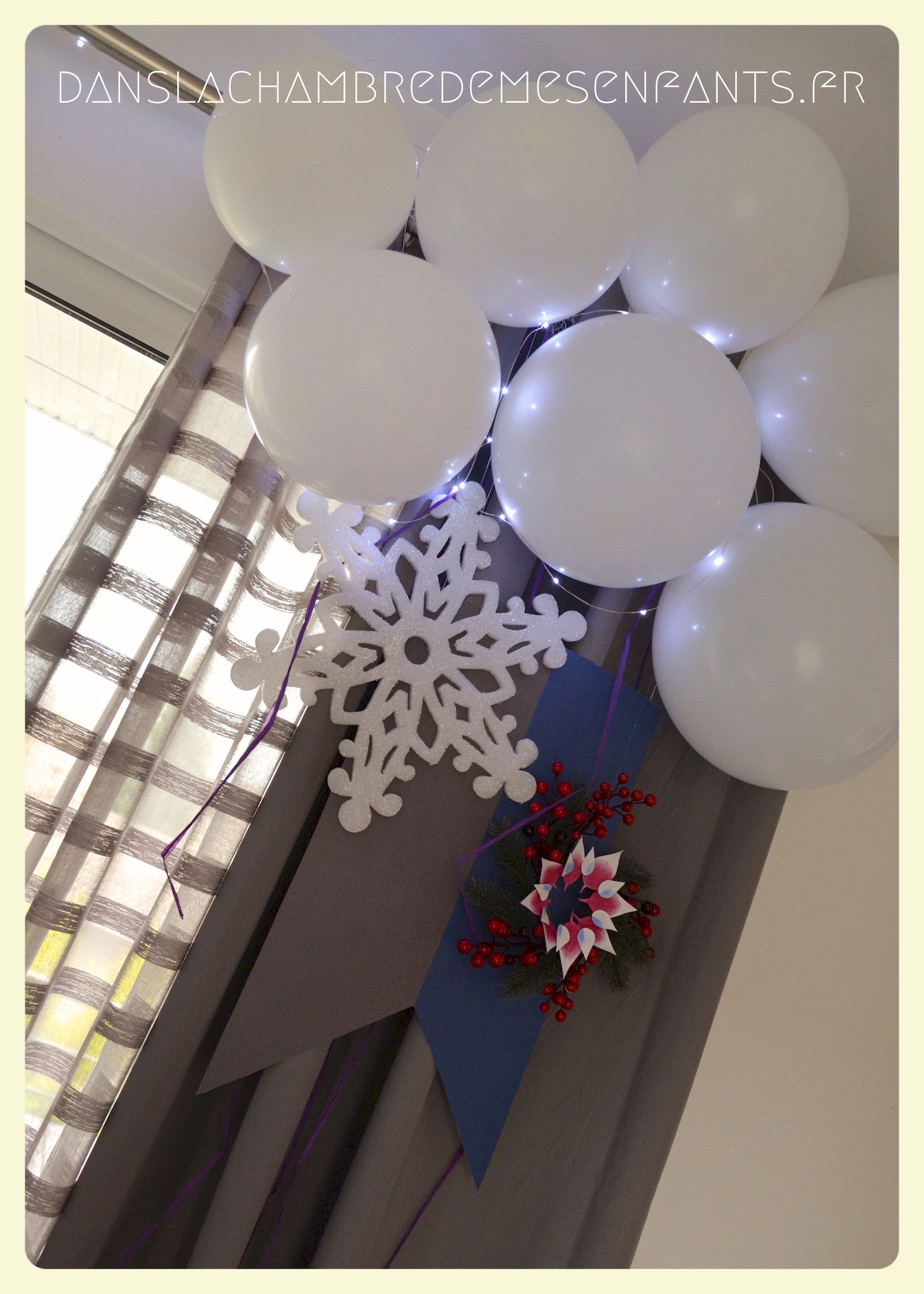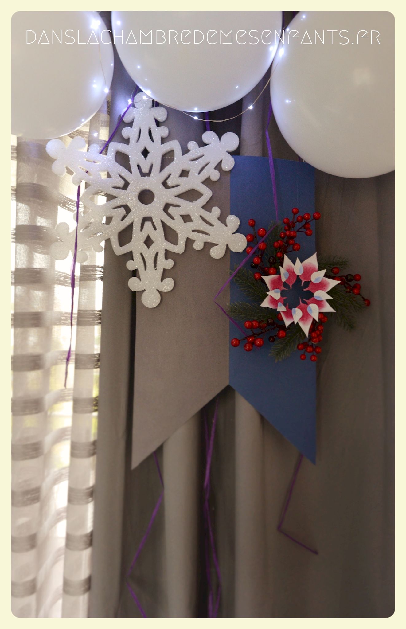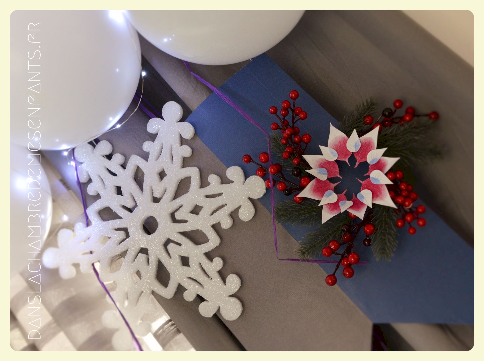 J’ai repris les bannières verticales, quelque peu revisitées, et des couronnes bricolées façon nouveau Noël d’Arendelle, le royaume de la reine des neiges. J’ai choisi de gonfler des ballons blancs de façon irrégulière pour créer un volume sympa de chaque côté des guirlandes composées de flocons cotonneux et de LED. J’ai intégré mon luminaire à la décoration éphémère en le transformant en lustre avec des flocons et d’autres éléments transparents, comme givrés. Le côté glacé a été soutenu par un autre type de flocons disposés en contraste avec ma nappe fétiche, grise claire, elle passe partout !
