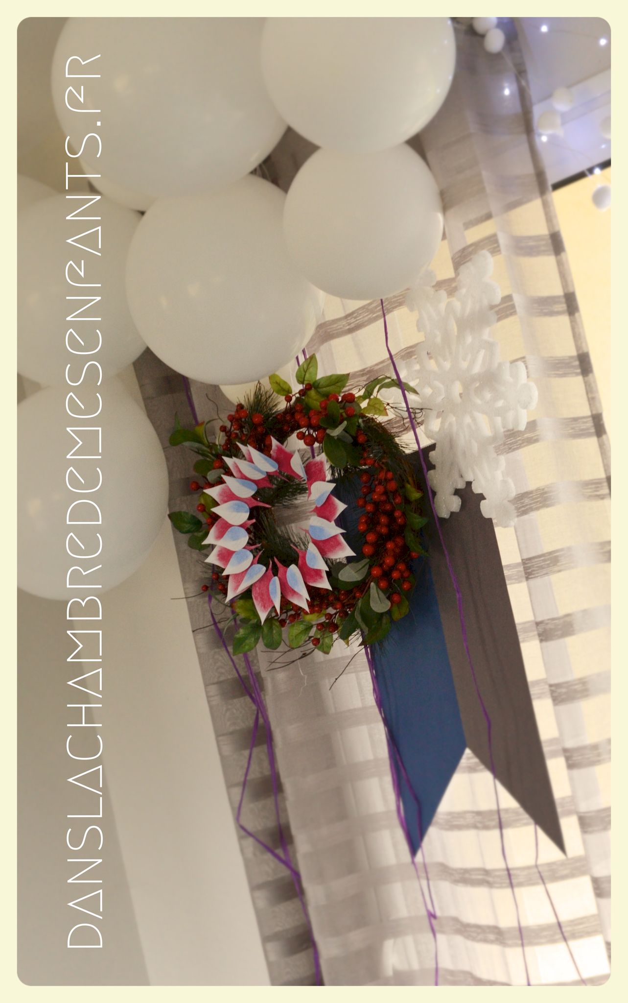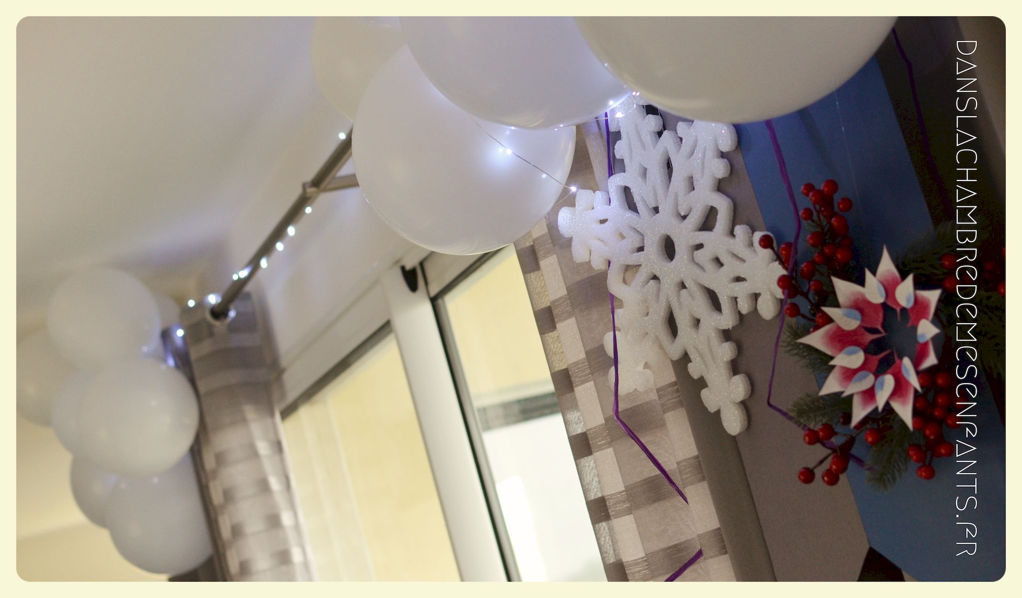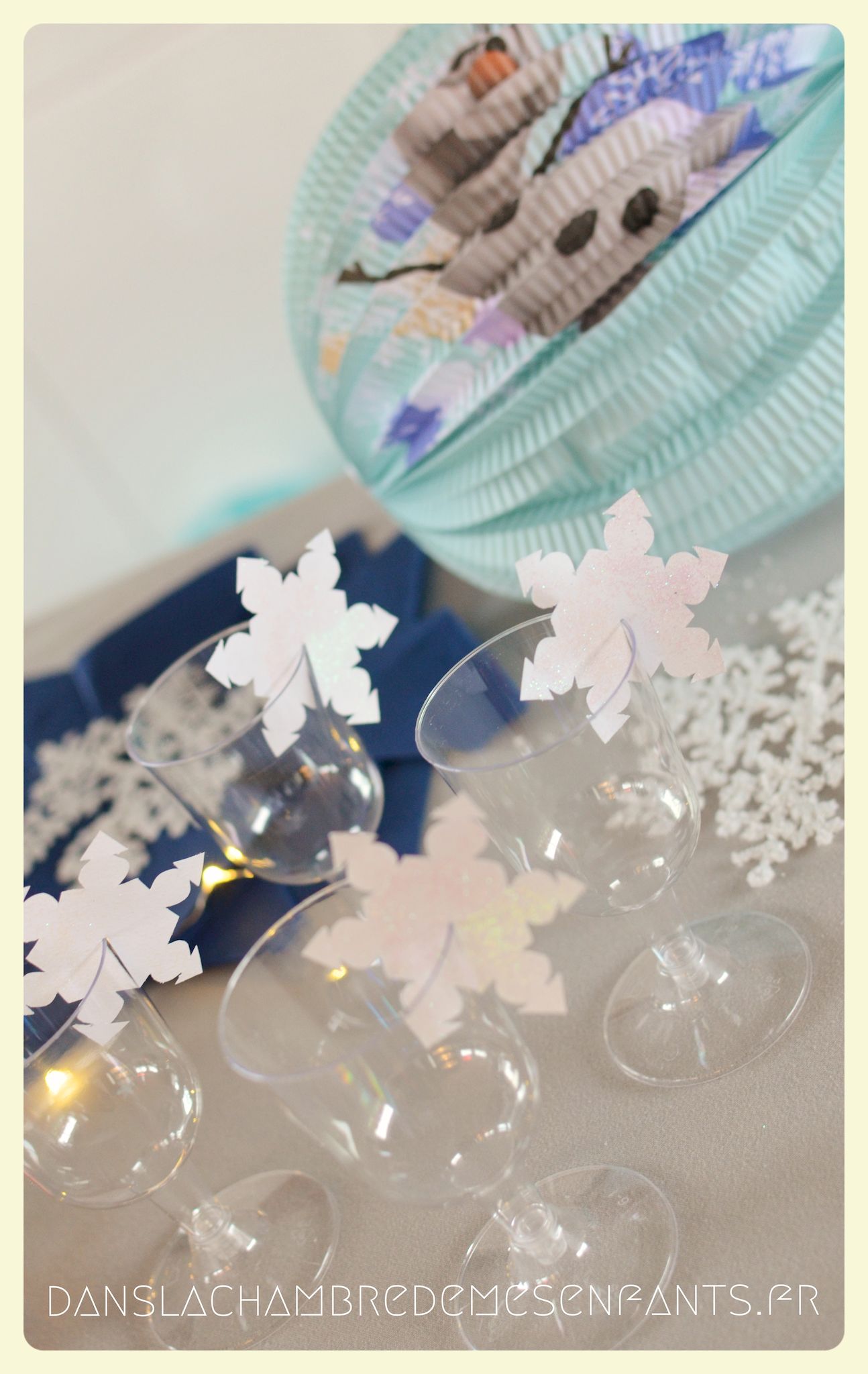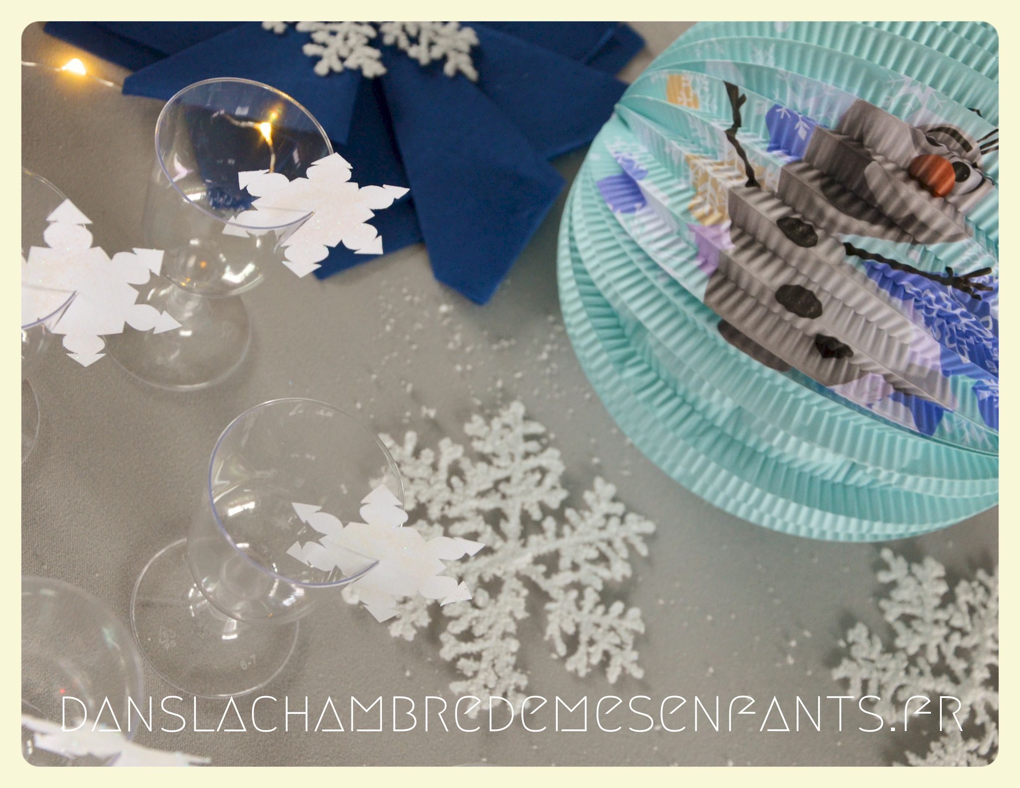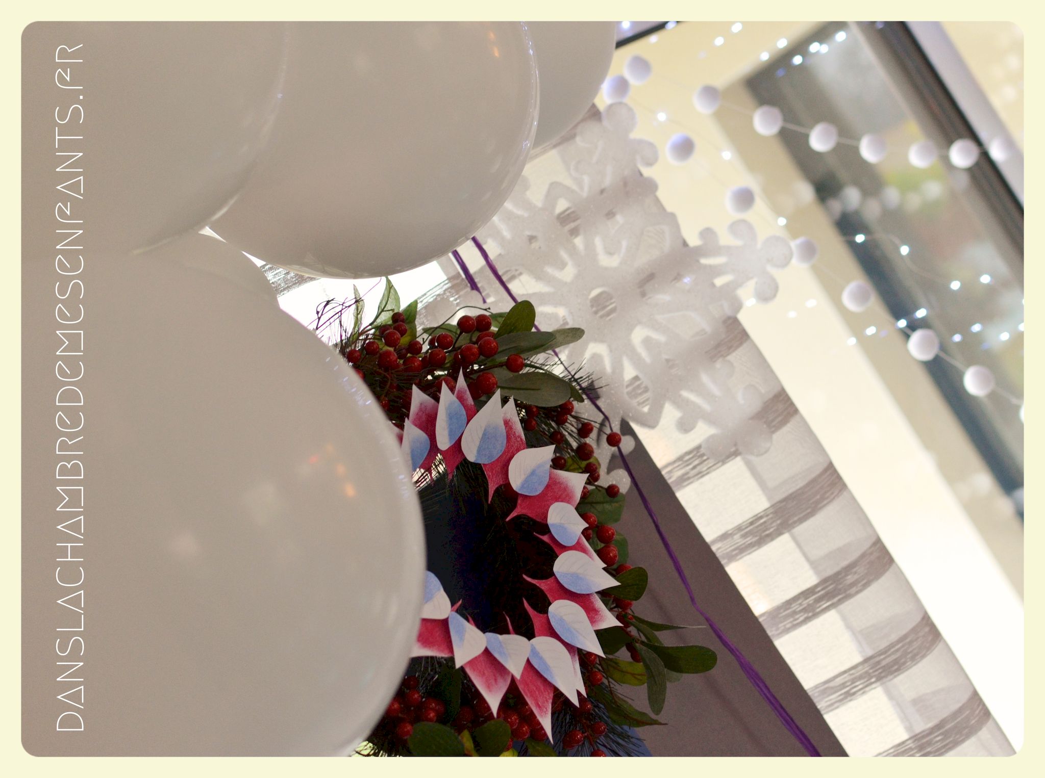 J’ai repris les bannières verticales, quelque peu revisitées, et des couronnes bricolées façon nouveau Noël d’Arendelle, le royaume de la reine des neiges. J’ai choisi de gonfler des ballons blancs de façon irrégulière pour créer un volume sympa de chaque côté des guirlandes composées de flocons cotonneux et de LED. J’ai intégré mon luminaire à la décoration éphémère en le transformant en lustre avec des flocons et d’autres éléments transparents, comme givrés. Le côté glacé a été soutenu par un autre type de flocons disposés en contraste avec ma nappe fétiche, grise claire, elle passe partout !