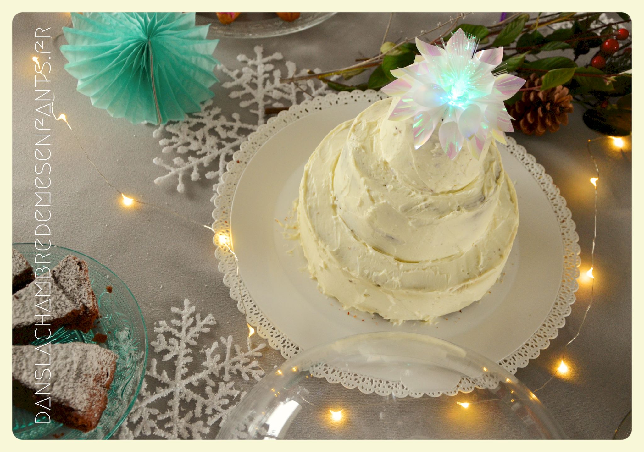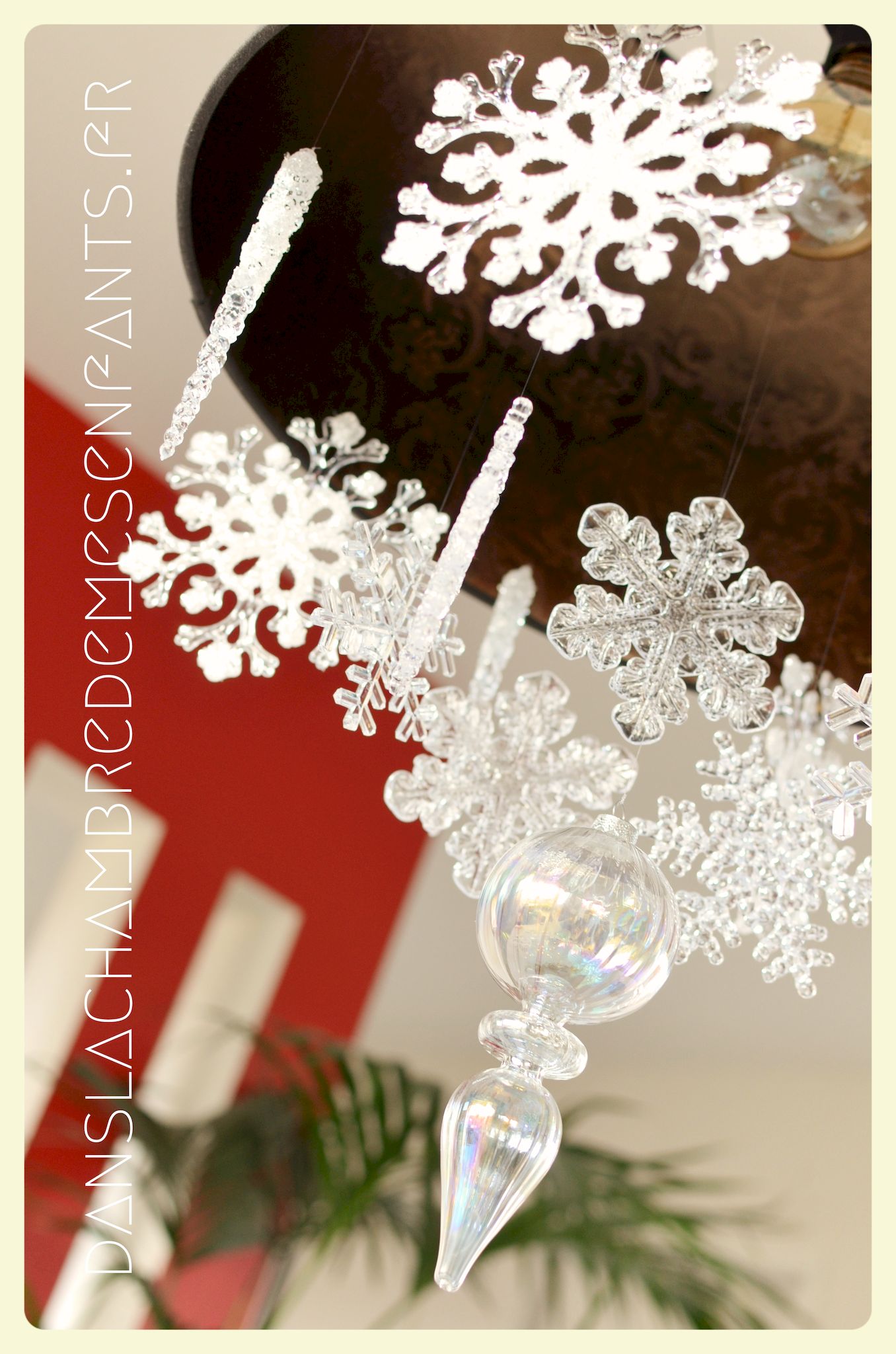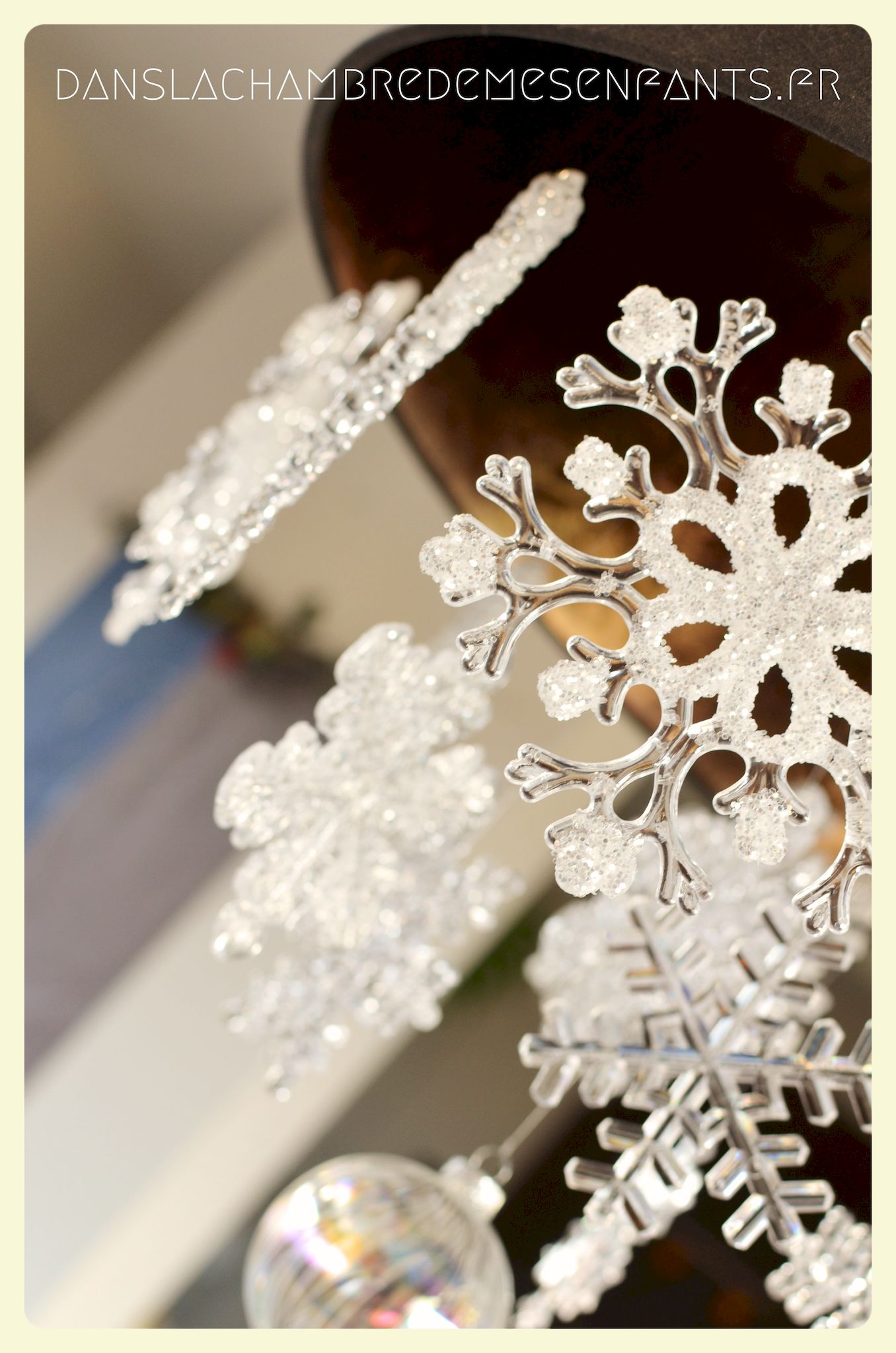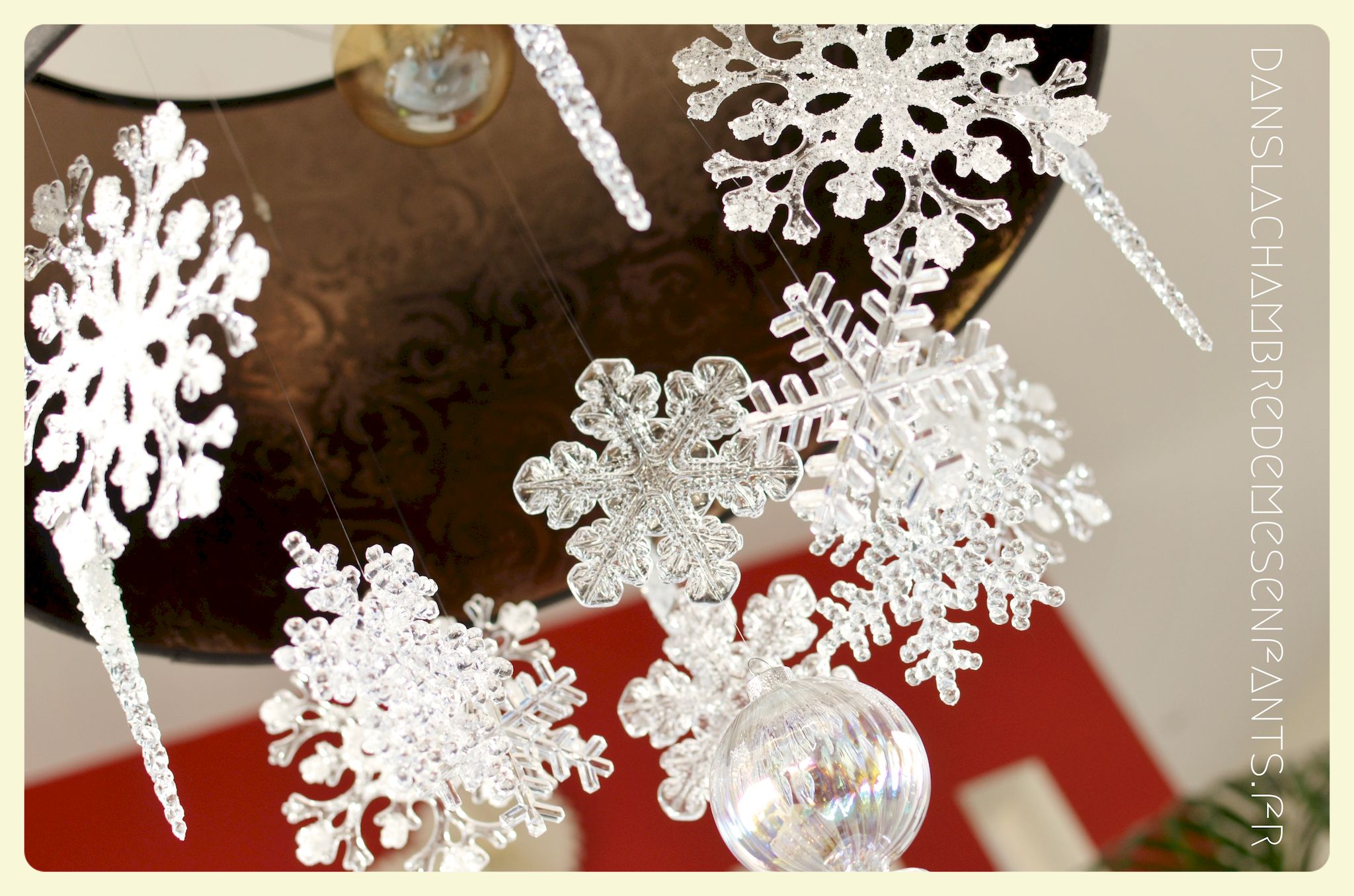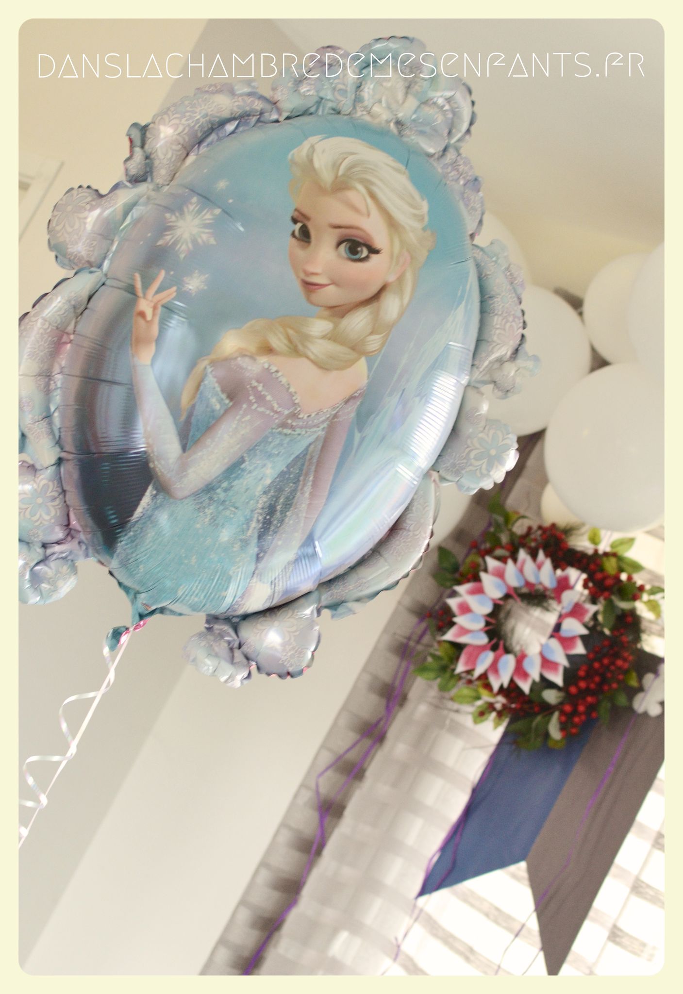 J’ai repris les bannières verticales, quelque peu revisitées, et des couronnes bricolées façon nouveau Noël d’Arendelle, le royaume de la reine des neiges. J’ai choisi de gonfler des ballons blancs de façon irrégulière pour créer un volume sympa de chaque côté des guirlandes composées de flocons cotonneux et de LED. J’ai intégré mon luminaire à la décoration éphémère en le transformant en lustre avec des flocons et d’autres éléments transparents, comme givrés. Le côté glacé a été soutenu par un autre type de flocons disposés en contraste avec ma nappe fétiche, grise claire, elle passe partout !