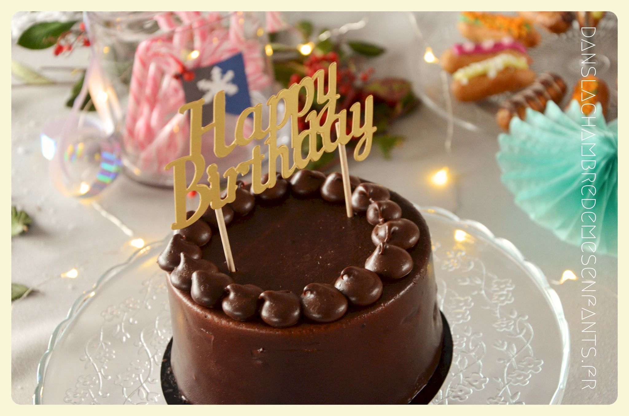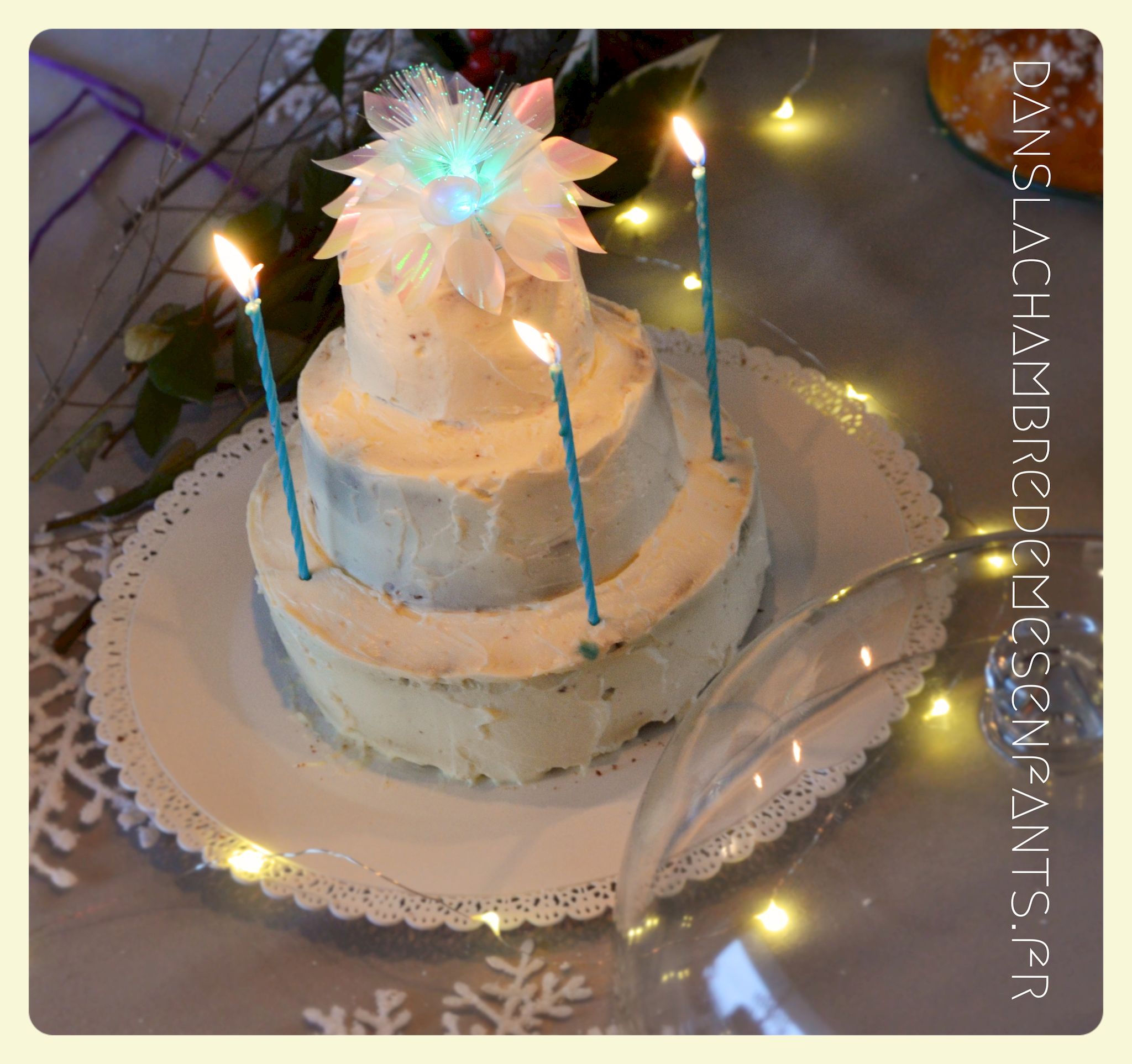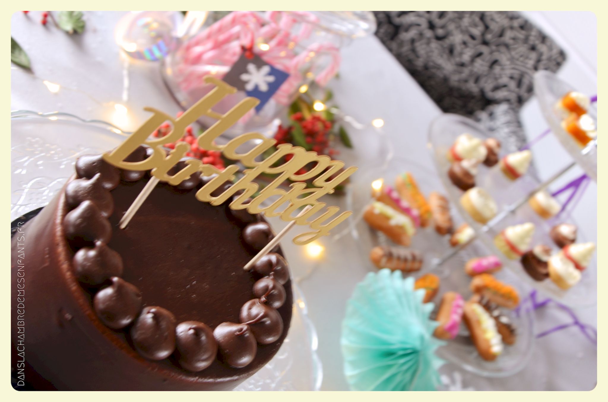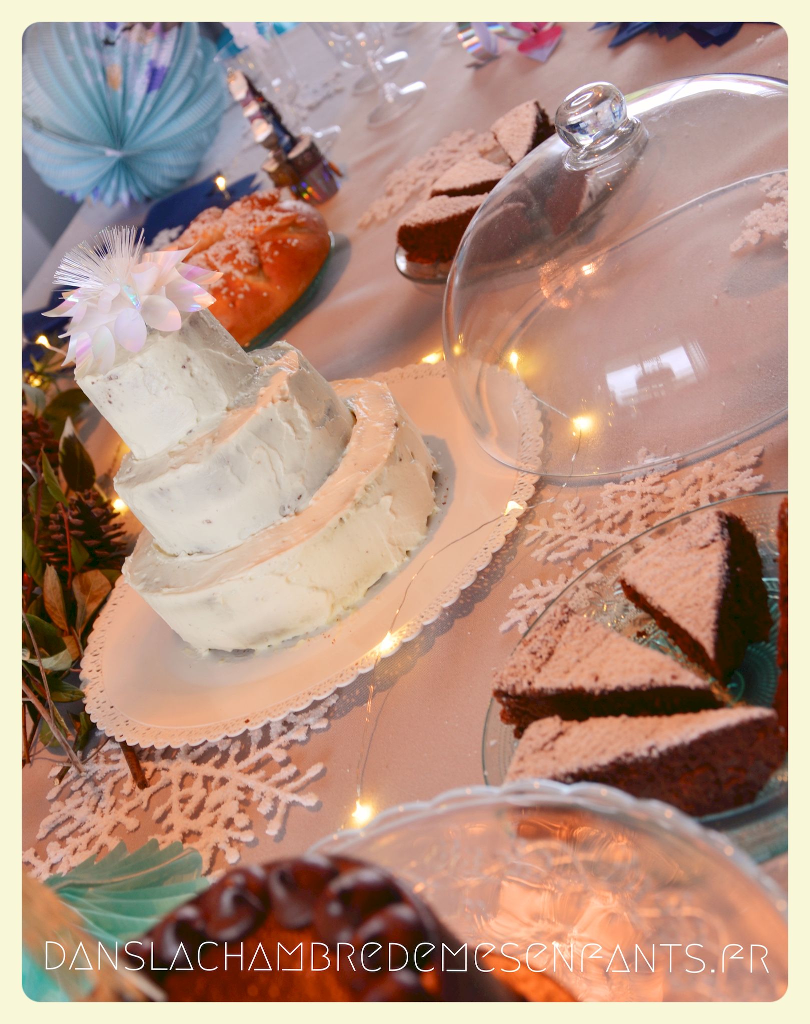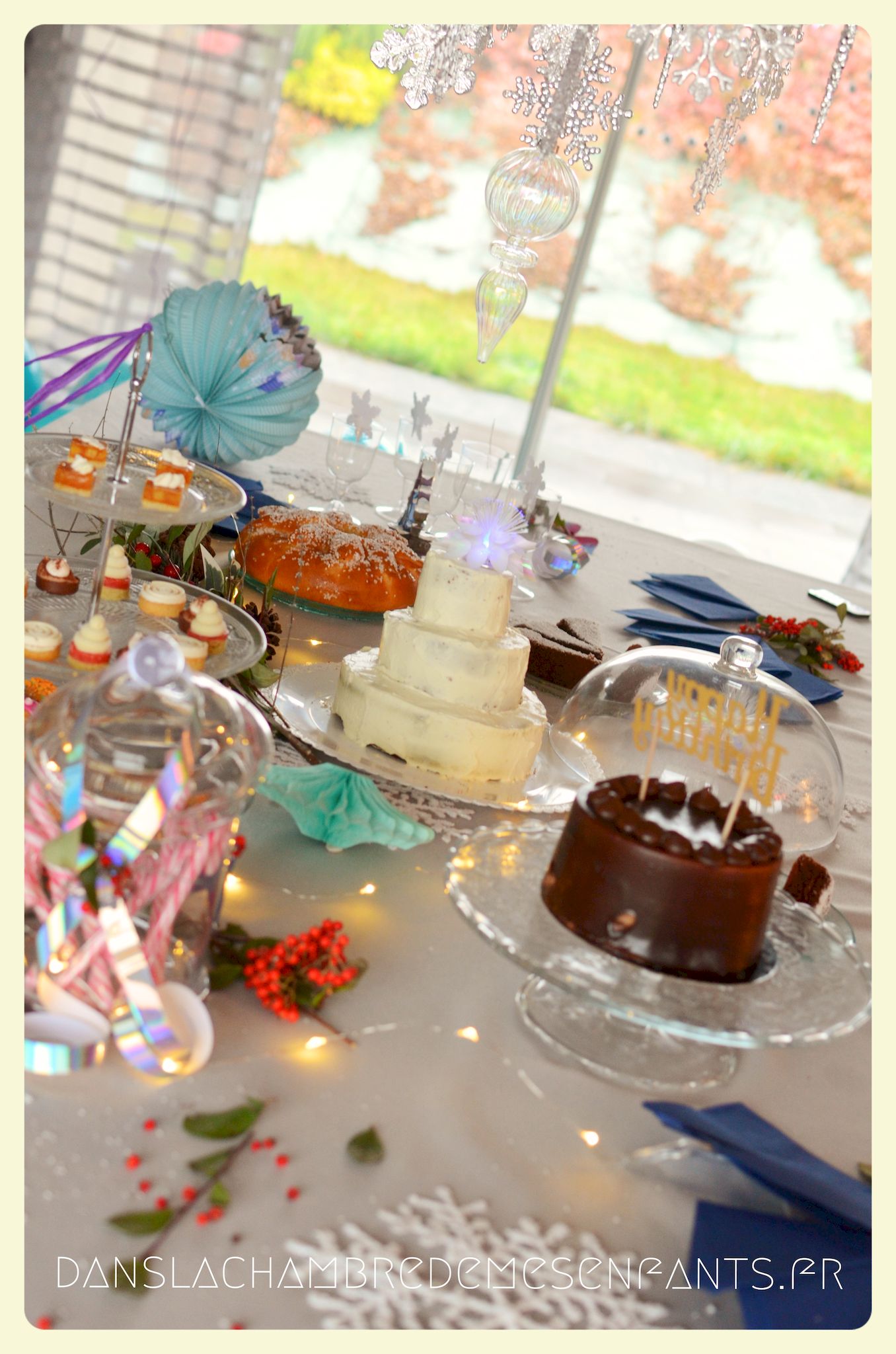 J’ai encore choisi de faire une sweet table avec quelques rappels du buffet du film : des sucres d’orge, des petits fours sur un plat à étage pour donner de la hauteur, une galette des rois briochée, deux gâteaux au chocolat et un troisième à étage avec les bougies. Pour ce dernier, j’ai repris la recette du Rainbow cake du livre le Girls’ book de la pâtisserie spécial beaux gâteaux des éditions Larousse, sans colorant et en ajoutant du cacao en poudre pour l’adapter aux goûts de ma fan de chocolat. Pour sa déco, je l’ai surmonté d’une fleur lumineuse qui s’intègre bien au thème (qui est en fait une déco pour emballage cadeau que j’ai détournée).