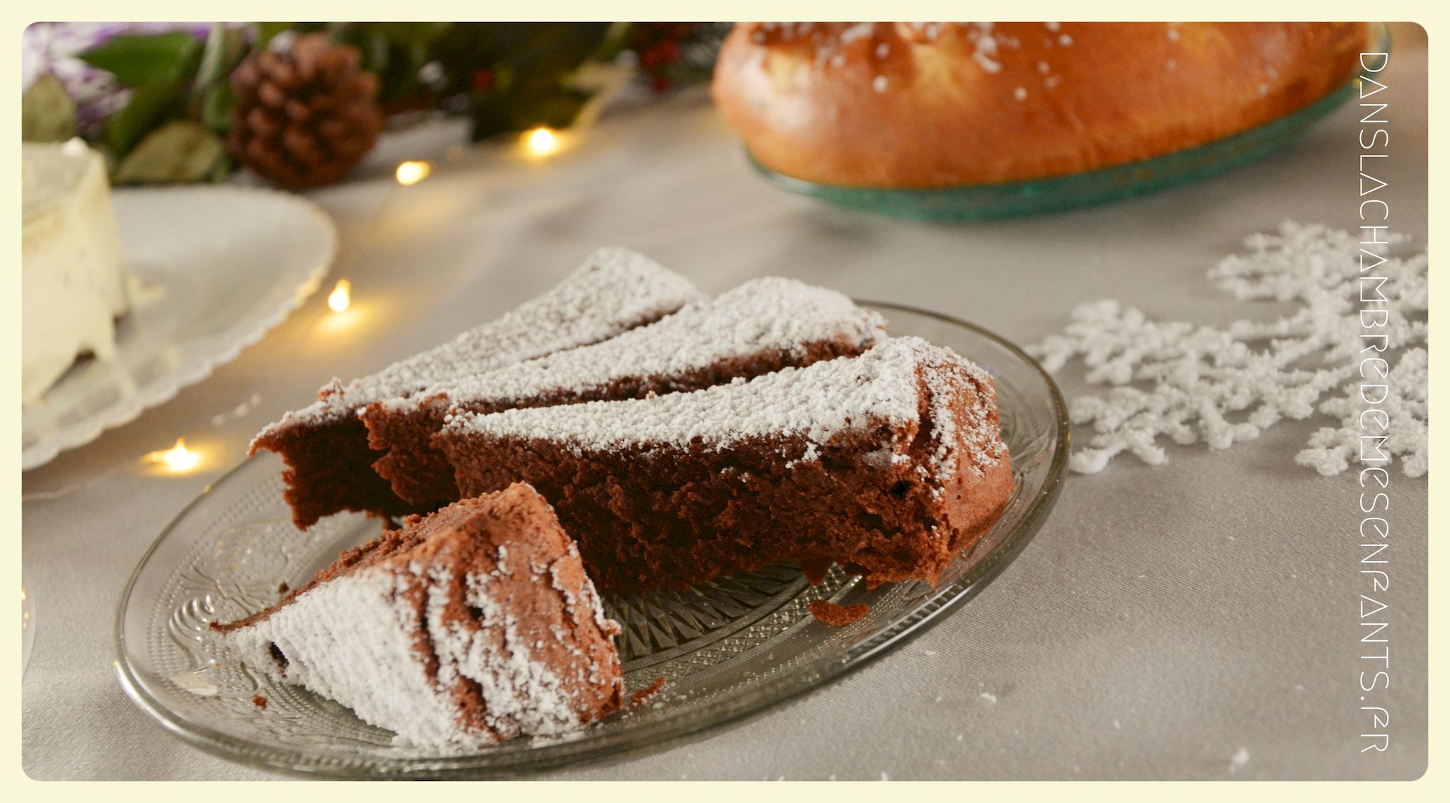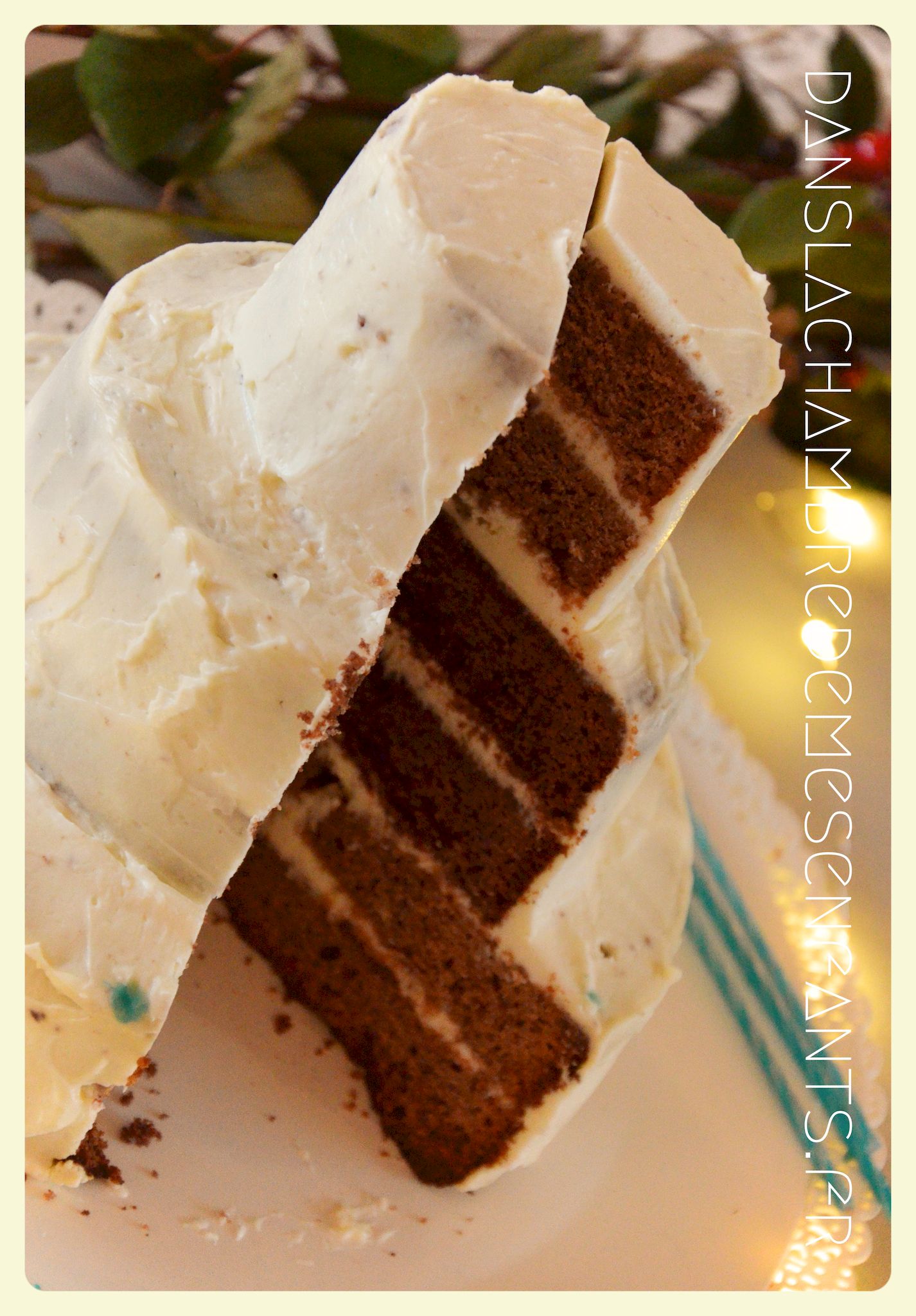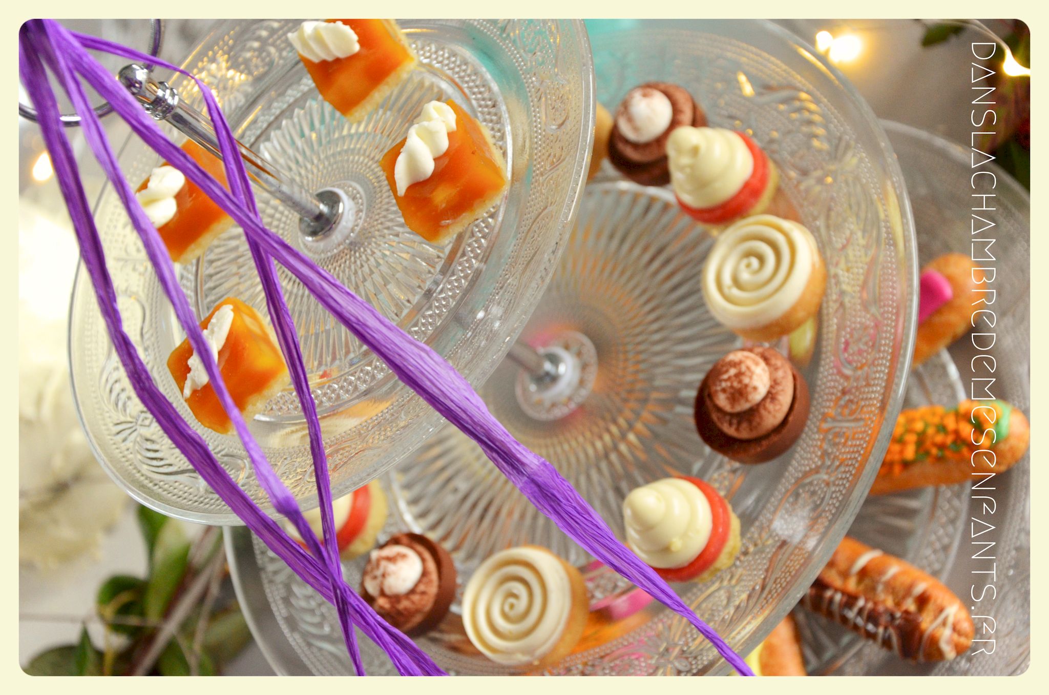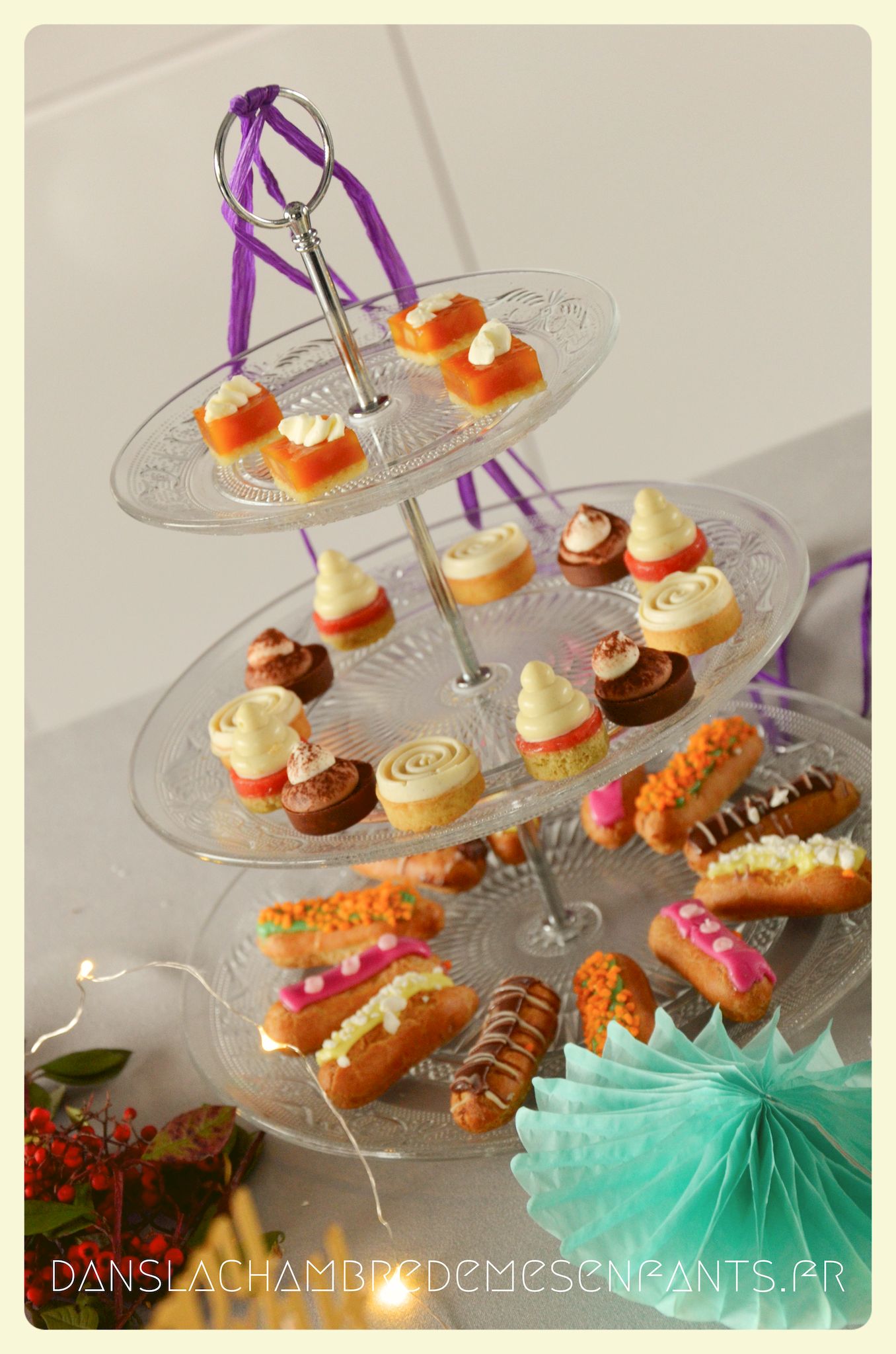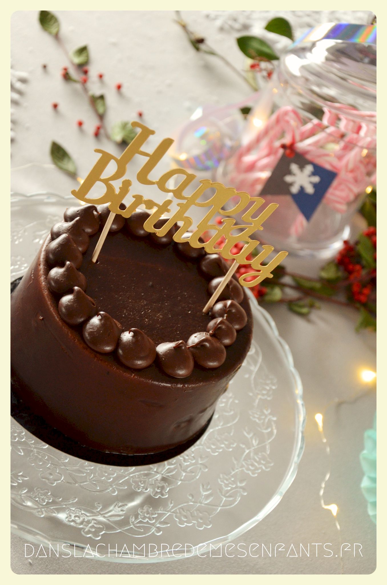 J’ai encore choisi de faire une sweet table avec quelques rappels du buffet du film : des sucres d’orge, des petits fours sur un plat à étage pour donner de la hauteur, une galette des rois briochée, deux gâteaux au chocolat et un troisième à étage avec les bougies. Pour ce dernier, j’ai repris la recette du Rainbow cake du livre le Girls’ book de la pâtisserie spécial beaux gâteaux des éditions Larousse, sans colorant et en ajoutant du cacao en poudre pour l’adapter aux goûts de ma fan de chocolat. Pour sa déco, je l’ai surmonté d’une fleur lumineuse qui s’intègre bien au thème (qui est en fait une déco pour emballage cadeau que j’ai détournée).