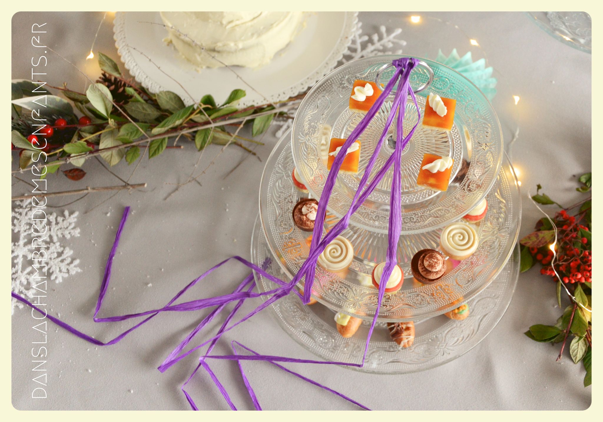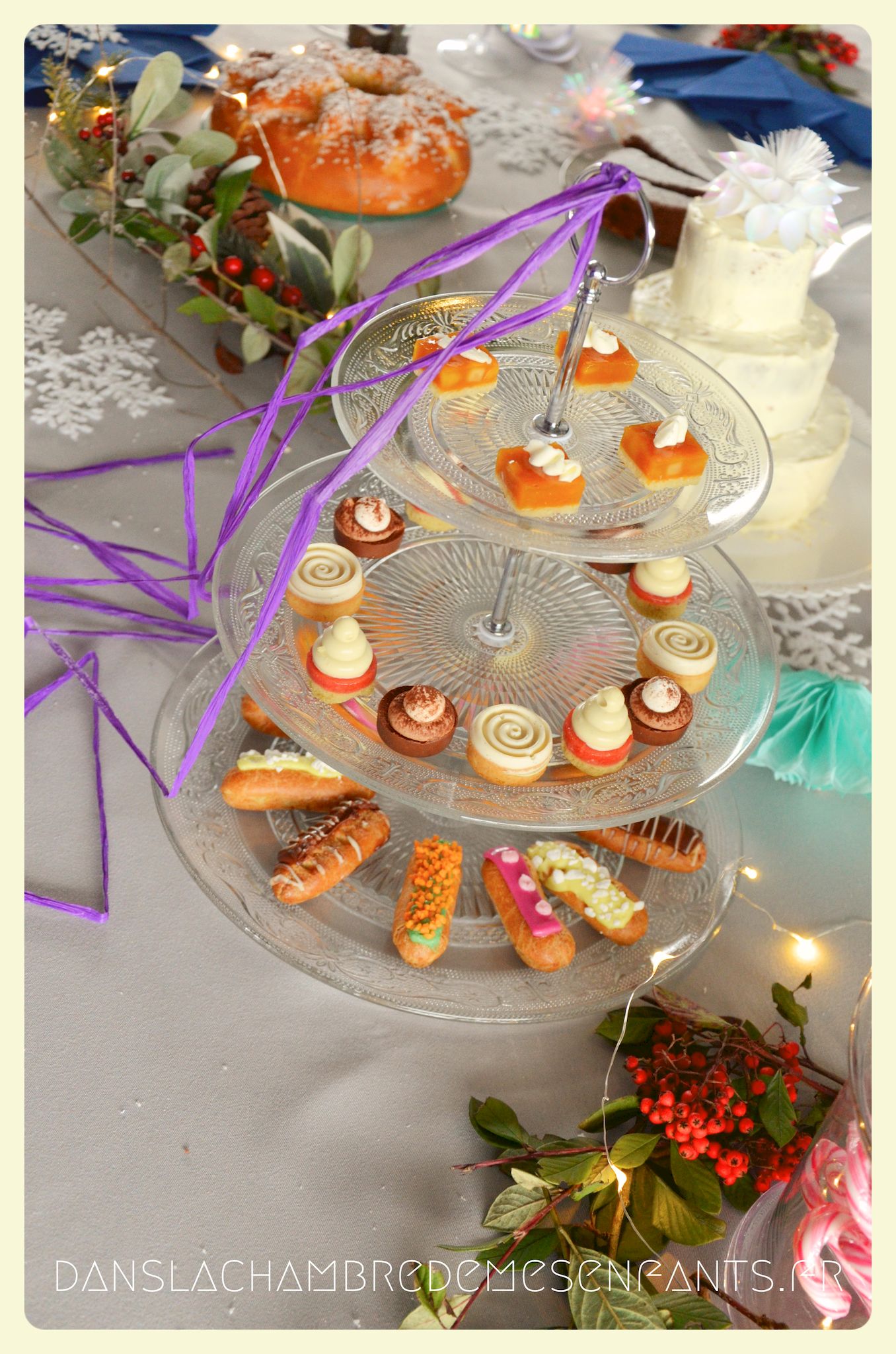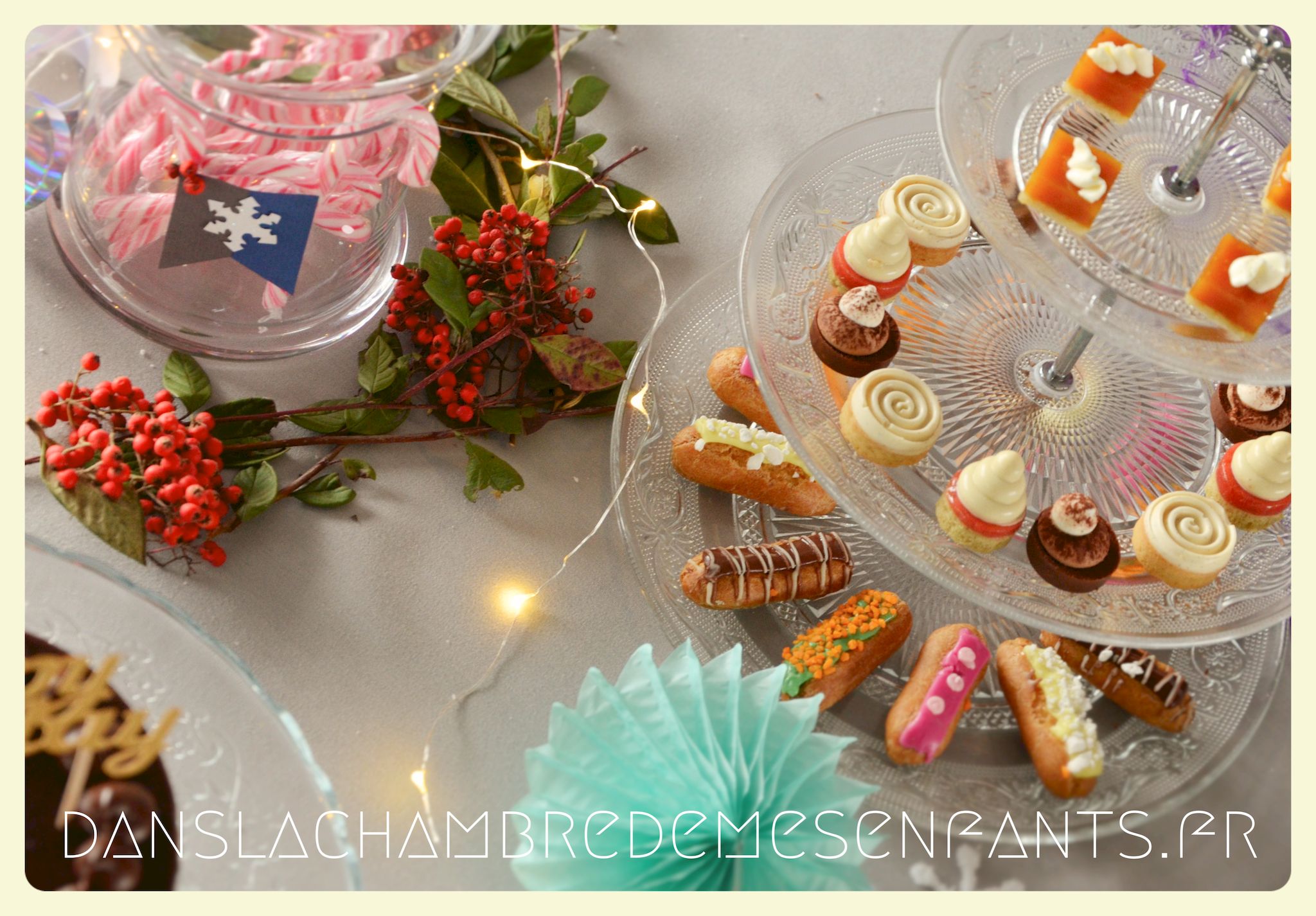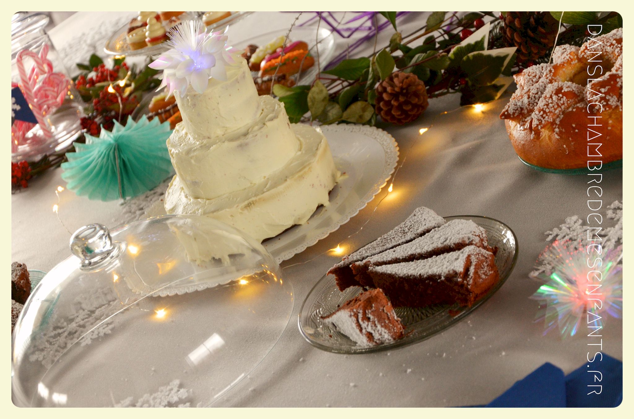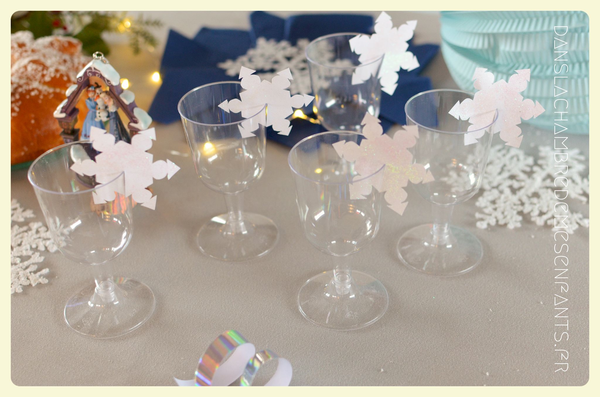 J’ai utilisé des chutes pour décorer la bonbonnière et j’ai repris la sorte de tulipe figurant sur les drapeaux du royaume avec un pliage des serviettes de table. Des petits verres à pieds en PVC transparents ont été décorés par des flocons de neiges pailletés en papier, faits maison aussi. J’ai improvisé une inscription murale, placé plusieurs éclairages dans la déco car, encore une fois, le temps était couvert et le salon bénéficiait d’une mauvaise lumière. Je vous passe les détails car les photos parlent d’elles-mêmes (pas mal de bricolage maison mais c’est encore la meilleure façon de s’approprier la déco !).