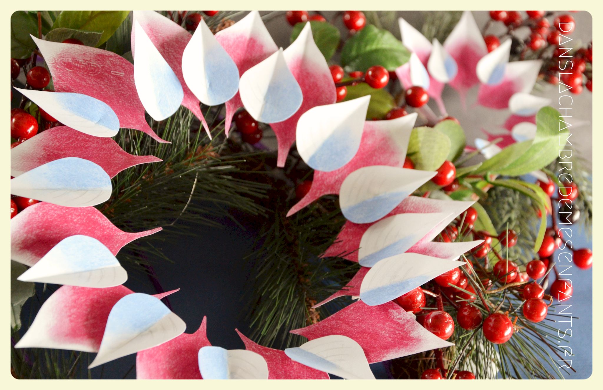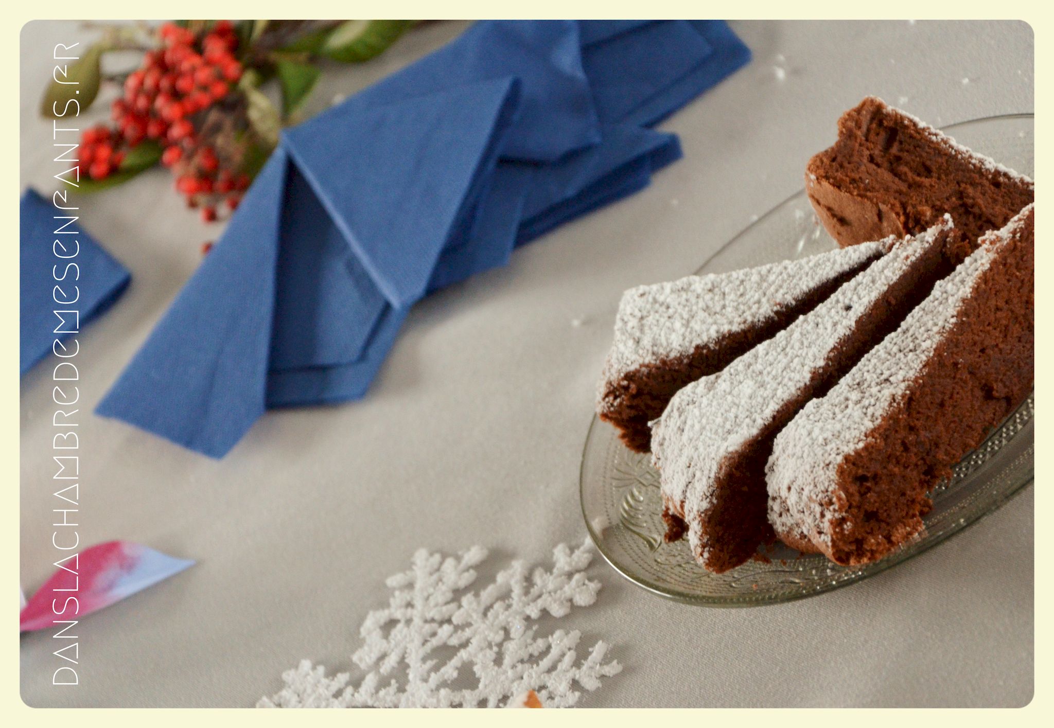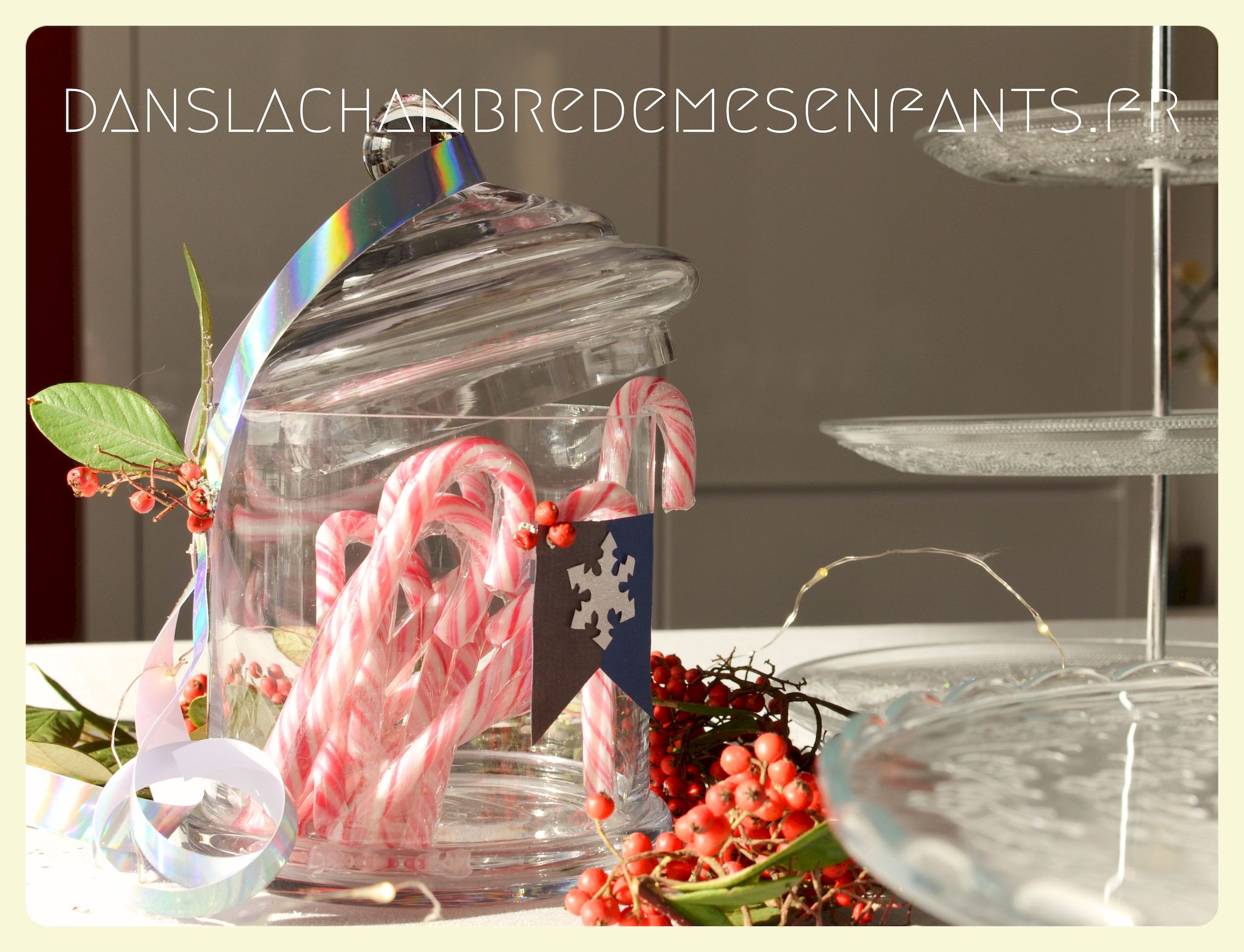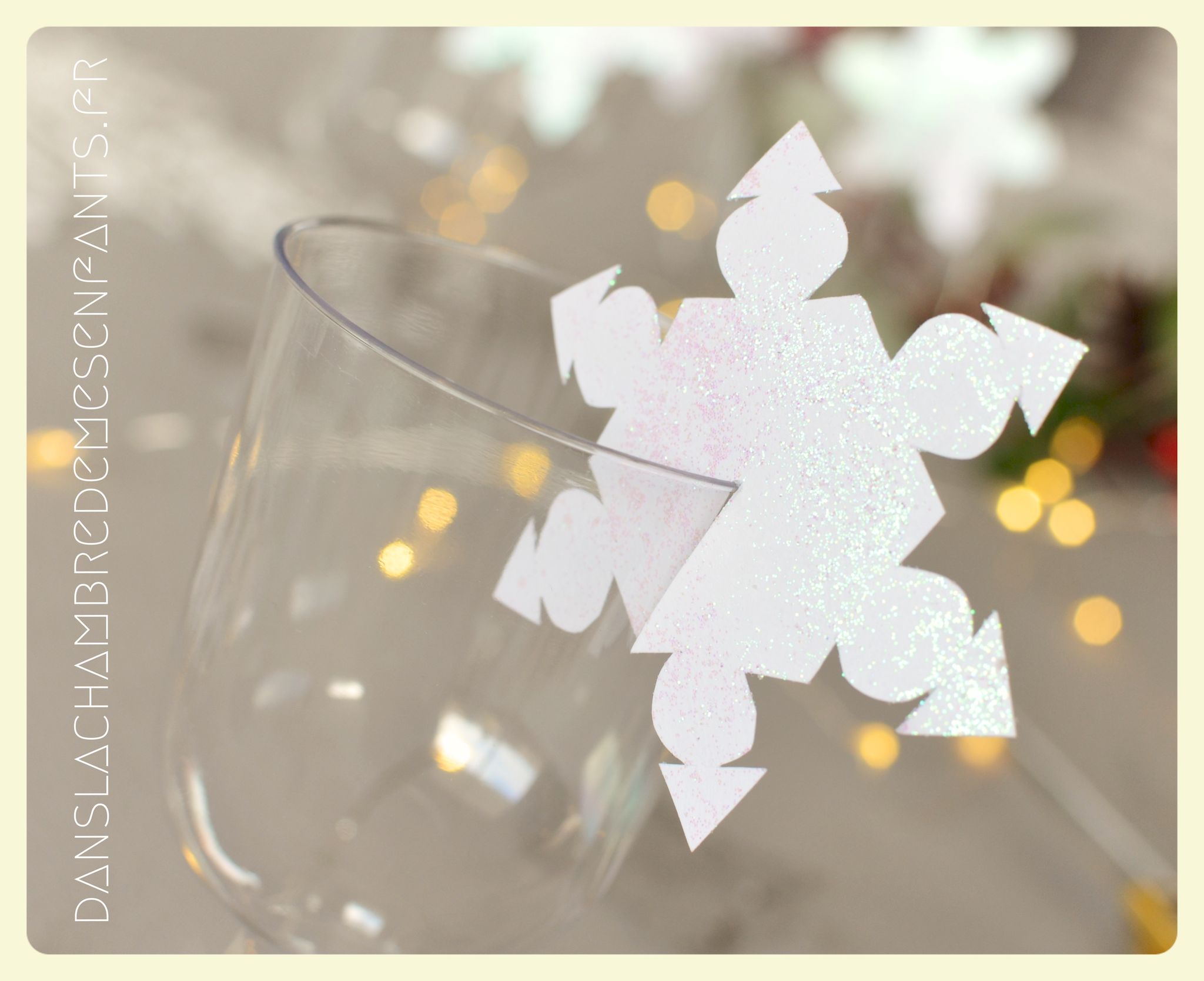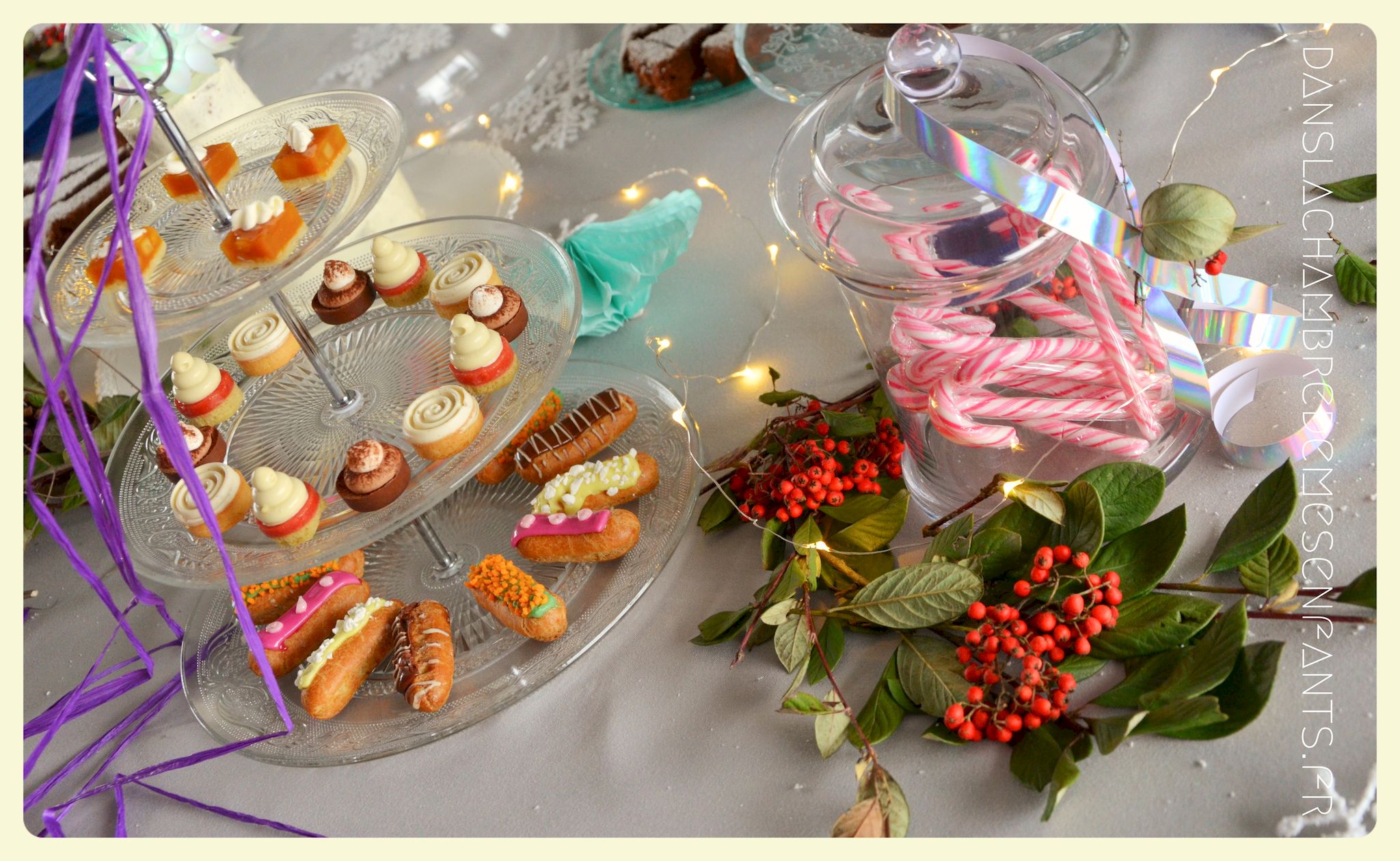 J’ai utilisé des chutes pour décorer la bonbonnière et j’ai repris la sorte de tulipe figurant sur les drapeaux du royaume avec un pliage des serviettes de table. Des petits verres à pieds en PVC transparents ont été décorés par des flocons de neiges pailletés en papier, faits maison aussi. J’ai improvisé une inscription murale, placé plusieurs éclairages dans la déco car, encore une fois, le temps était couvert et le salon bénéficiait d’une mauvaise lumière. Je vous passe les détails car les photos parlent d’elles-mêmes (pas mal de bricolage maison mais c’est encore la meilleure façon de s’approprier la déco !).
