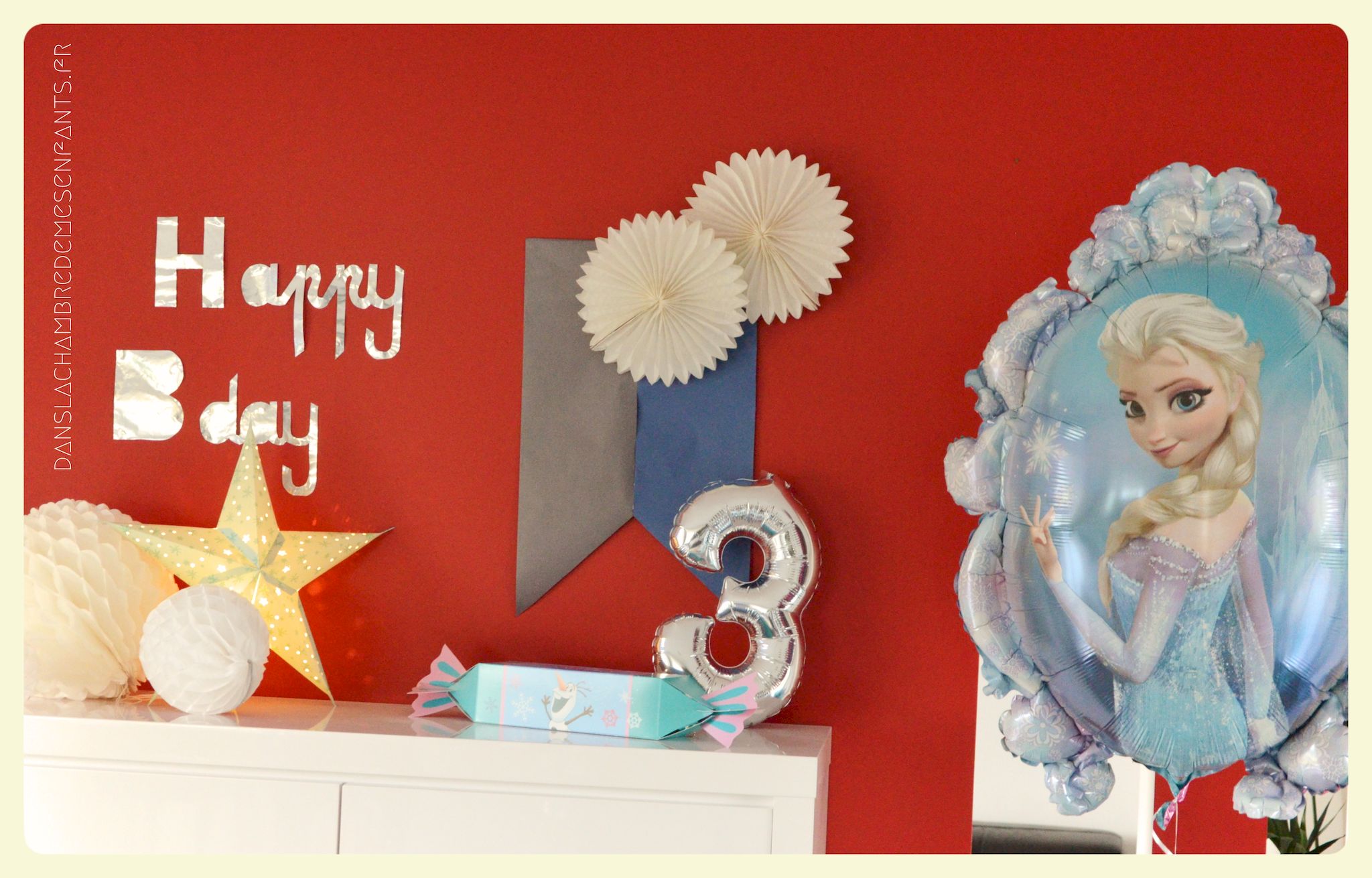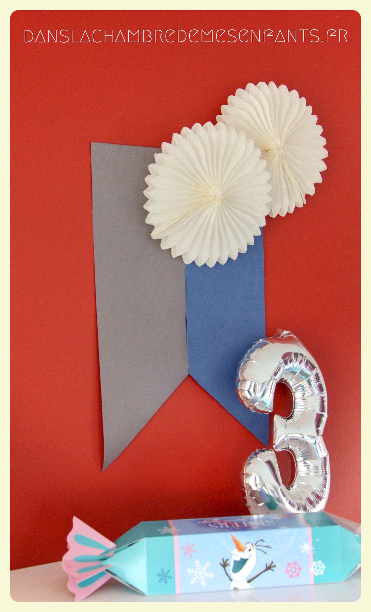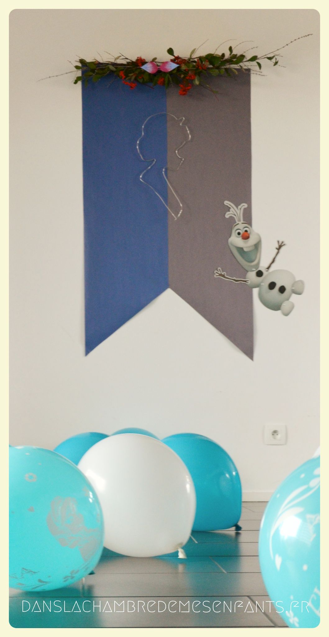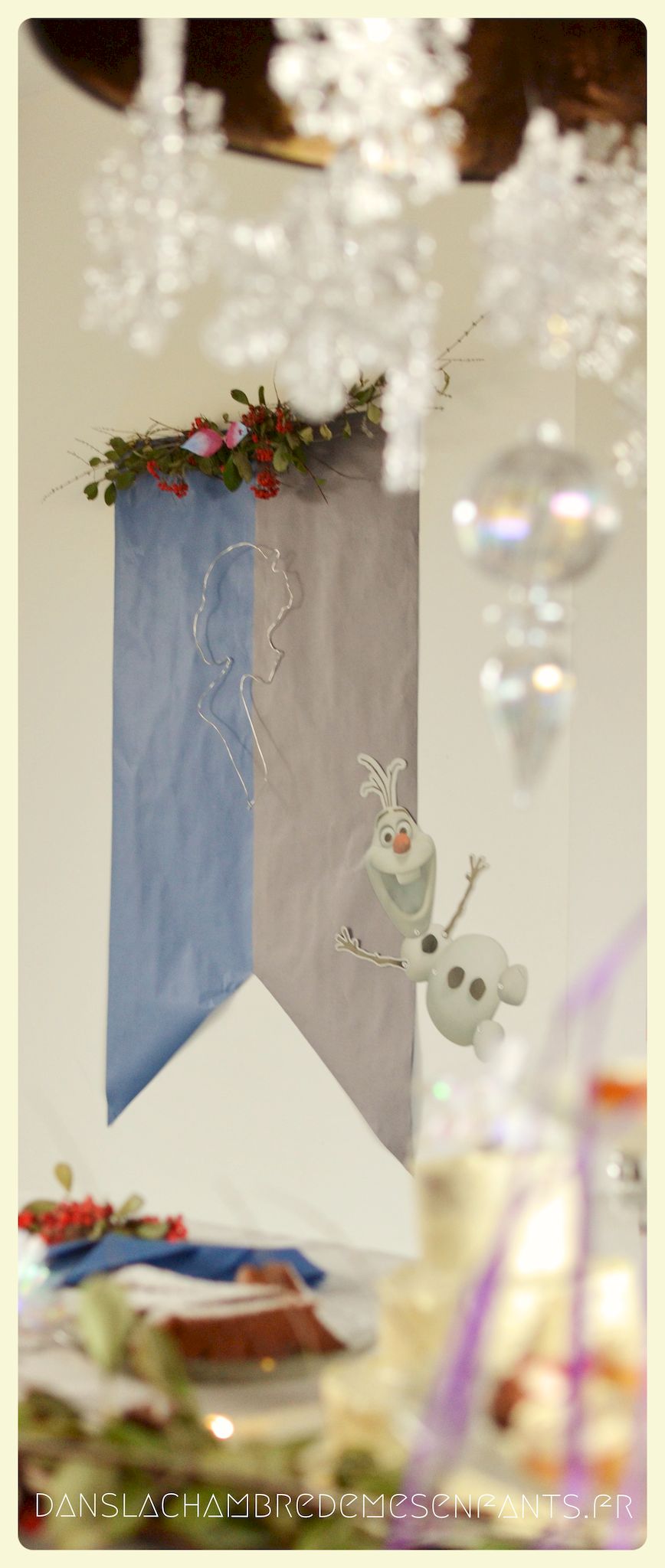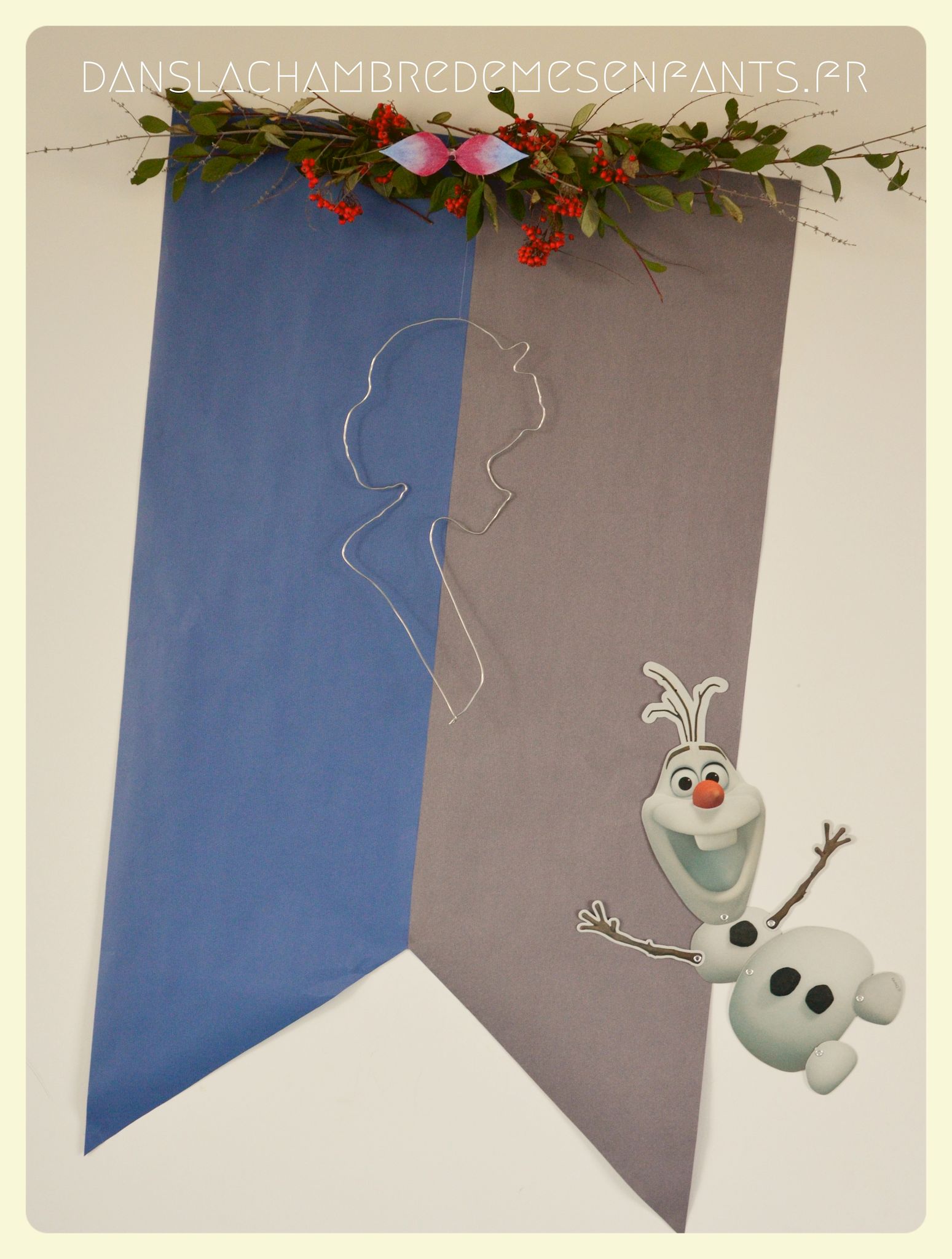 Pour rappeler encore les drapeaux d’Arendelle, j’ai fabriqué une déco murale (servant aussi d’arrière plan pour les photos souvenirs) à partir de papier kraft de couleurs tout simplement. Pour faire référence à l’épisode dédié à Olaf, j’ai réalisé une décoration sur la partie haute à partir de branchages et un petit nœud ressemblant à celui du personnage. J’ai suspendu le profil d’Elsa, formé à partir de fil métallique (rayon loisirs créatifs). J’ai placé une image d’Olaf articulée de façon à ce qu’il semble accompagner, de façon amusante, les personnes lors des prises de vue.