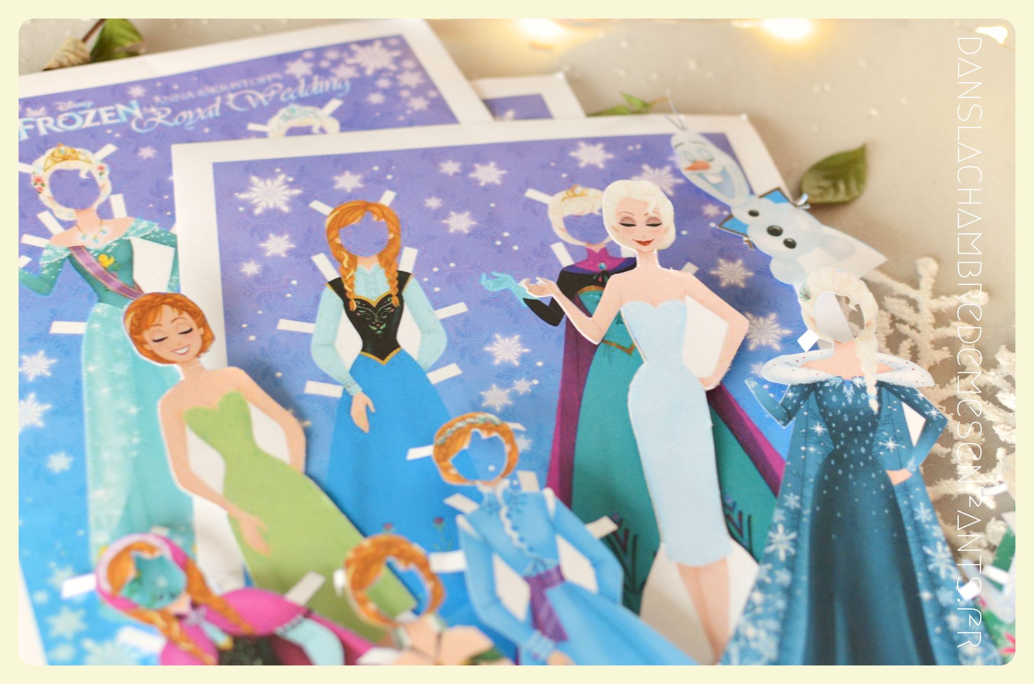 Dans des boîtes en forme de papillote, j’ai prévu des petits cadeaux pour les enfants, ainsi que des coloriages choisis par Emi et des poupées en papier à habiller de Cory Jensen en mode free printable. Elles sont jolies et elles ont beaucoup plu à ma fille. Cependant, elles peuvent être améliorées en bricolant leur support et un autre modèle est disponible sans les cheveux attachés aux vêtements (un détail pas très pratique).