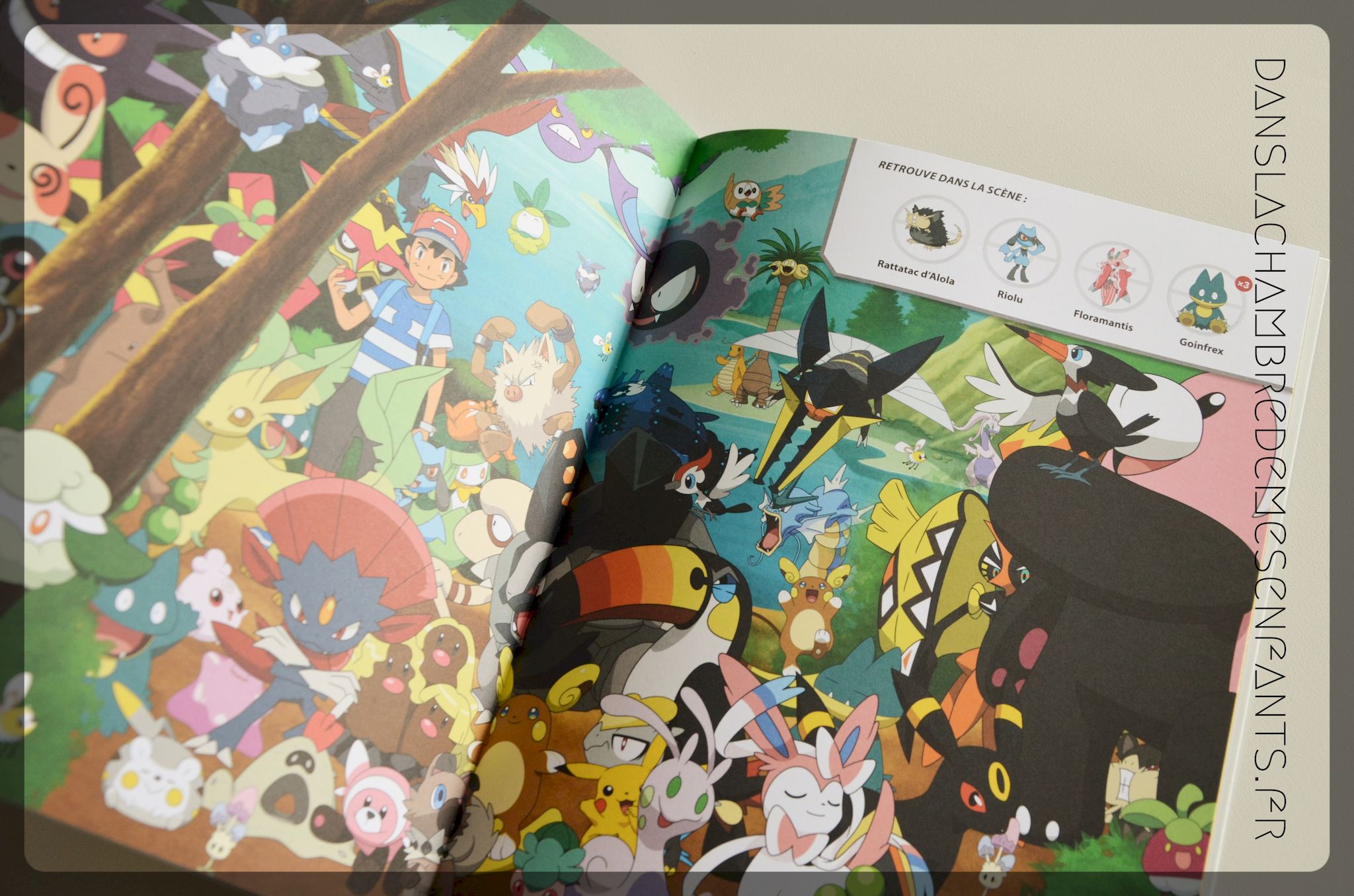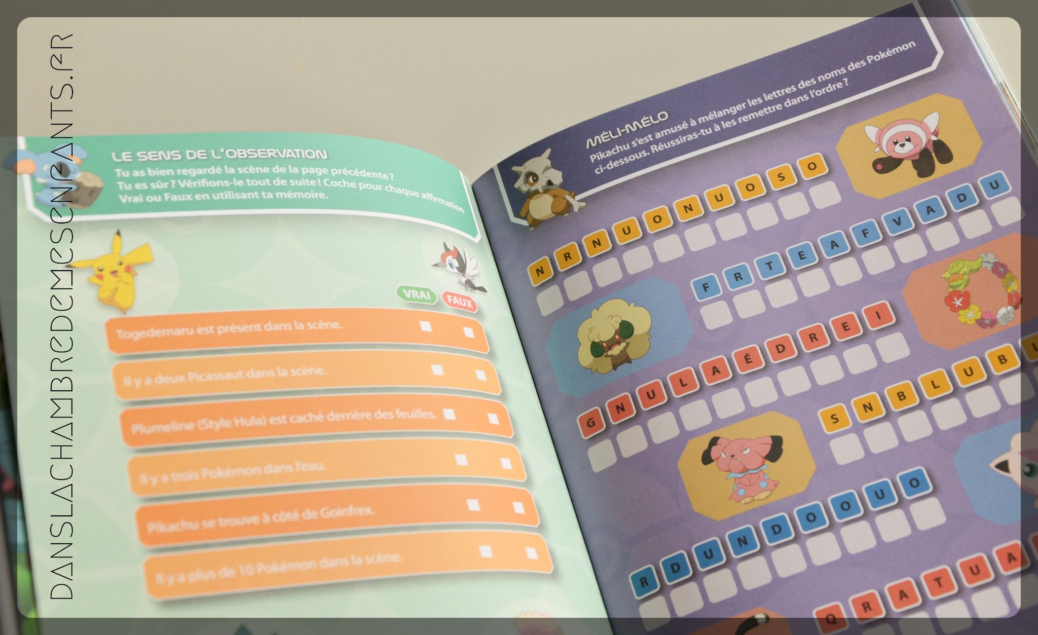 - jeu d’observation (cherche et trouve des Pokémon dans une scène, 7 différences, puzzle avec des stickers, mots mêlés…),