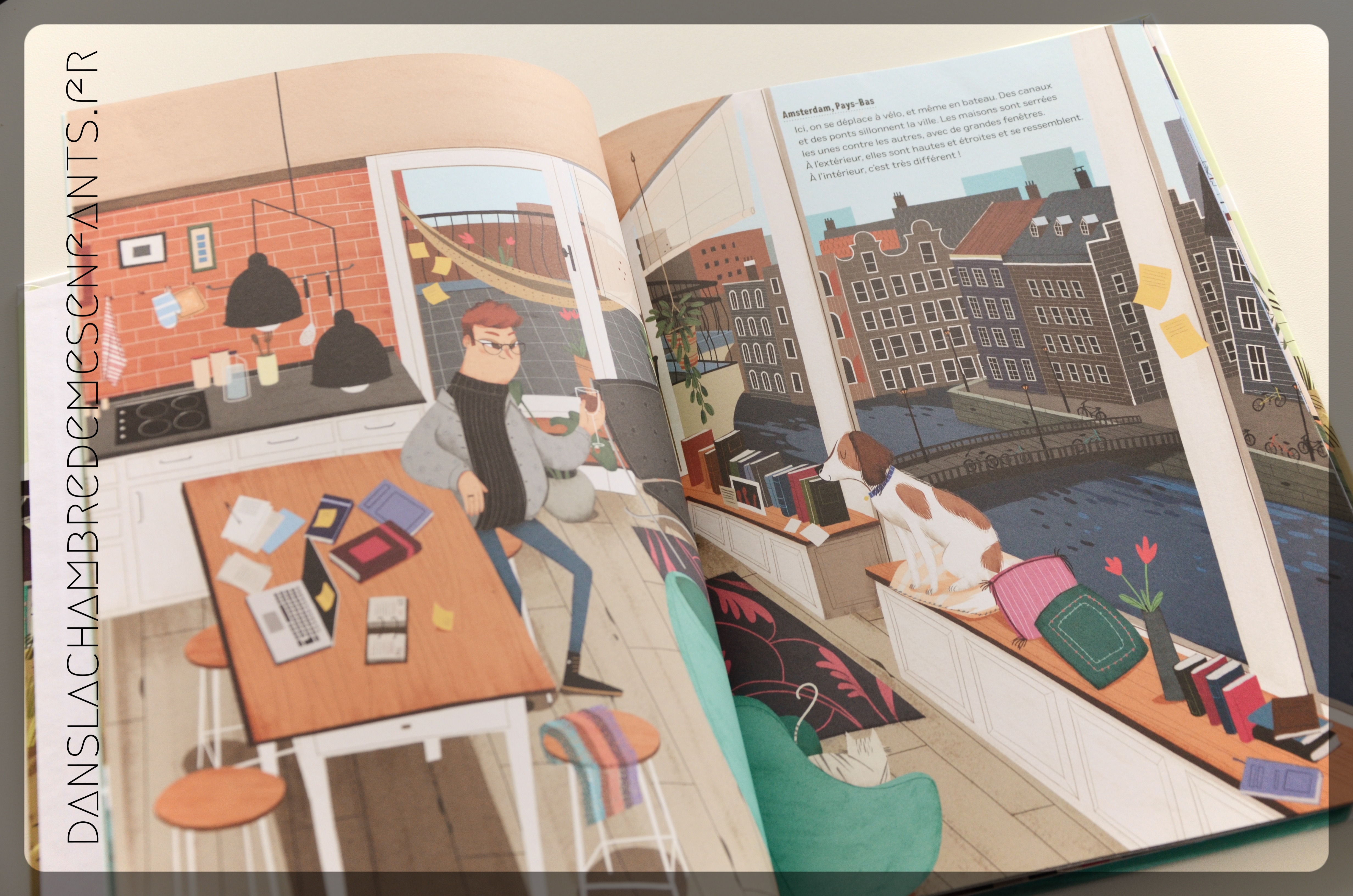 Les illustrations occupent la 1ère place pour accueillir le lecteur. Elles sont très jolies, modernes et elles traduisent bien les différentes ambiances. Après une introduction, ce sont de courtes présentations qui commentent une maison de bord de mer du Nord américain, un appartement néerlandais, une maison flottante birmane… La visite se poursuit à San Francisco (US), Toronto (Canada), Capri (Italie), Giethoorn (Pays-Bas), Hong Kong (Chine), Ibiza (Espagne), Vik i Myrdal (Islande), Kyoto (Japon), Mexico (Mexique), Londre (Royaume-Uni), New-York (US), Paris, Séville (Espagne) et Gordes (France), toujours en présence d’un petit animal.