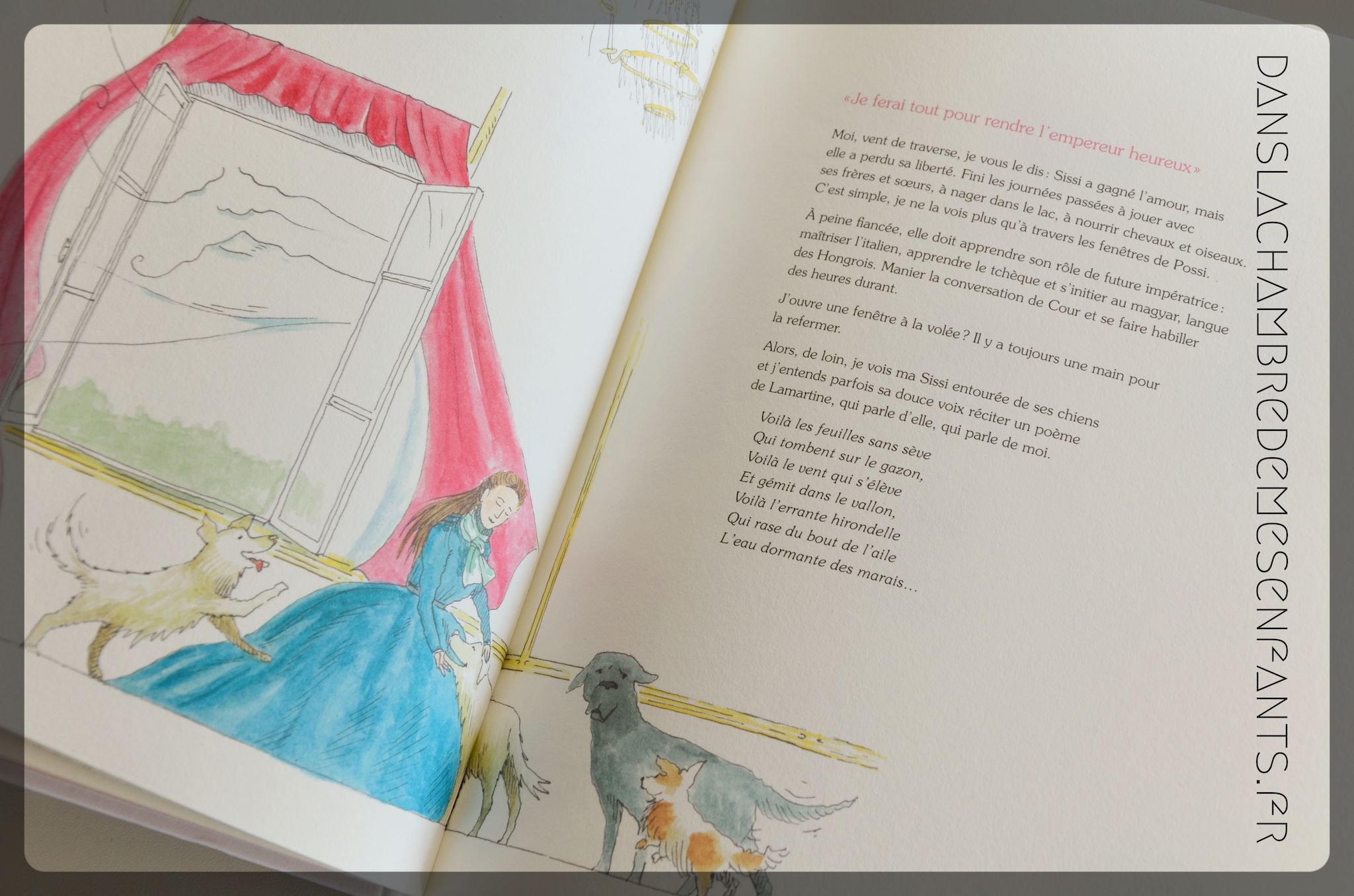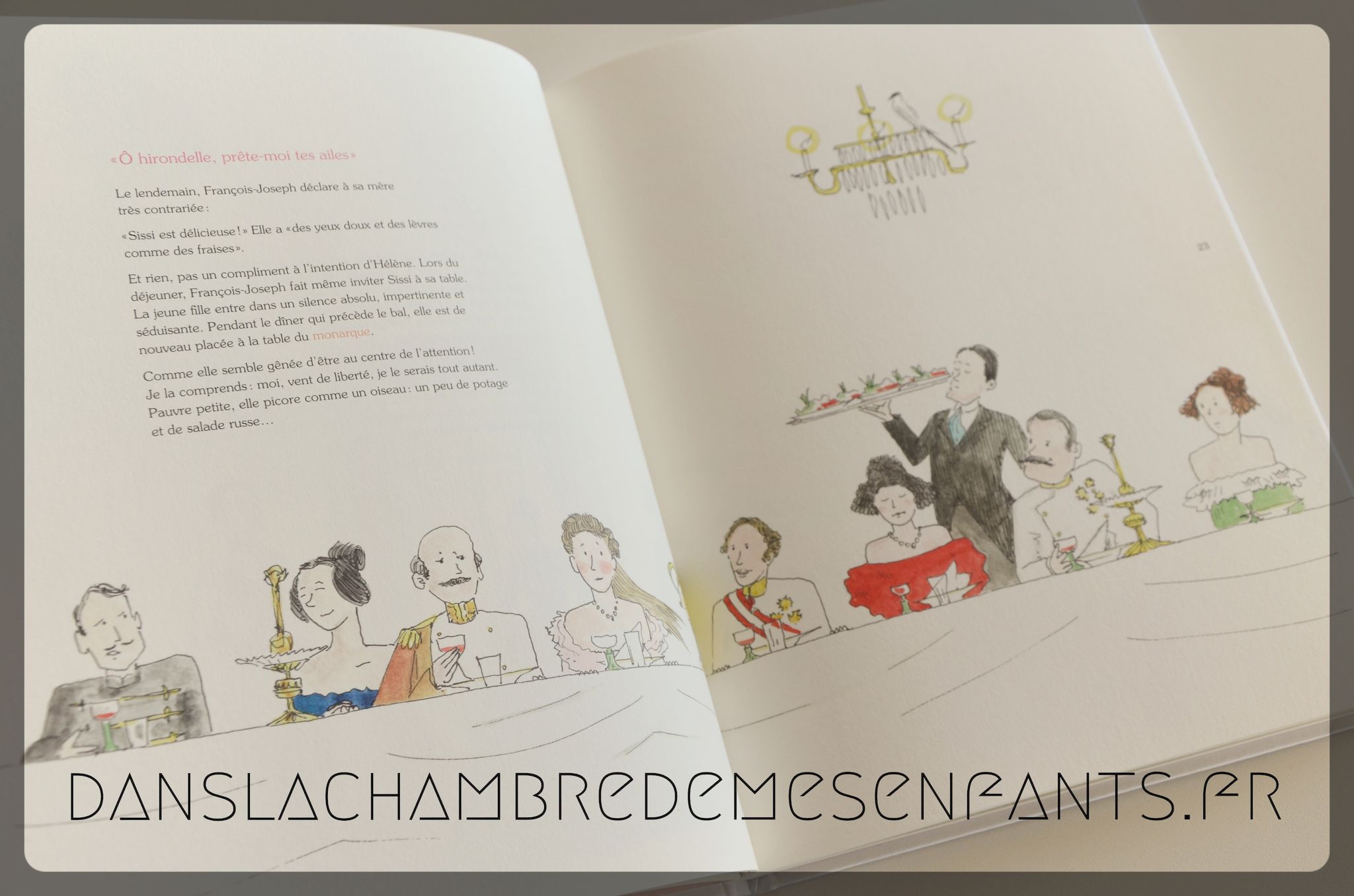 Pour que Sissi entre dans le monde imaginaire des albums jeunesse, c’est son grand ami, un grand témoin de sa vie qui raconte son histoire avec beaucoup d’affection : « Je suis le vent qui souffle le froid et le chaud, qui ignore le temps et se coule en tous lieux. Je vais vous raconter l’histoire d’une princesse aussi libre que moi, devenue impératrice d’Autriche… ». Les illustrations adopte un style épuré et tiennent une grande place aux côtés d’un texte reprenant des épisodes de sa vie à la façon de courtes nouvelles.