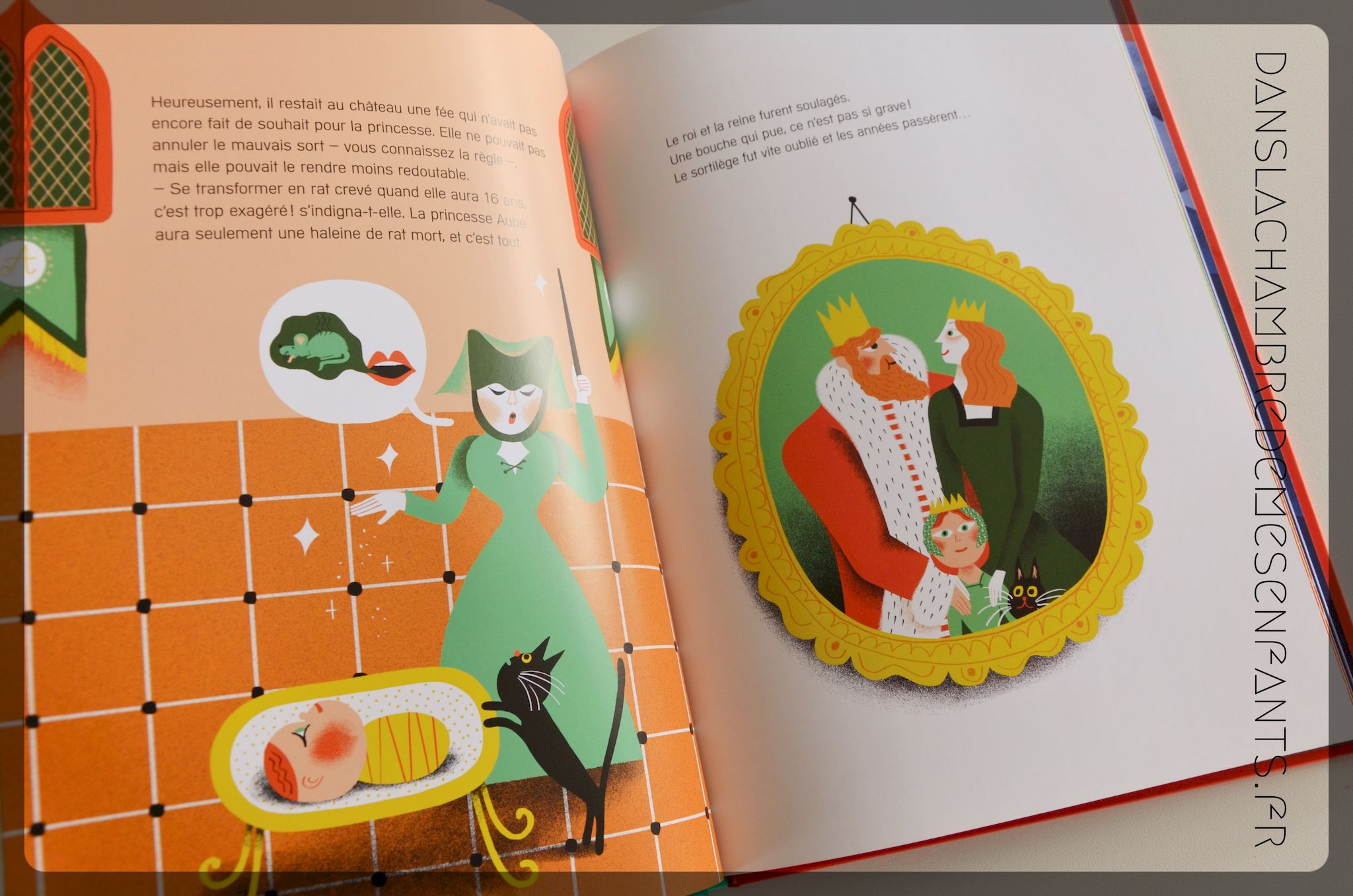 C’est ainsi que le conte présente une princesse qui ne peut s’empêcher de s’endormir partout (soutenue par sa petite sœur dégourdie), ou qui a une très mauvaise haleine (et un prince imparfait… à première vue) et même qui est une petite sorcière (mettant bien en évidence l’acceptation des différences). Un petit changement bouleverse totalement l’histoire et transforme les personnages, toujours avec beaucoup d’humour. Une postface reprend l’histoire de conte, son historique et ces réécritures, invitant à faire de même.