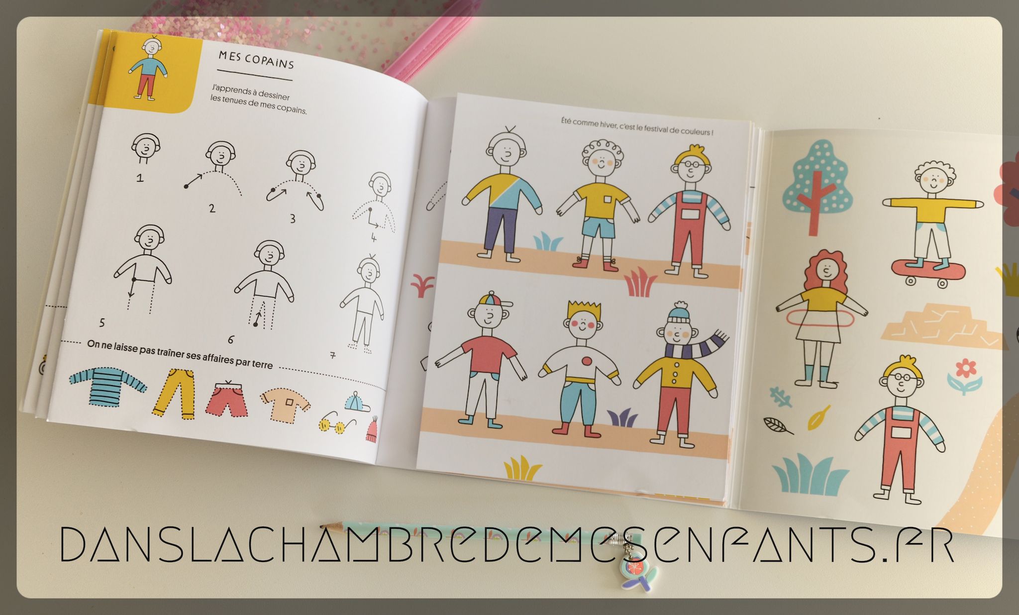 Cet ouvrage accompagne les tout-petits, dès 4 ans voire 5 ans, pour apprendre à dessiner simplement avec un format particulier. En effet, les modèles sont repris sur la 2ème de couverture ainsi chaque double page dispose d’un rabat pour développer, sur un même plan, le mode opératoire, l’espace de dessin à réaliser et les modèles. Il s’agit de dessiner la tête d’un garçon, puis d’une fille, ensuite de la tête au pied, puis en mouvement. Le dessin est décomposé en 6 étapes avec le sens du tracé selon des pointillés.