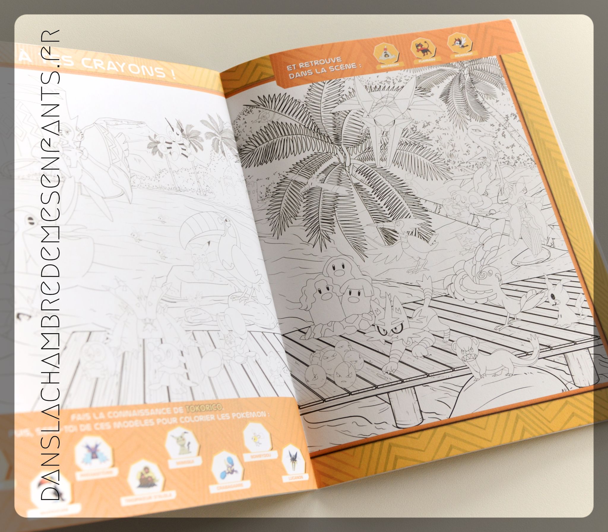 Retour à Alola pour un autre type de jeu : le coloriage, tout en repérant des Pokémon. En effet, ce cahier propose des scènes de cherche et trouve, la base de la collection, et de mettre en couleur les personnages, voire la scène entière. Cela permet d’y consacrer peu de temps sinon un long moment calme, tout en stimulant l’observation.