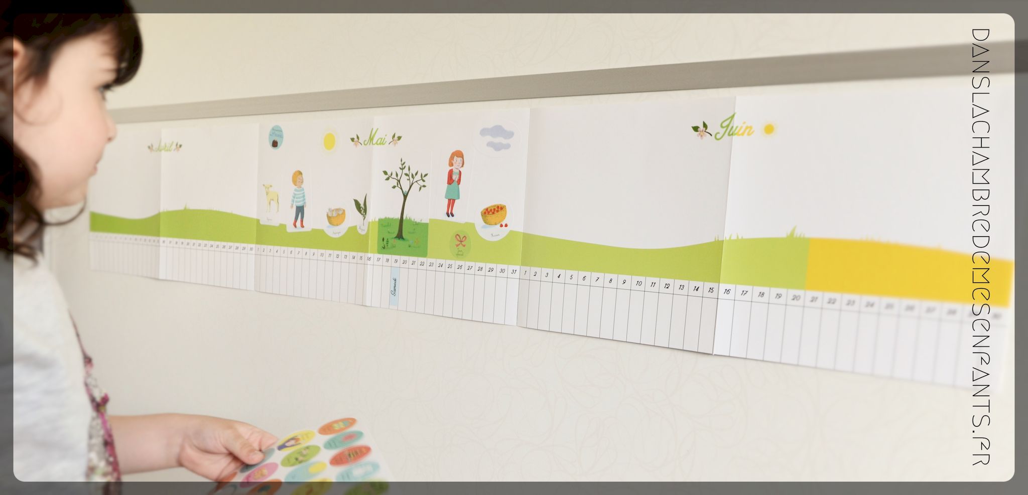 Ce support me rappelle la frise de l’école mais avec les petits autocollants personnels (anniversaire de…). Ce n’est pas un outil qui se veut innovant mais assez simple et pertinent pour donner forme à ces notions que nous suivons, et qui évoluent, au jour le jour. J’avoue que le format de la frise (1 trimestre : 117 cm x 19 cm) n’est pas facile à placer car l’activité trouve son intérêt si la frise est affichée en permanence. J’ai fort heureusement trouvé une place qui vient tout juste de se libérer avec le départ de la licorne Papuche en papier sur la porte du placard, en fixant un trimestre avec de la Patafix. Passé ce détail, je suis heureuse de voir le bon accueil qu’Emi lui a réservé et sa grande motivation. Je l’accompagne ainsi tous les matins, mettant en place un rituel qui participe à l’acquisition des récurrences du calendrier.