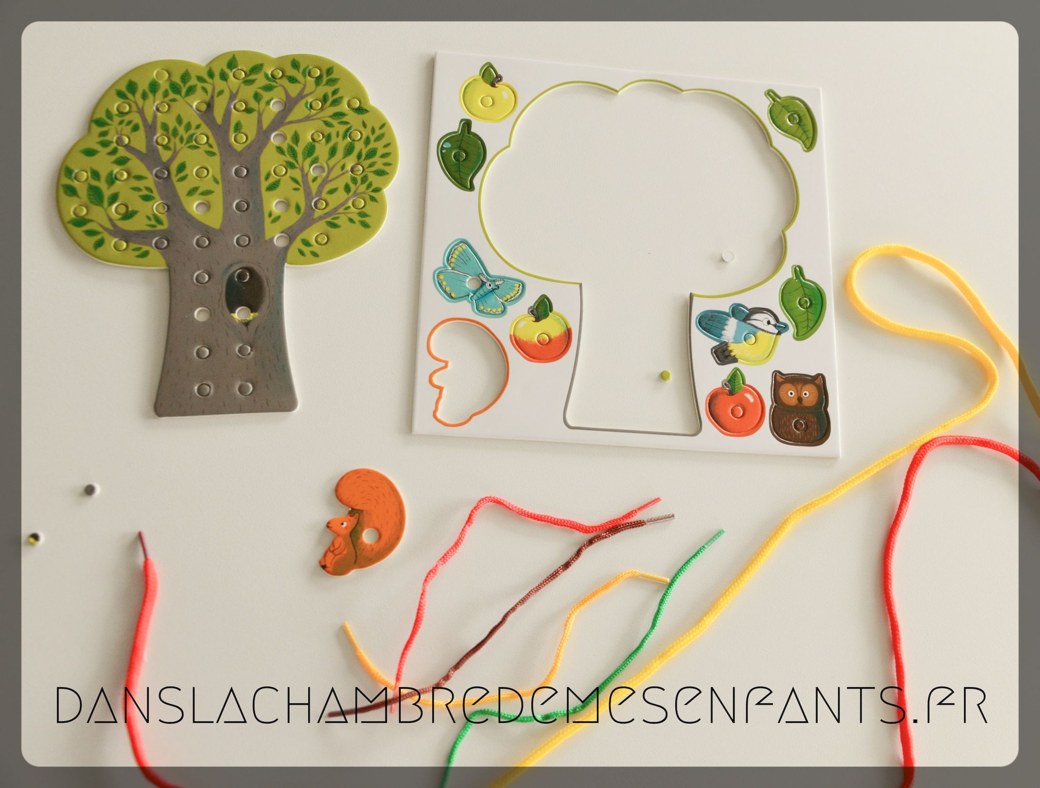 - des éléments cartonnés, colorés, perforés : 1 arbre, 3 feuilles, 3 pommes, 1 oiseau, 1 hibou, 1 papillon et 1 écureuil.