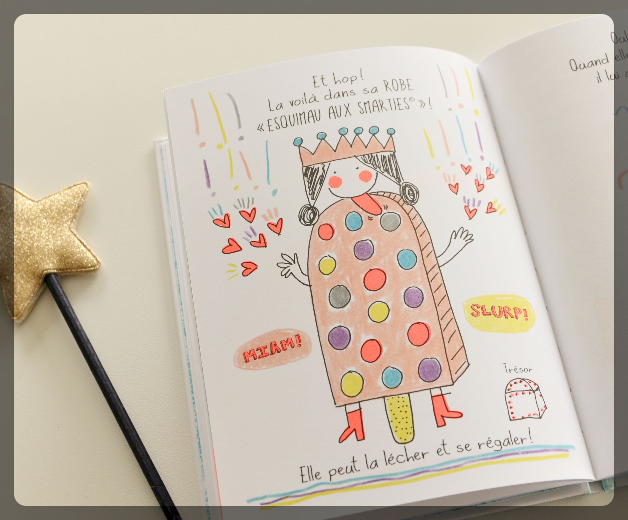 L’avis des enfants : Emi, 3 ans, a de suite été séduite par le sujet et la couverture. Le peps et la fantaisie des illustrations ont captivé son attention et l’histoire l’a vraiment fait rigoler. Elle n’a peut-être pas conscience du second degré mais elle prend plaisir à revoir ce livre. Sa préférée ? La robe esquimau aux Smarties bien sûr !