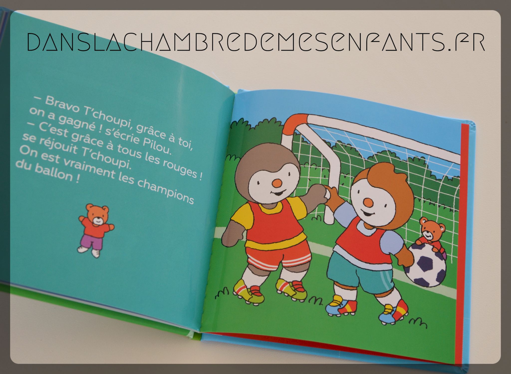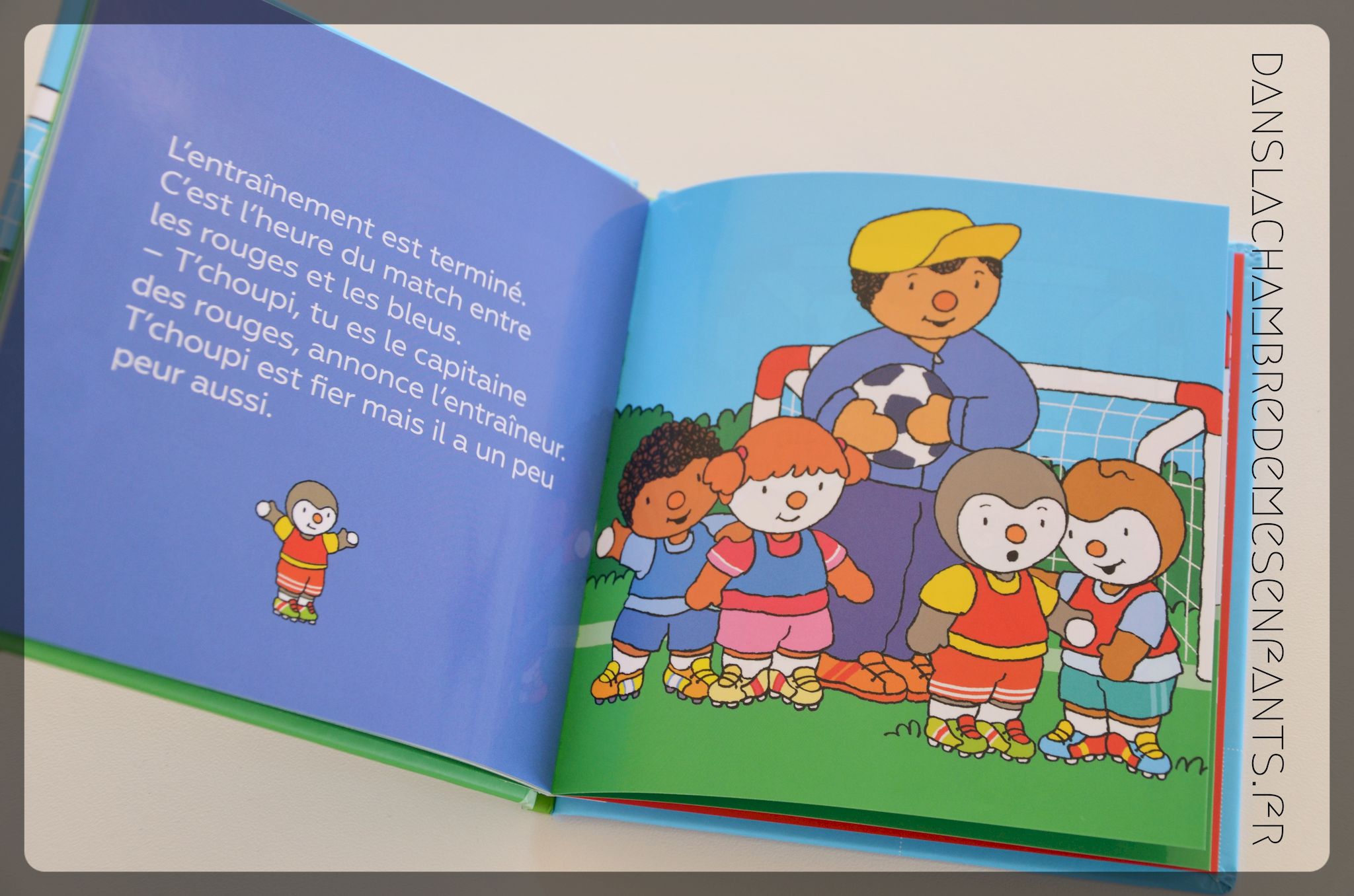 Peut-être inspiré par la coupe du Monde de football, T’choupi s’intéresse à ce sport. A travers sa journée d’entraînement, on découvre avec lui quelques bases (tenue, échauffement, passes…) comme précédemment avec le tennis. Cet ouvrage se lit surtout pour suivre les aventures de T’choupi avec ses copains et, bien entendu, Doudou. S’il n’arrive pas à mettre un but, c’est après s’être entrainé et, en équipe, que la réussite arrive.