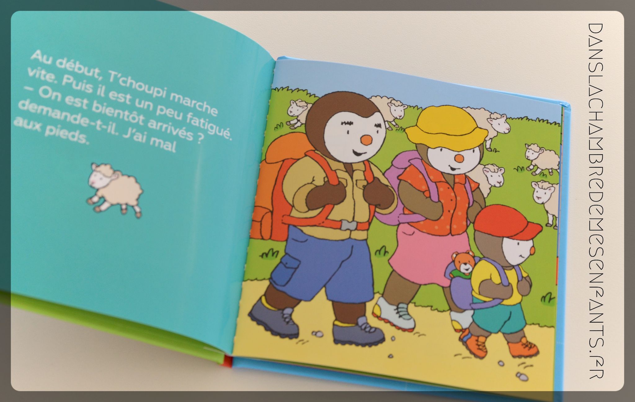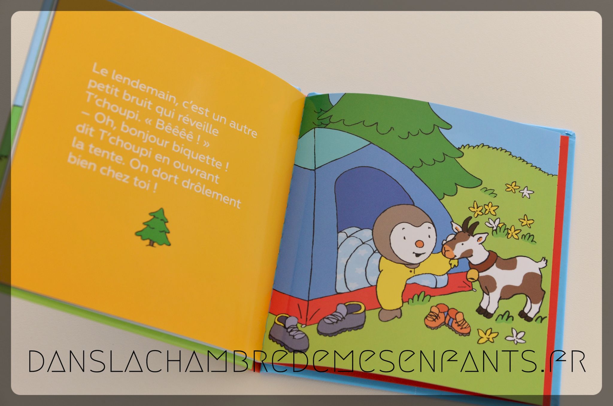 Les vacances arrivant, T’choupi en profite pour partir en famille à la montagne. La journée de randonnée le fatigue vite mais la persévérance lui permet de découvrir un beau paysage. Il s’intéresse aussi à l’amusante expérience du camping. Cette vie proche de la nature lui plaît très vite et, pour qu’il ne reste pas sur la déception du grand départ, ses parents lui proposent de prolonger l’aventure à la maison.