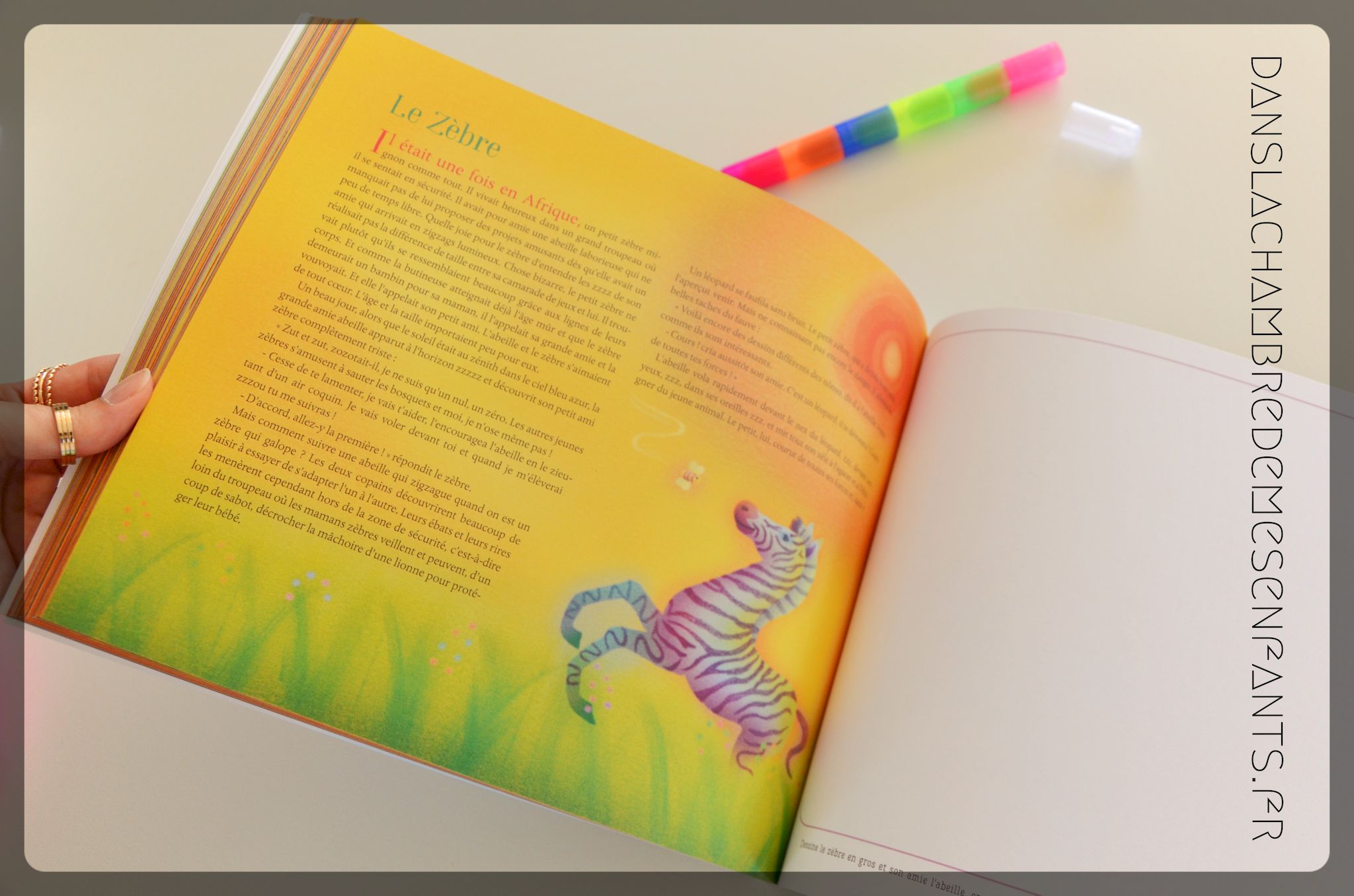 Le format est toujours aussi agréable, notamment grâce à des illustrations aux tons pastel. Le texte des histoires est très développé et les pages blanches sont accompagnées d’un commentaire à faire à l’enfant pour l’inviter à dessiner les lettres.