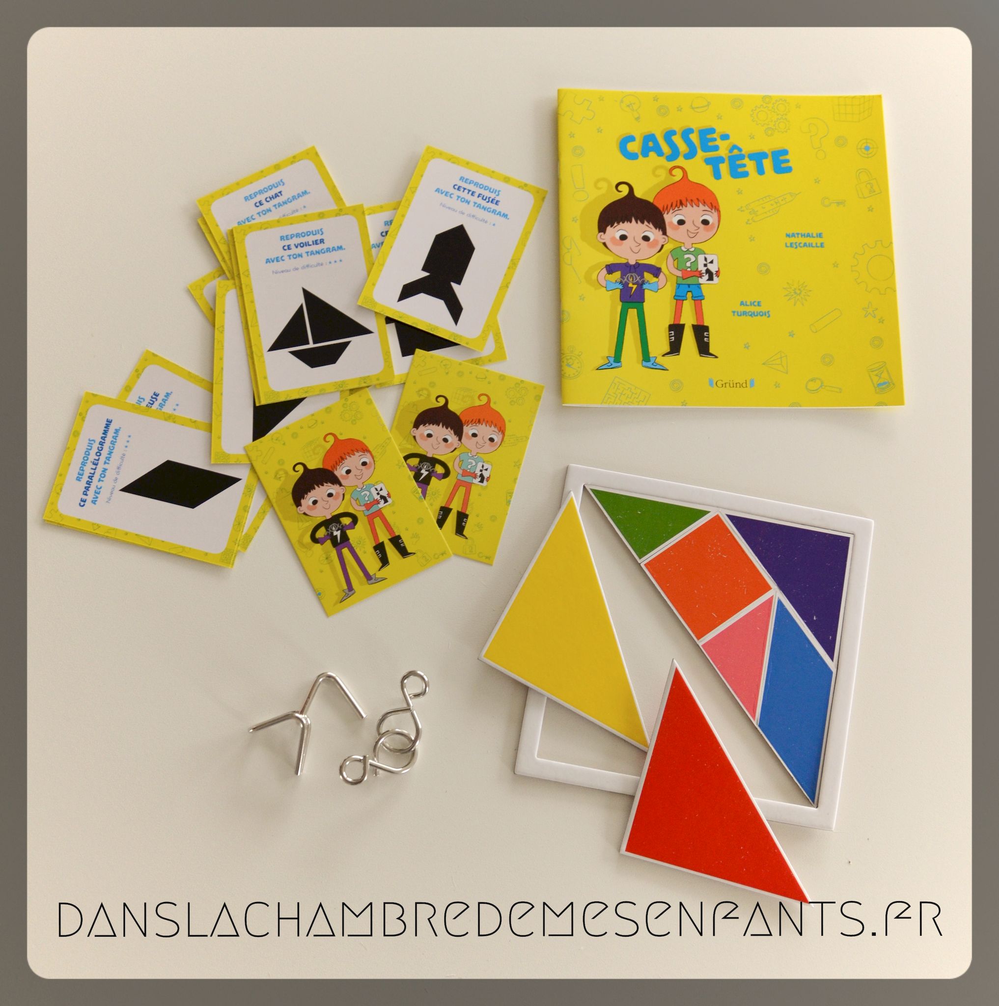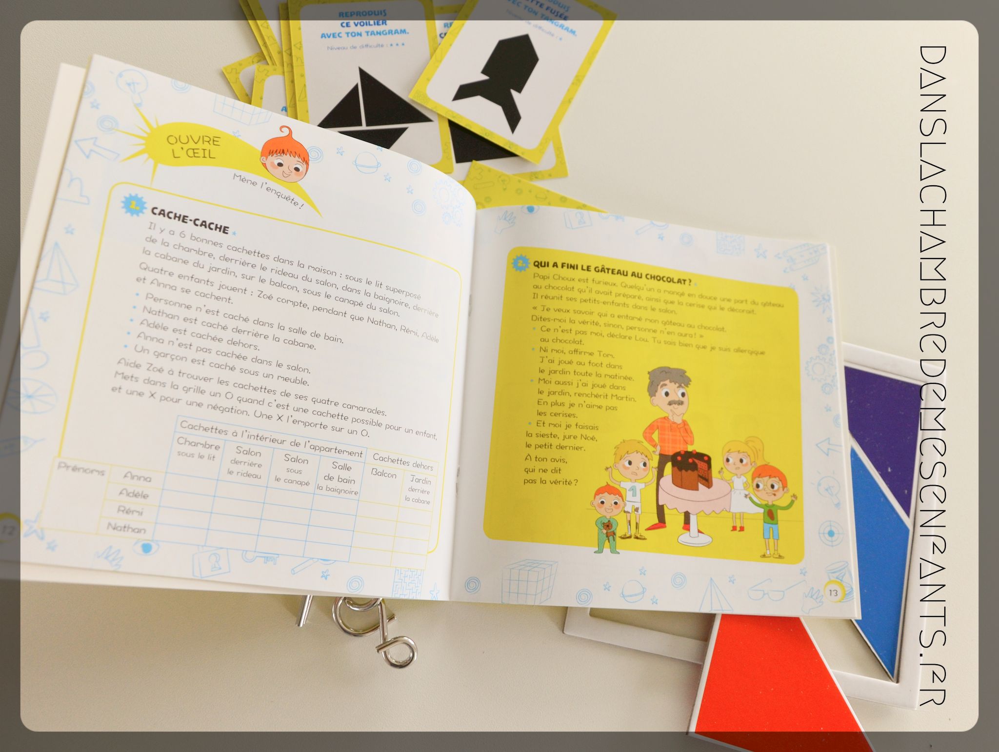 Sous le même format, on retrouve des ateliers axés sur des jeux de réflexion et de logique avec un livret, 20 cartes de jeux, un tangram (7 pièces) et 2 casse-tête en métal, et ce selon 3 catégories :