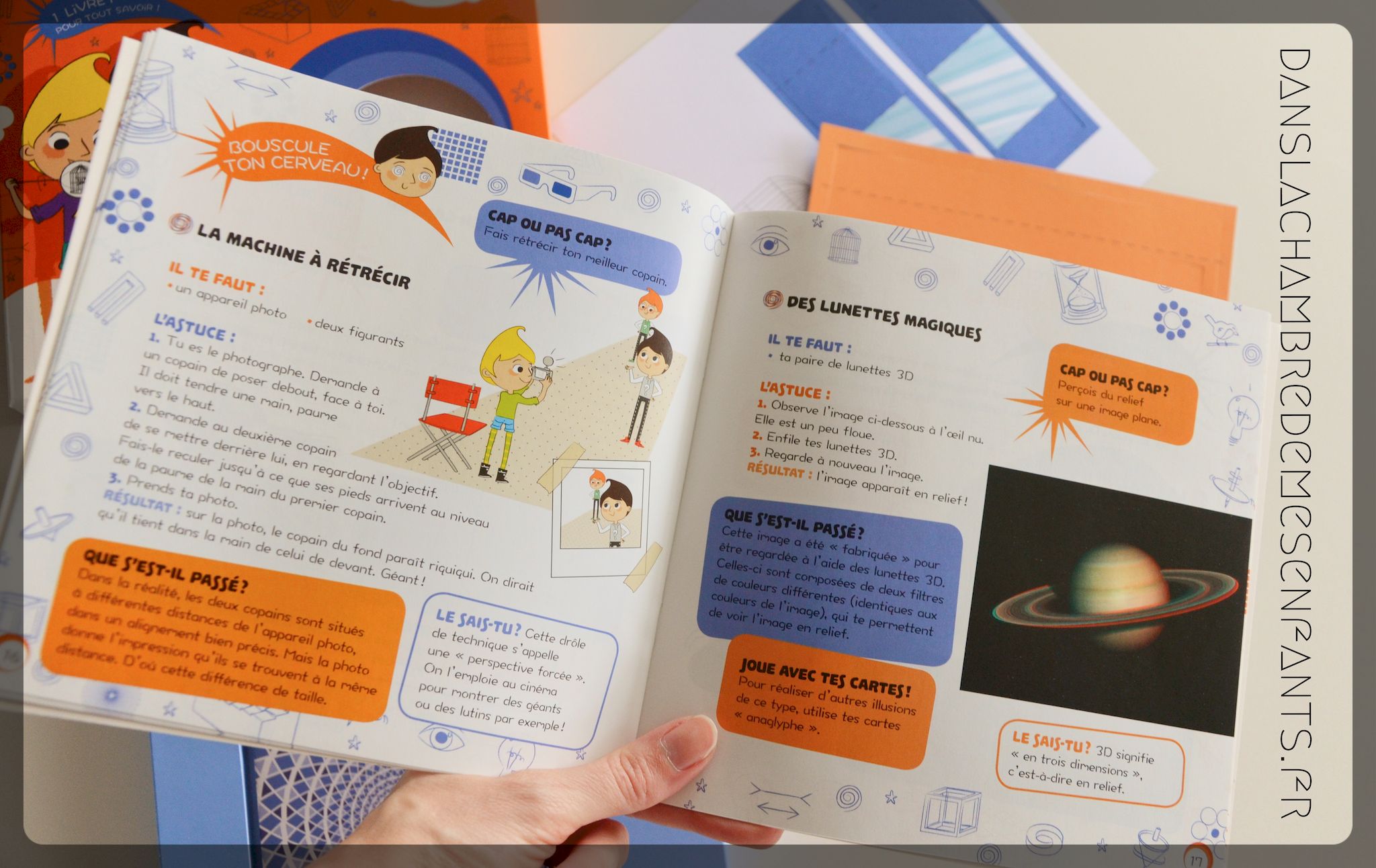 - Bouscule ton cerveau (ex : « La couleur imaginaire : Rends le carré rose plus foncé […] Le cerveau modifie la couleur d’un objet en fonction de ce qui l’entoure […] »).