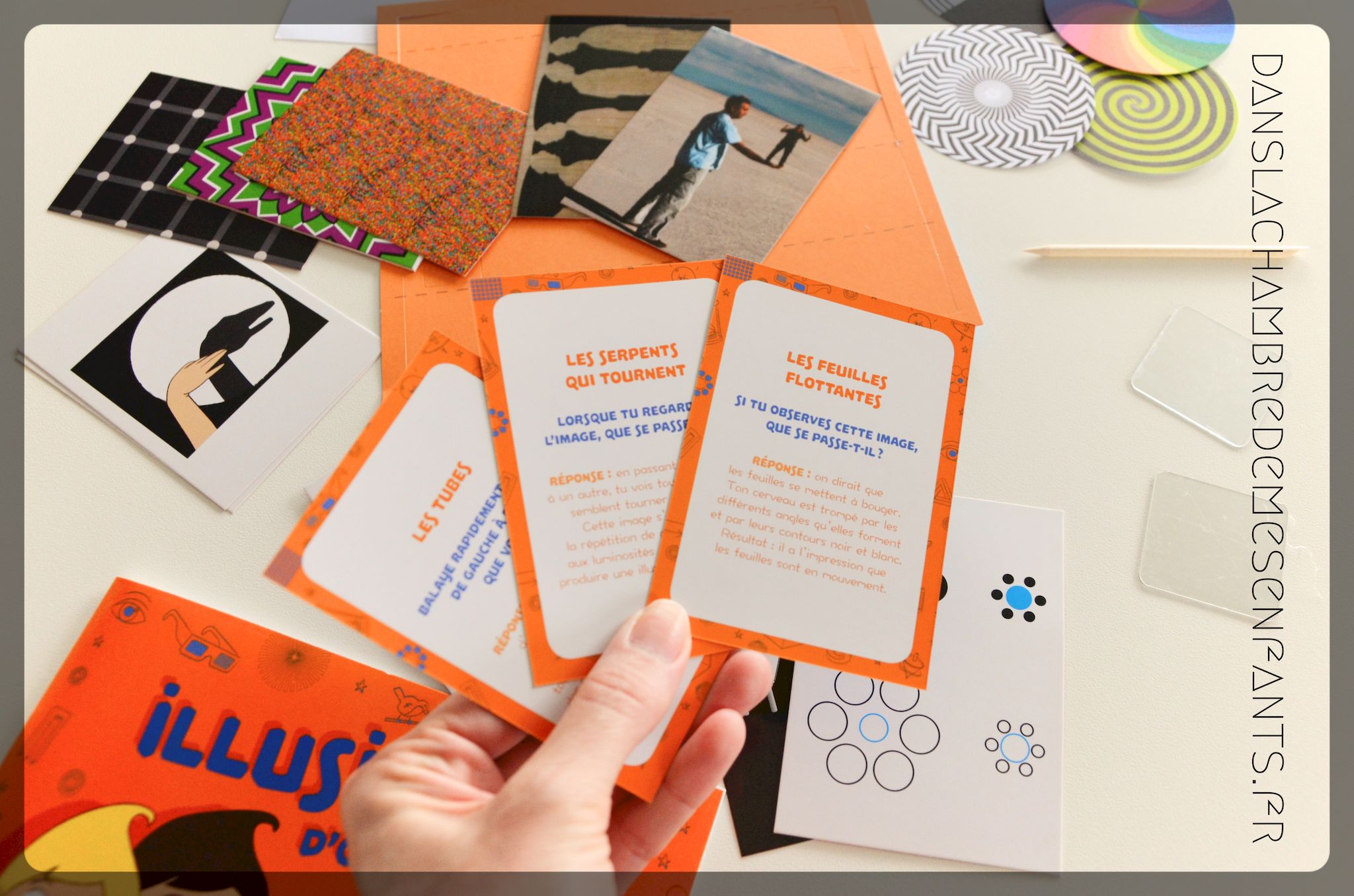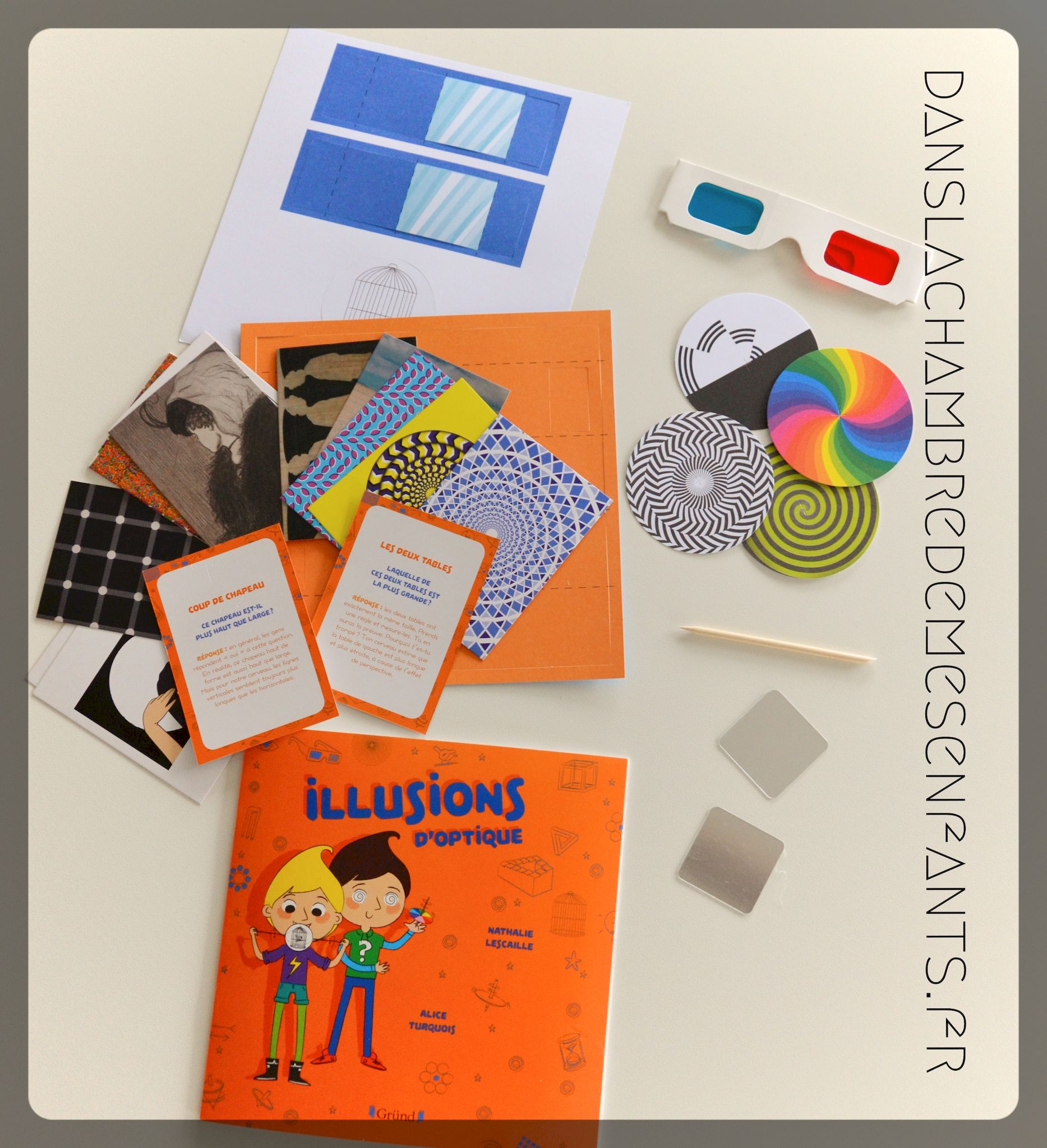 Pour cela, un livret de 24 pages, illustré et mis en couleurs, propose des activités pour constater et comprendre, progressivement, le fonctionnement de l’optique à l’appui d’outils fournis (1 bâtonnet et 4 disques [toupie], 20 cartes d’illusions d’optique, des lunettes 3D et 2 planches de papier prédécoupées et 2 petits miroirs pour la fabrication d’un périscope).