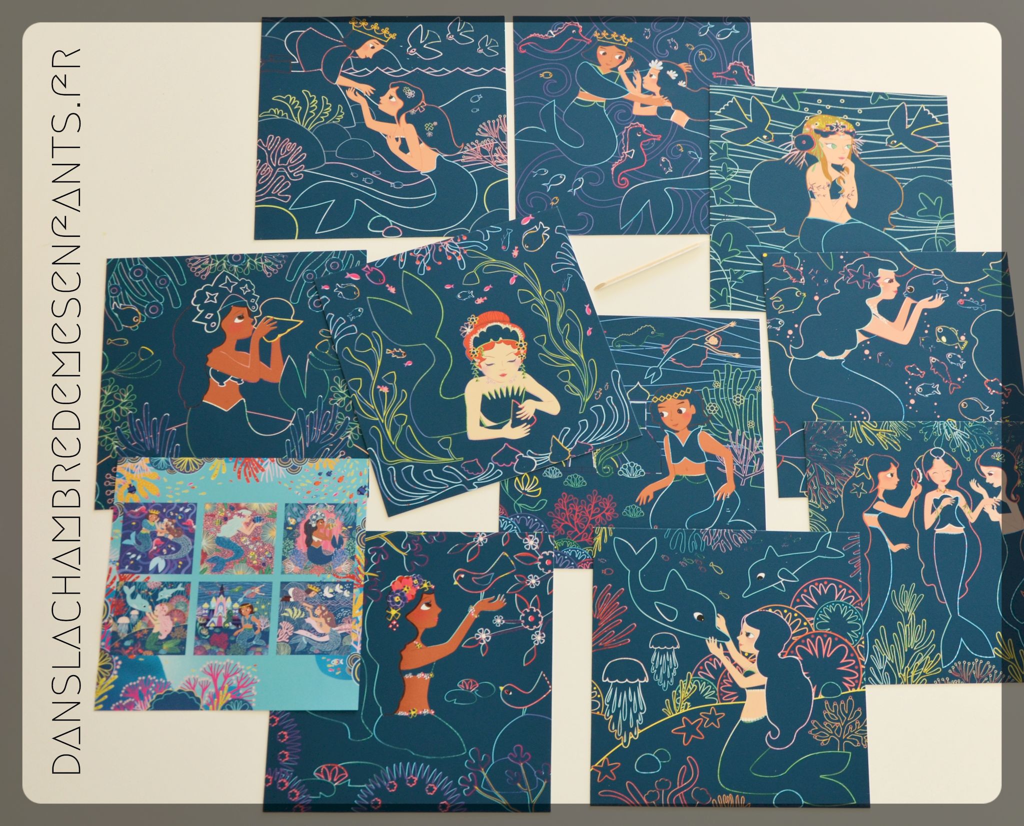L’avis des enfants : Emi, 3,5 ans, n’a pas perdu de temps pour s’y mettre ! Elle m’a confié avoir une préférence pour les cartes à gratter sur les licornes mais je sais qu’elle a un faible pour les sirènes aussi (on a vraiment hésité à les choisir pour le thème de son anniversaire). Elle a pris son temps pour revenir sur le même tableau à plusieurs occasions, même au bord de la piscine, et elle préfère gratter toute la surface des dessins. Je l’ai aidée pour faire varier les traits de grattage et pour qu’elle ne se décourage pas au passage des endroits les plus délicats (étroits). Elle y prend beaucoup de plaisir et les illustrations lui ont énormément plu.