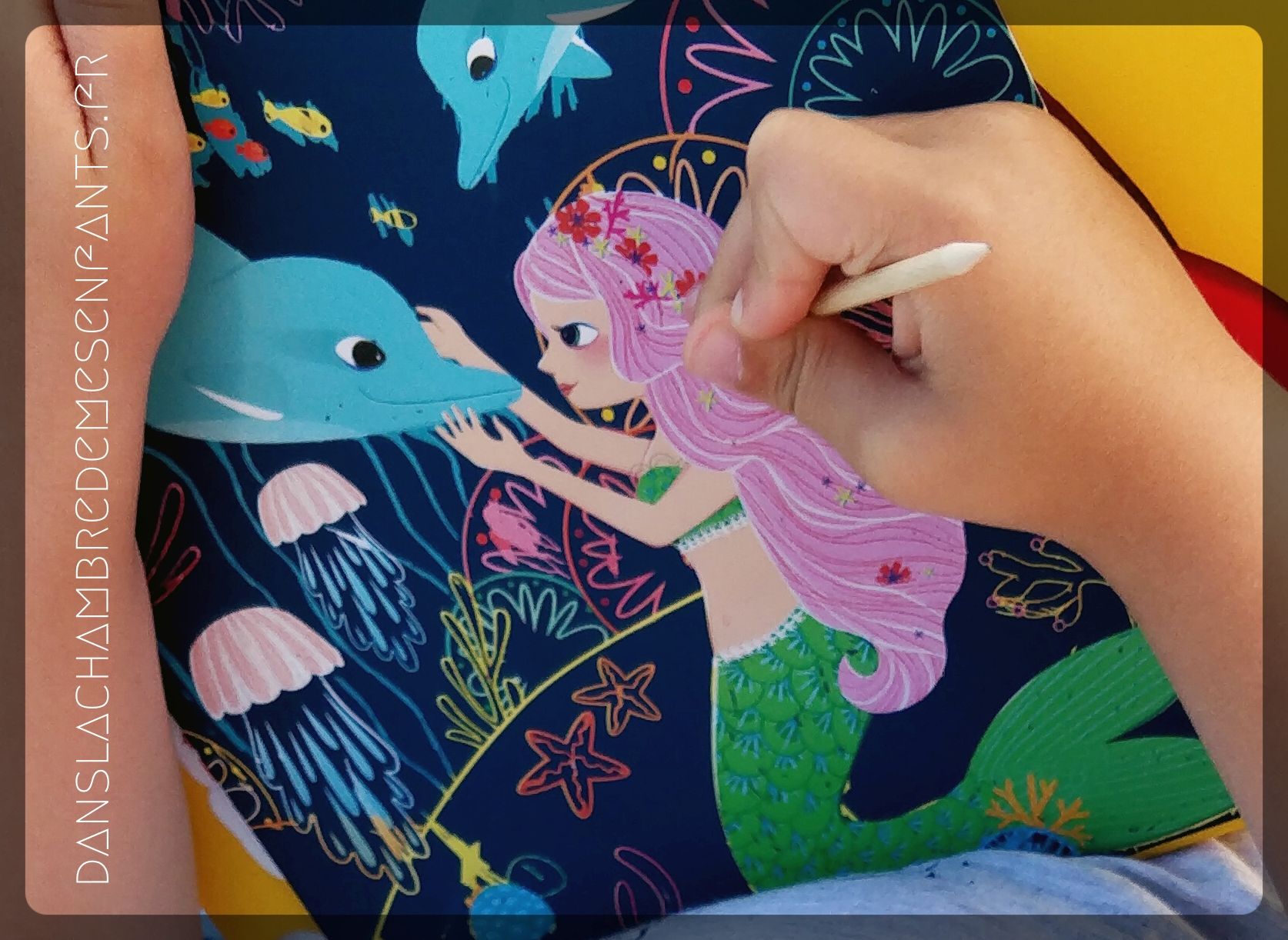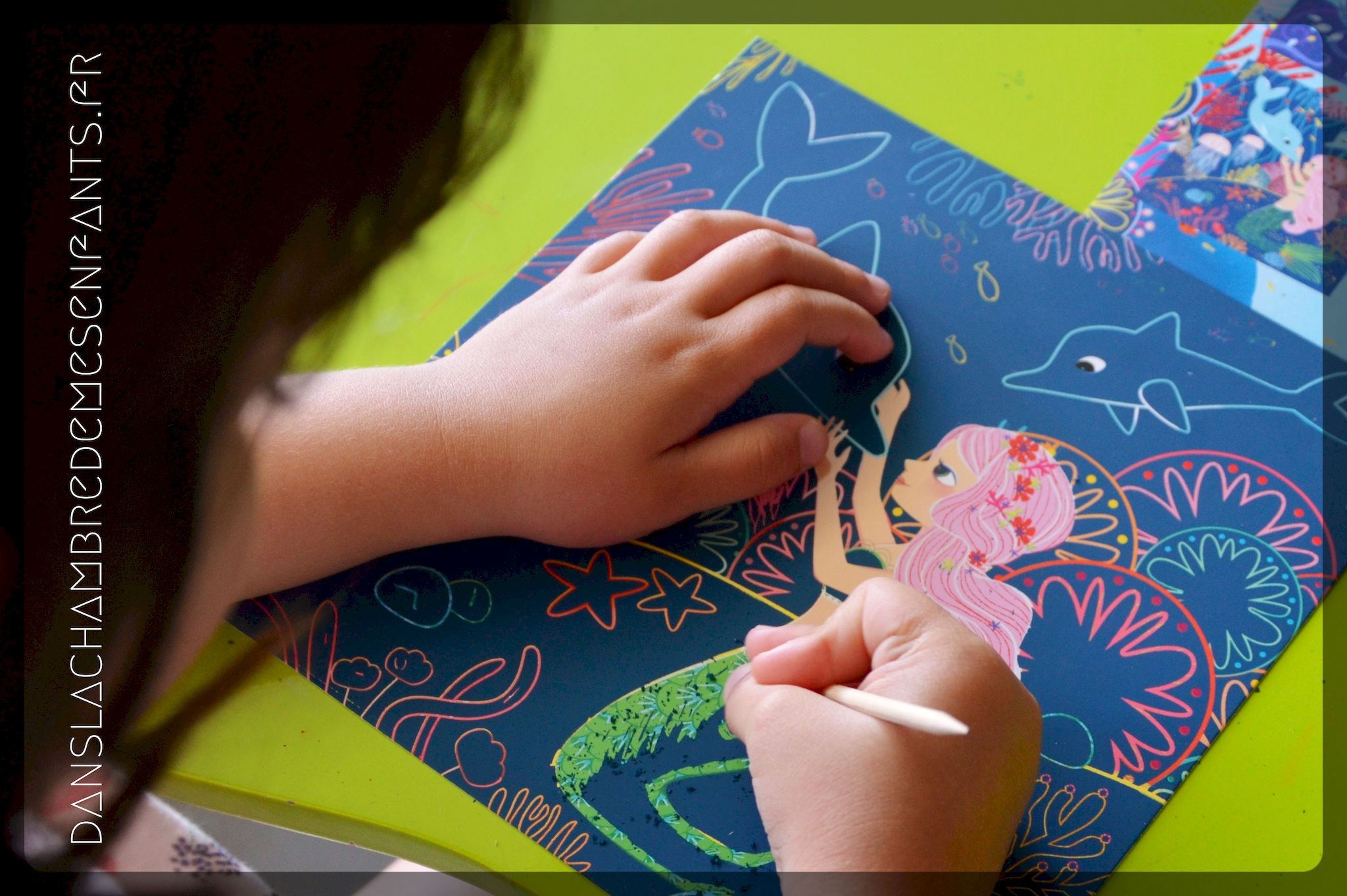 Sirènes sur fonds marins, princesses sirènes, couples royaux… peau mâte, chevelure rousse, écailles de couleurs… les lignes pré-dessinées et les couleurs pré-imprimées permettent de composer de jolies scènes très contrastées et graphiques. Après avoir constaté l’engouement et la dextérité de ma fille, je constate que c’est une activité qui peut plaire dès 3,5/4 ans même si les traits de grattage sont trop appuyés, et à partir de 5 ans pour plus de maîtrise et de créativité en donnant libre court à l’imagination par le dessin de formes et de motifs.