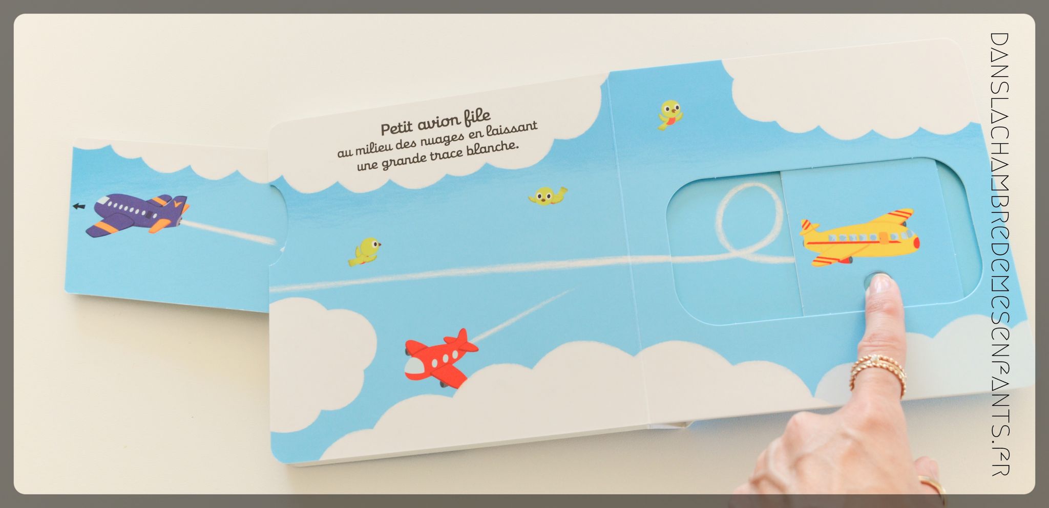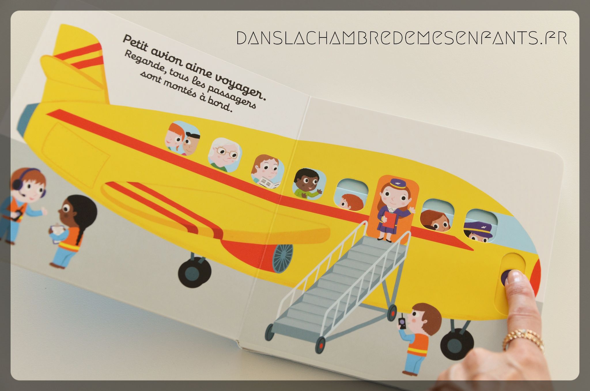 « Bonjour petit avion ! » nous invite à suivre petite avion durant un voyage : montée des passagers, chargement des bagages en soute, décollage, vol au milieu des nuages, arrivée à l’aéroport pour une bonne nuit. Dès la couverture, on découvre une animation en faisant bouger l’avion en plein vol. Ce titre est très pertinent puisque l’avion est un véhicule qui intéresse beaucoup d’enfants, surtout s’il est dans leur actualité notamment en cette période de vacances. Dans ce dernier cas, cela permet de préparer les enfants à ce grand voyage et de les rassurer en suivant les étapes à travers ce livre très accueillant.