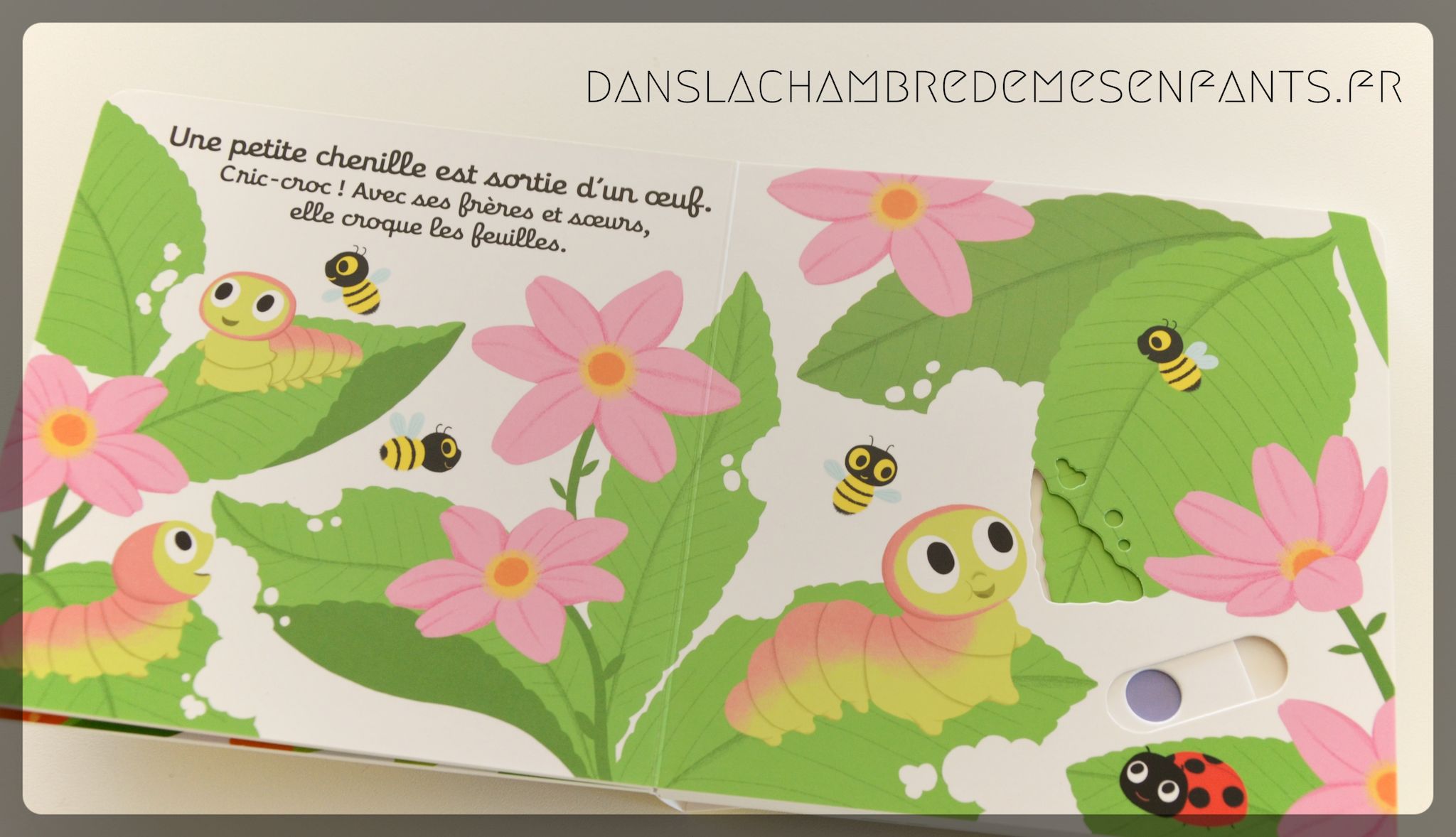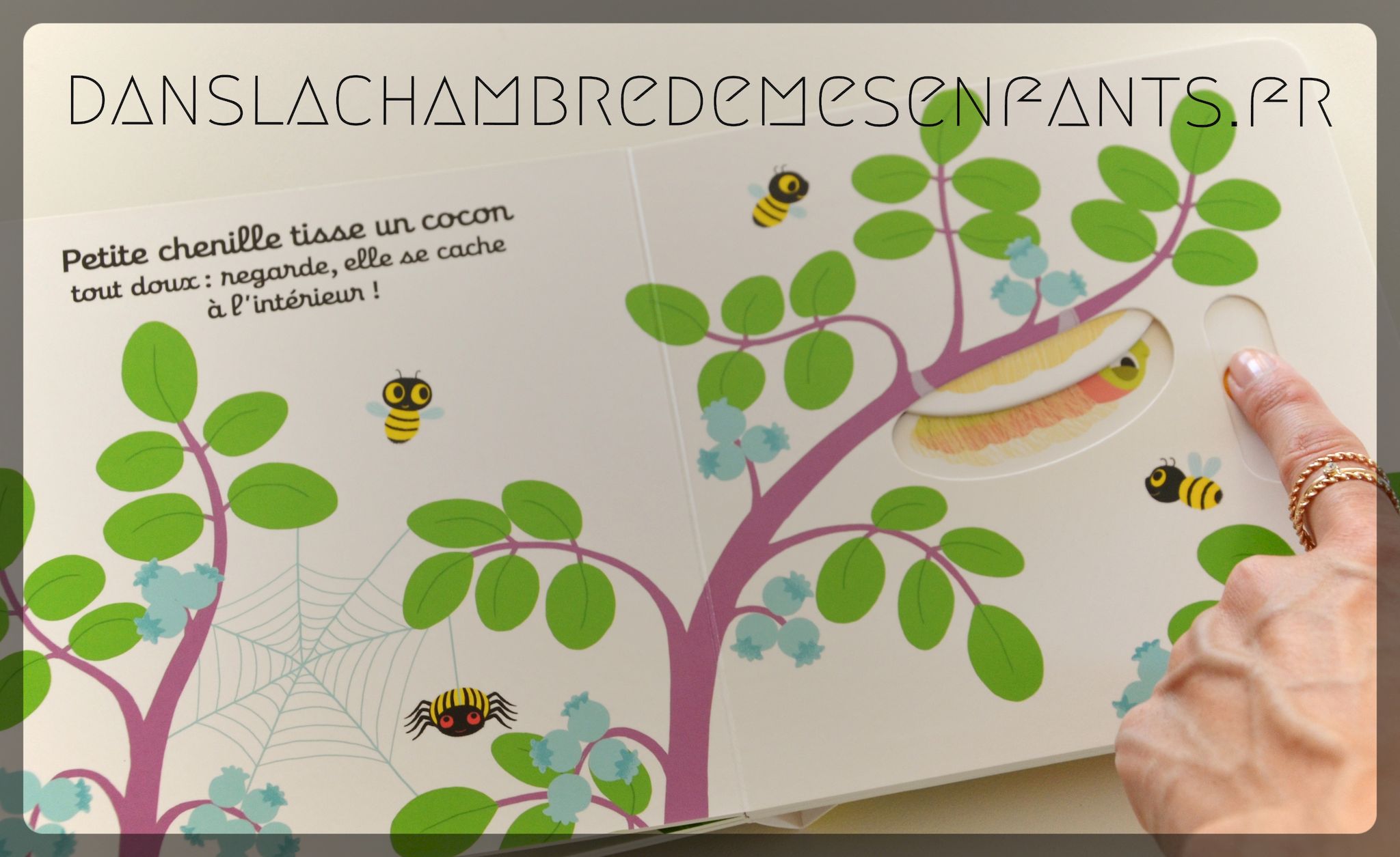 « Bonjour petit papillon » nous présente Maman papillon le jour de la ponte de ses œufs que l’on retrouve alors devenus chenilles croquant des feuilles, puis un cocon, devenant ensuite papillon qui s’envole retrouver d’autres beaux papillons balbutiant des fleurs. C’est un joli ouvrage invitant à s’attarder sur ce fascinant insecte se dévoilant davantage encore durant les beaux jours. J’aime particulièrement l’animation de la couverture : un papillon a faire bouger dans tous les sens entre deux massifs de fleurs.