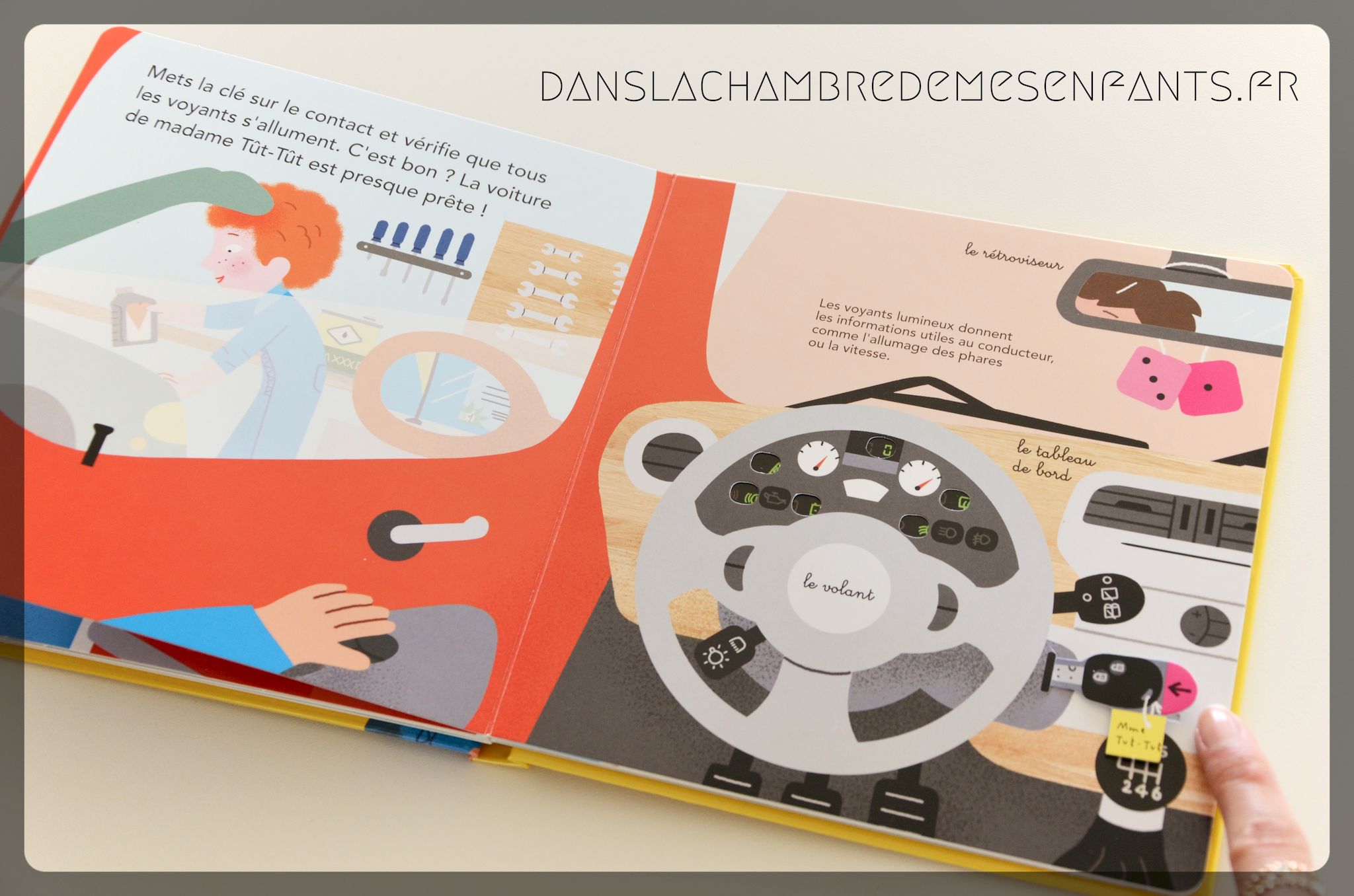 L’avis des enfants : Emi, 3 ans, aime beaucoup cette collection même si elle abîme vite les petits éléments, d’autant plus que la double page avec le tableau de bord a sa préférence. On s’est amusée à regarder le livre ensemble en faisant les bruitages et elle le parcourt aussi toute seule, sortant souvent les autres titres de sa bibliothèque pour poursuivre le jeu.
