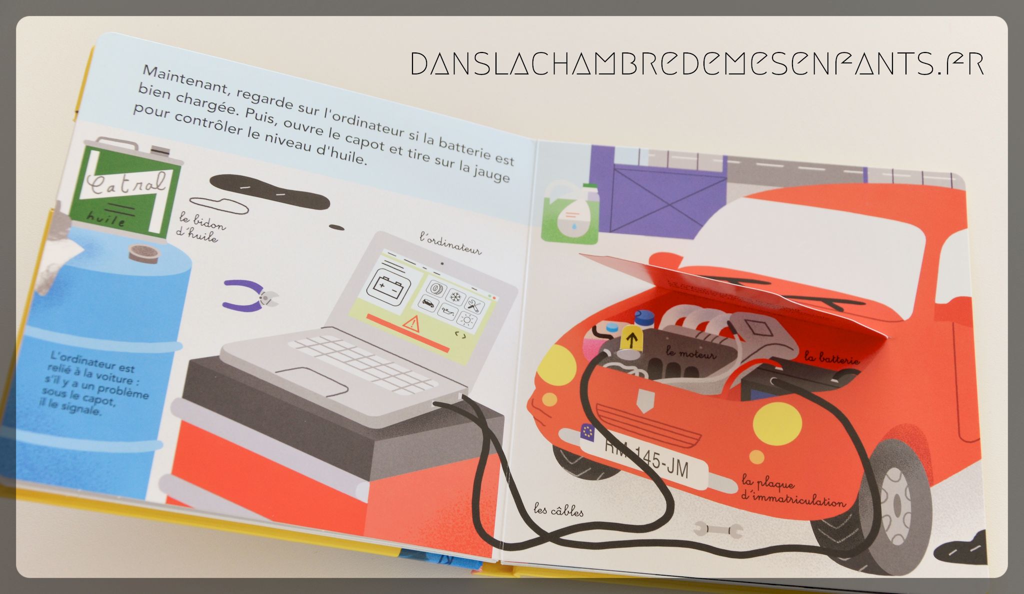 Petit retour sur une collection qui a eu beaucoup de succès dans la chambre de mes enfants avec des livres proposant de jouer à un métier. Ces livres cartonnés comportent des animations pour créer une interactivité avec l’enfant, dès 3 ans. Les illustrations sont modernes et très colorées. Placées en premier plan, elles mettent en valeur les animations à activer avec des languettes colorées comportant une flèche pour indiquer le sens du mouvement à réaliser. Un commentaire présente la scène et interroge directement le lecteur (ex : « Mais une des quatre roues est crevée : peux-tu la changer ? »). Les animations étant cartonnées dont certaines un peu délicates (ex : clé étroite à pousser pour mettre le contact), il est préférable d’adapter l’âge selon la dextérité et la délicatesse de l’enfant.
