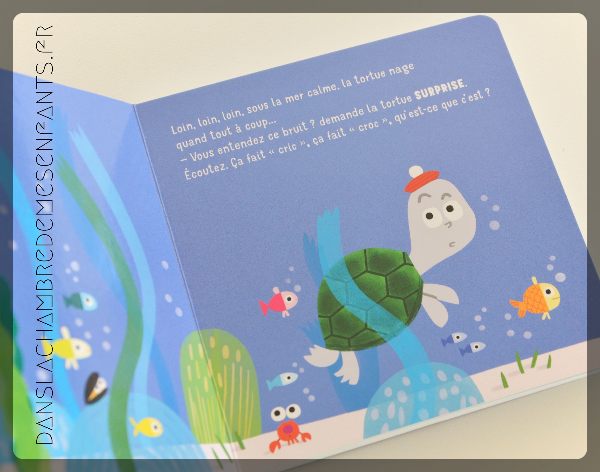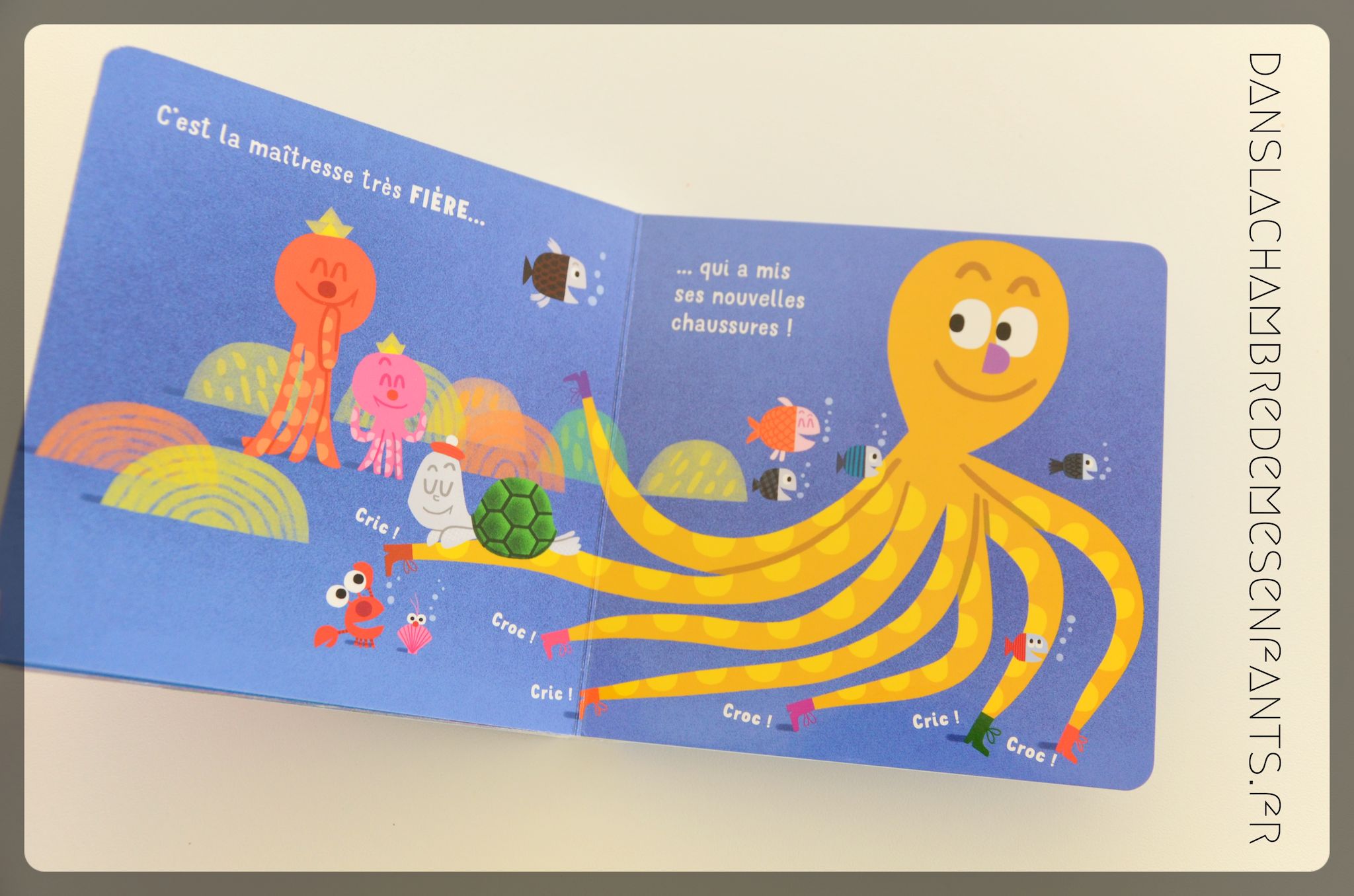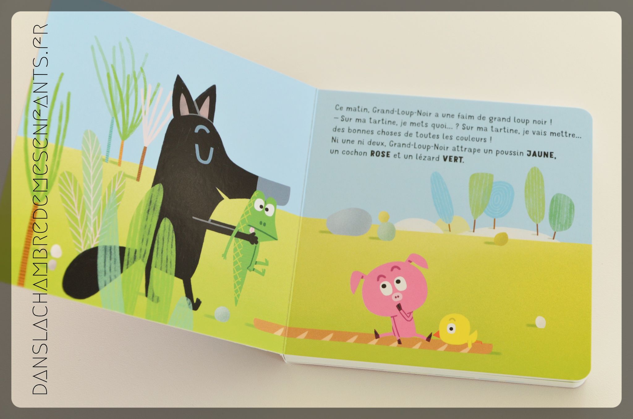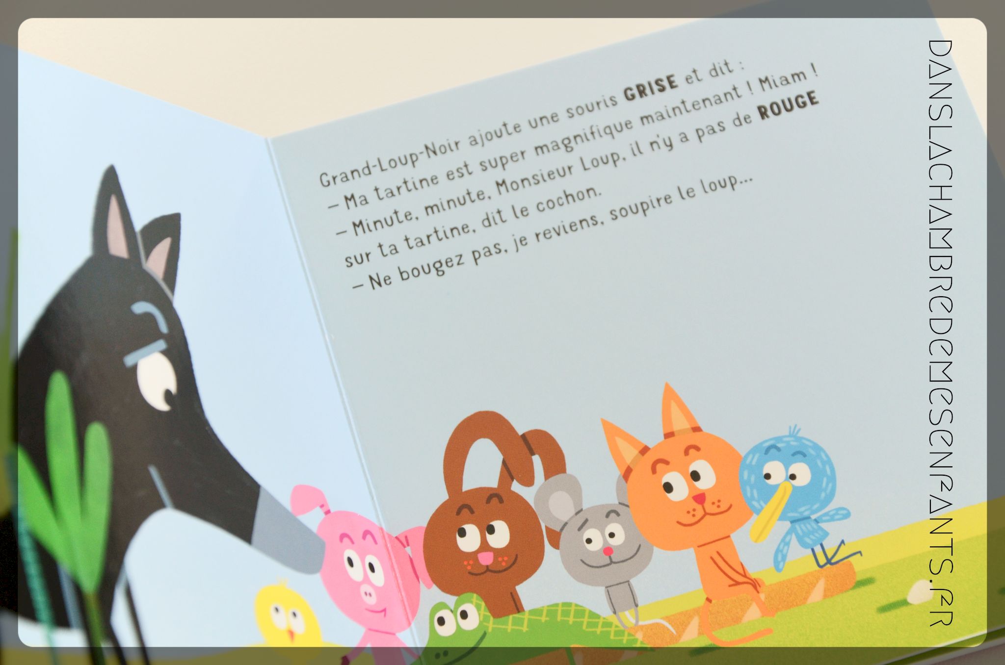 Côté histoire, il nous est proposé de s’attarder sur les émotions avec un bruit sous la mer qui créer de la surprise, de l’inquiétude, de la peur, de la frayeur, de la tristesse et de la colère mais c’est en fait la joie qui termine l’histoire puisqu’il s’agit en fait du bruit des chaussures de la maîtresse pieuvre qui, elle, en est très fière. Le second ouvrage raconte l’histoire d’un Grand-Loup-Noir qui veut mettre sur sa tartine des bonnes choses de toutes les couleurs. Après avoir attrapé de nombreux animaux, son attention est détourné par une ruse de ces derniers qui lui préparent, à la place, une tartine multicolore vegan !