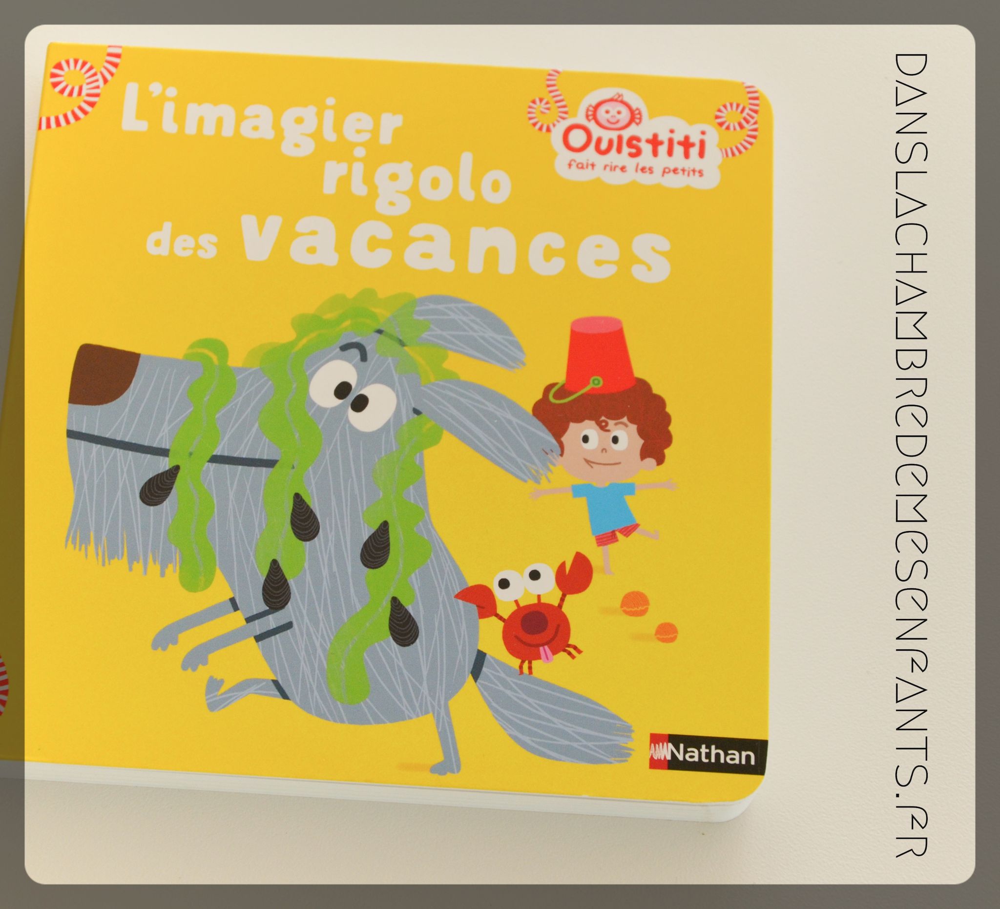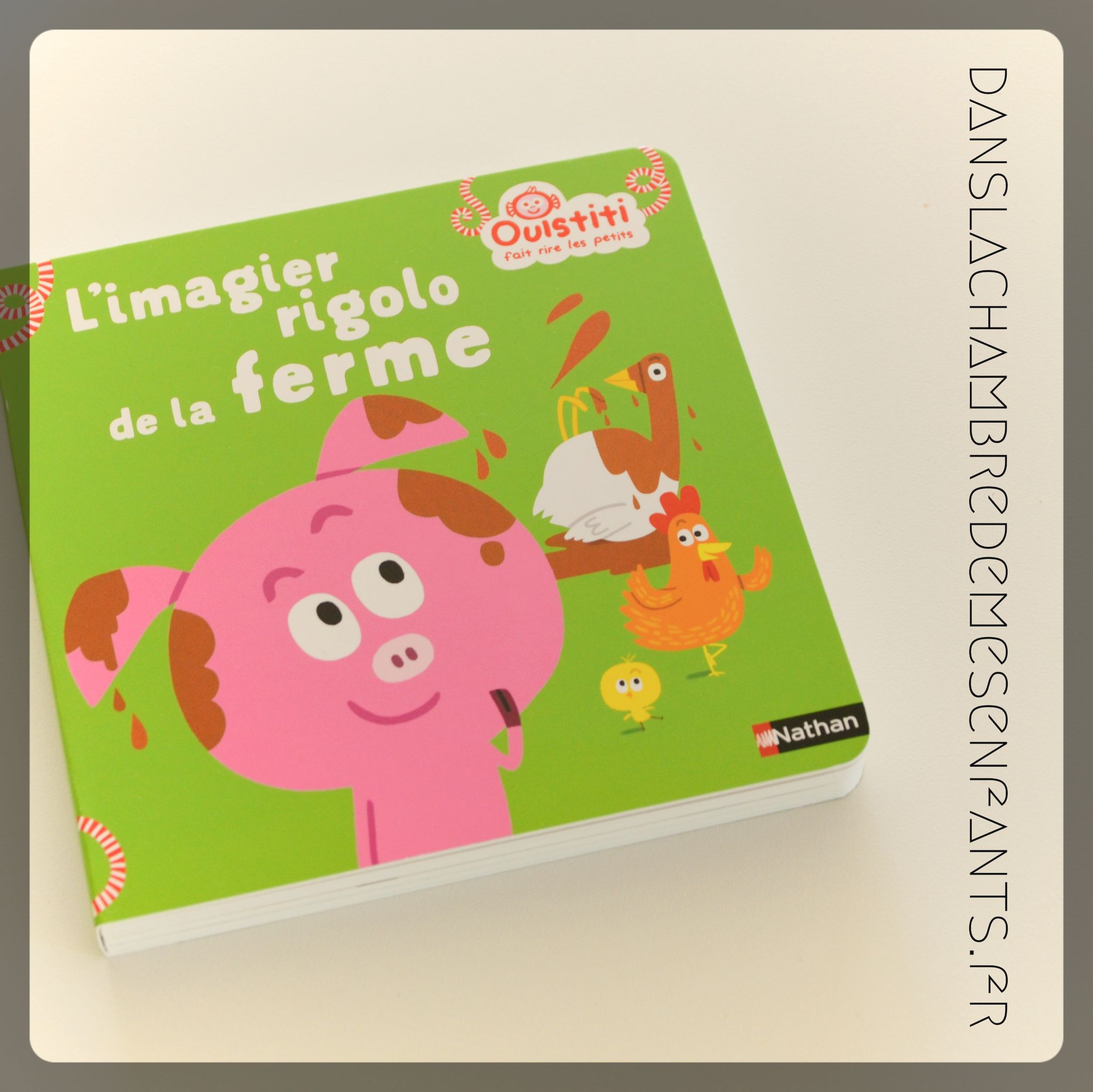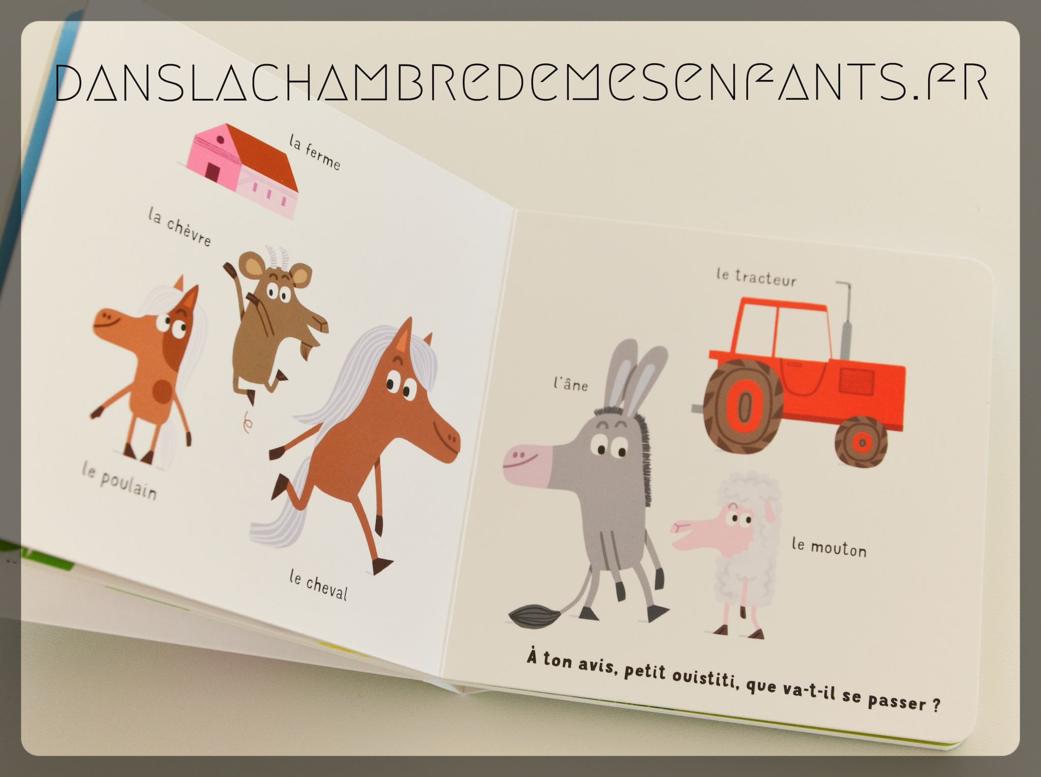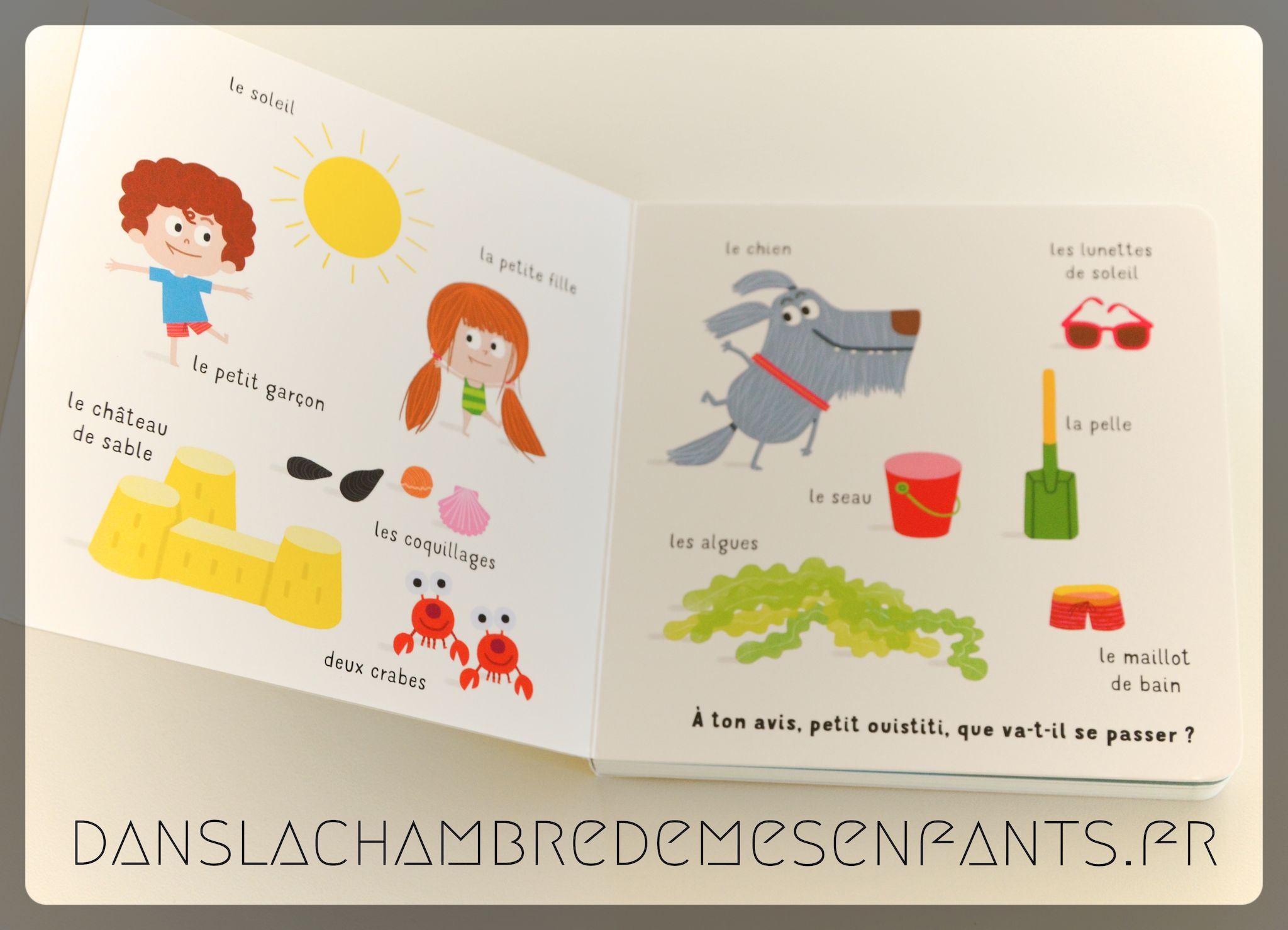 Les premiers titres des imagiers nous emmène à la ferme et en vacances d’été. Les pages de vocabulaire se terminent systématiquement en interrogeant le lecteur : « A ton avis, petit ouistiti, que va-t-il se passer ? », le faisant ainsi participer et l’invitant à imagier lui-même la suite du livre. Ainsi, après avoir observé les fermiers, le cochon, le dindon, l’oie, le canard et la boue… on les découvre couverts de « bouillasse » après un saut de cochon ! Les autres animaux ne manqueront pas de maladresse pour faire rire le lecteur. En vacances, c’est surtout le chien qui provoque les situations amusantes avec des crabes qu’il trouve dans les châteaux de sable, une course après les abeilles, etc.