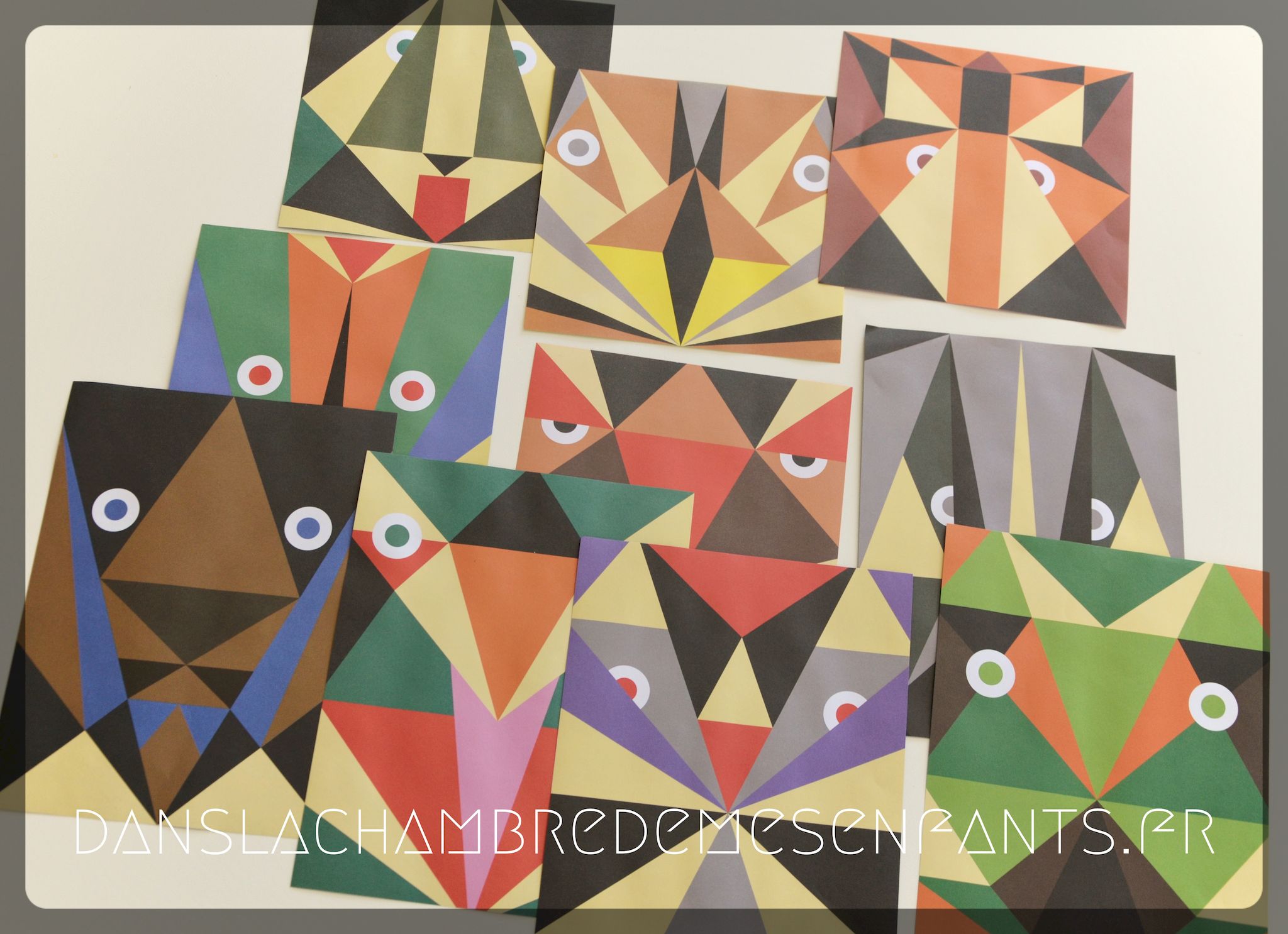 Les feuilles sont décorées, au recto, de formes géométriques rappelant des figures animales et, au verso, de couleurs unies dans les mêmes tons, ce qui est nécessaire pour une bonne compréhension du pliage. Les fiches reprennent en marge les miniatures des feuilles à utiliser selon les 3 modèles, détaillant en étapes numérotées, tout en indiquant la face unie par une teinte jaune et une croix pour repère.