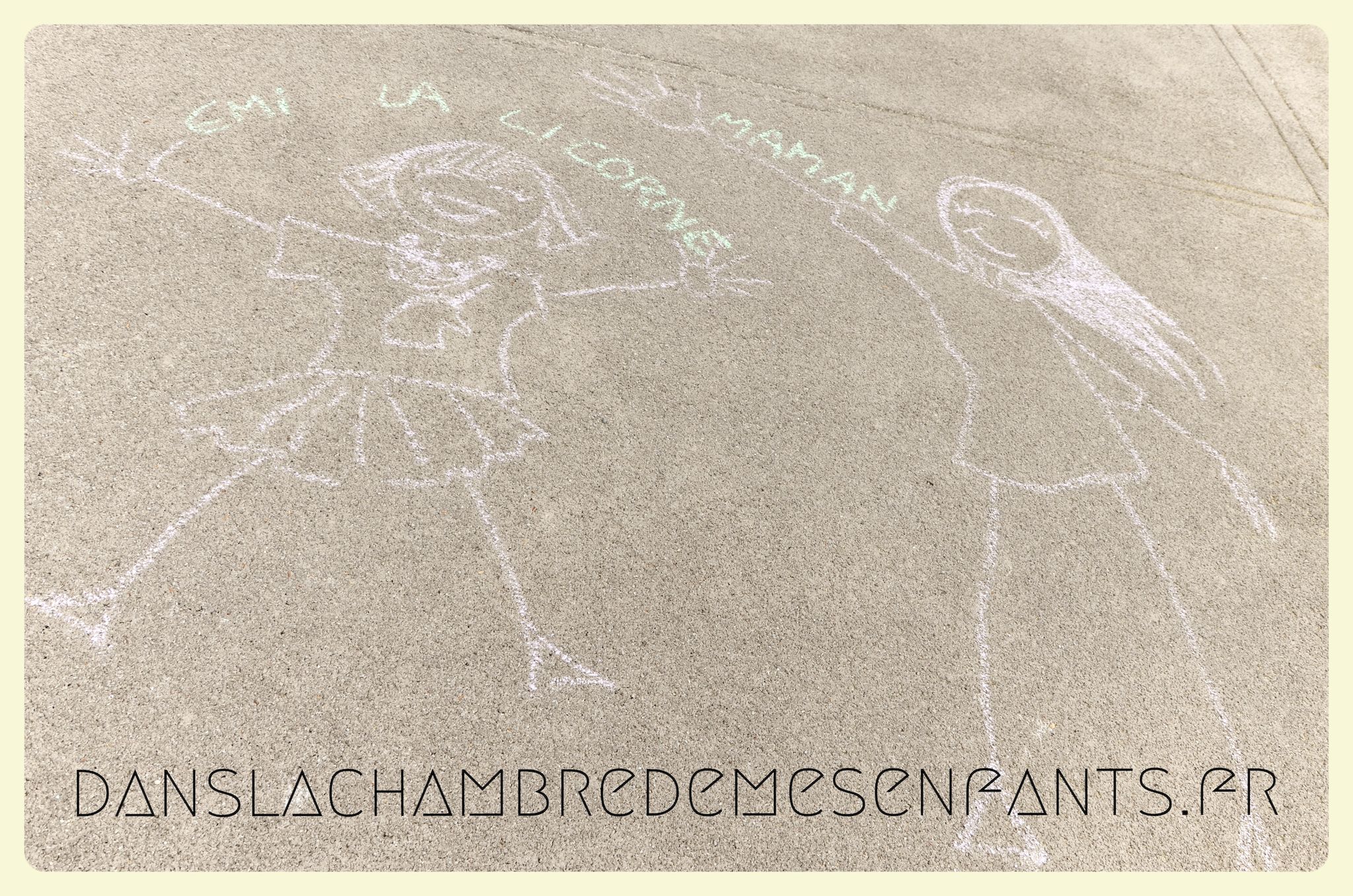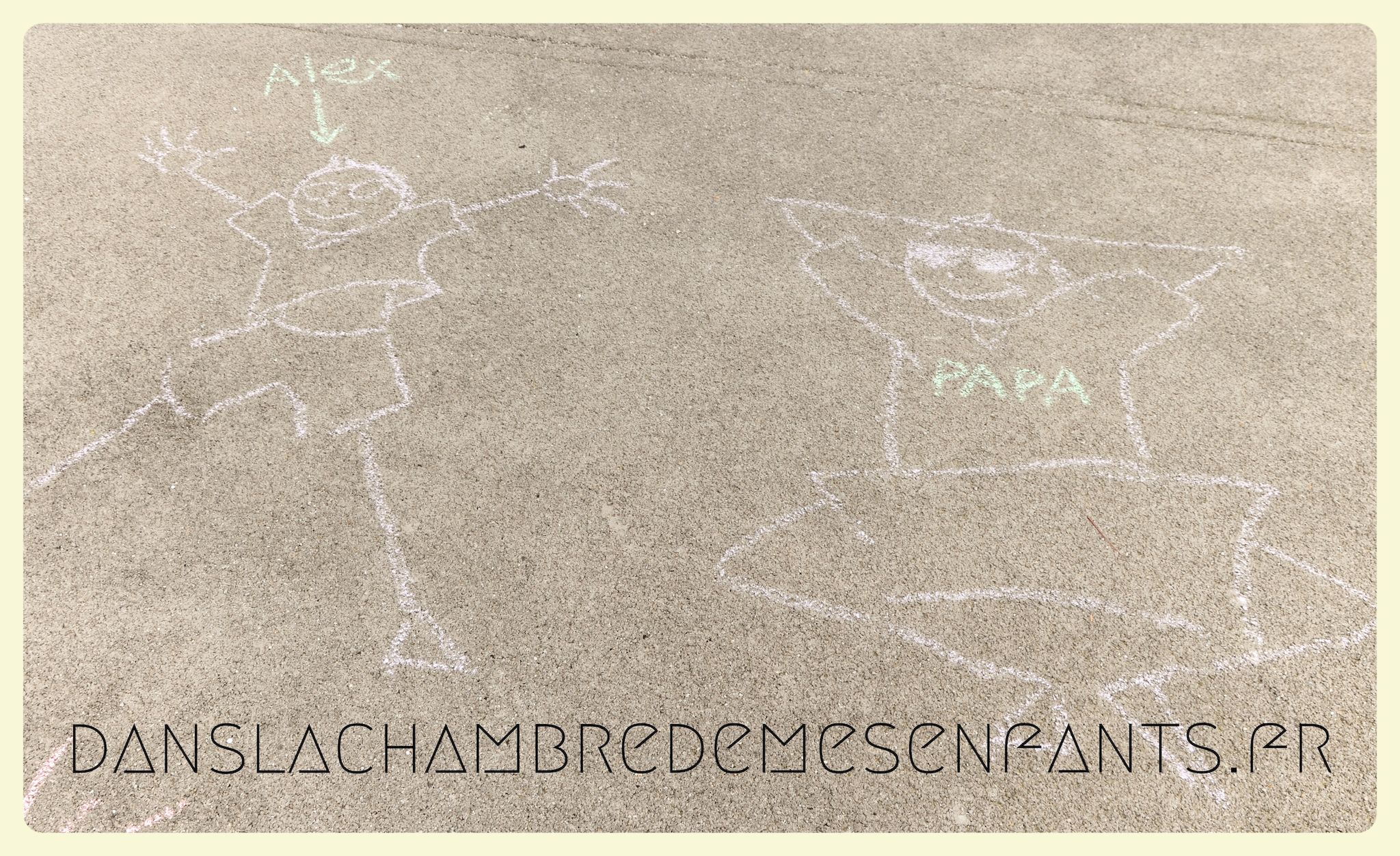 Pour l’anecdote : la préparation de l’image de couverture de cet article m’a donné l’idée d’en faire un message de bienvenue (en vacances) à Alex et son père. Emi a tellement été emballée qu’elle n’a pas voulu s’arrêter et elle a tenu à ce que j’improvise des portraits ce qui est toujours pratique avec de grosses craies bien entendu. Alors, voilà, je vous dévoile l’intégralité de l’œuvre… ressemblant n’est-ce-pas ?!